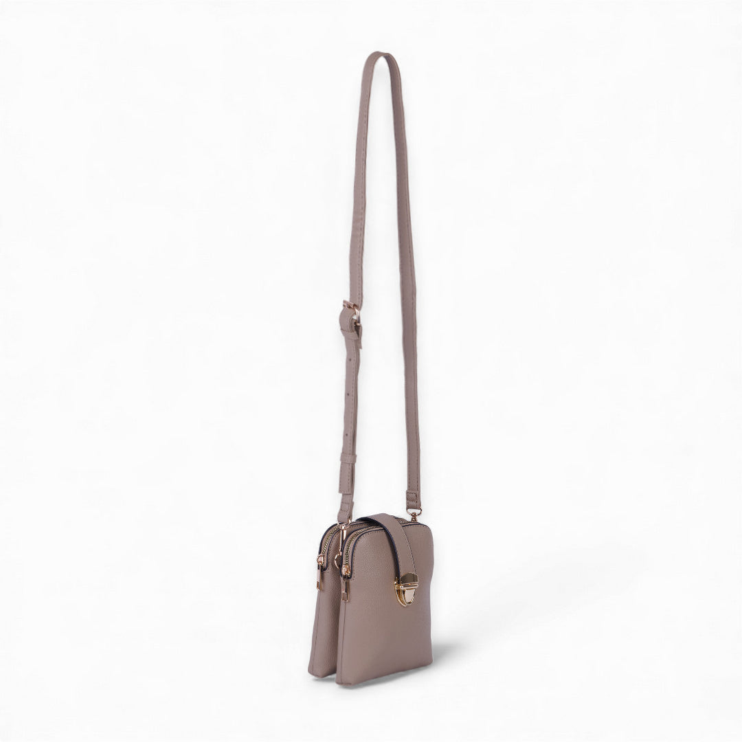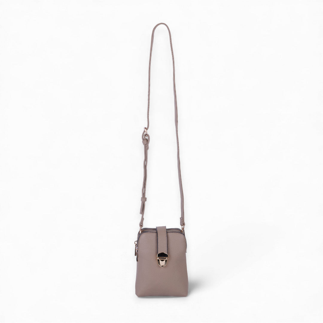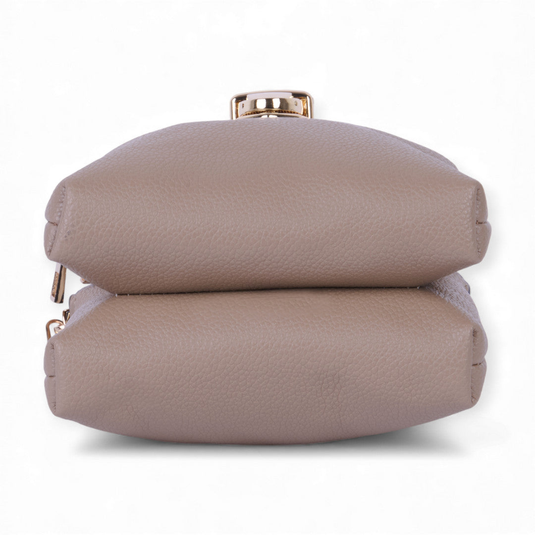 Bolso crossbody color beige con broche dorado y látigo decorativo, asa desmontable y diseño funcional para uso diario; moderno, elegante y combinable.