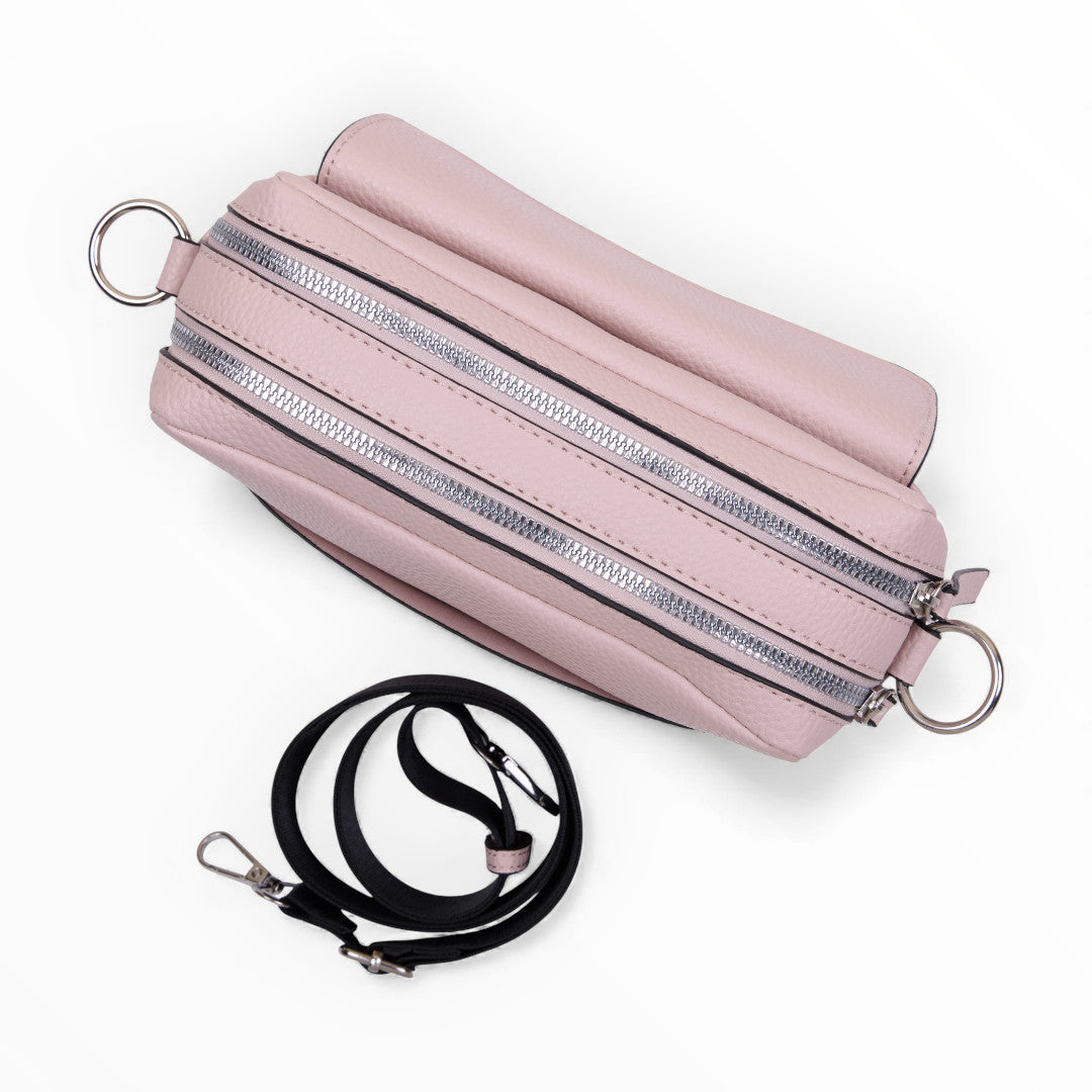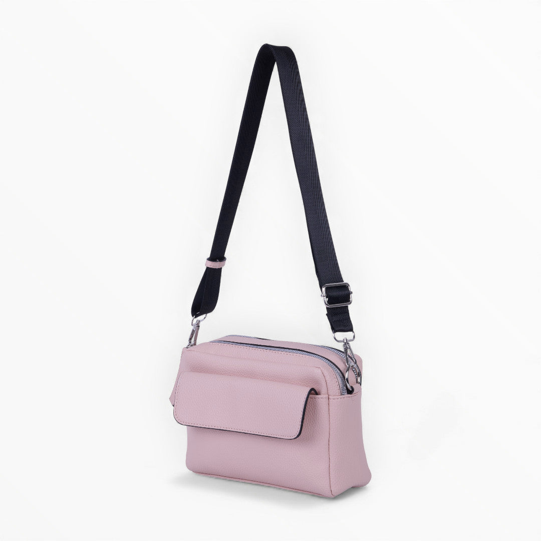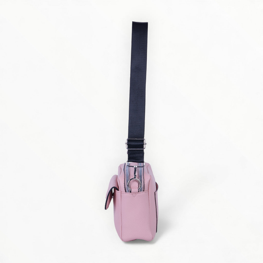 Bolso crossbody rosa con asa textil negra y correa desmontable; moderno, práctico y perfecto para looks casuales.