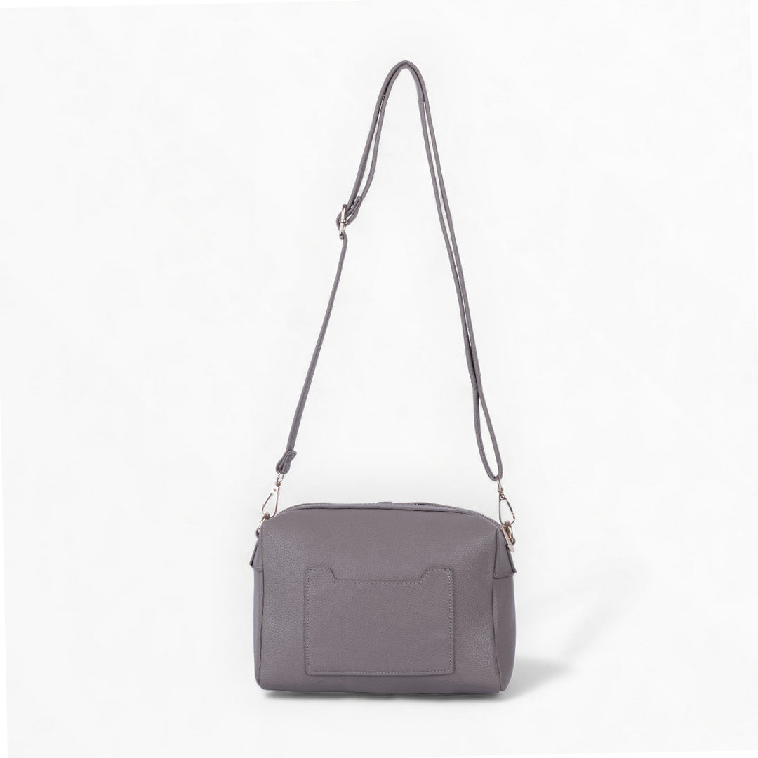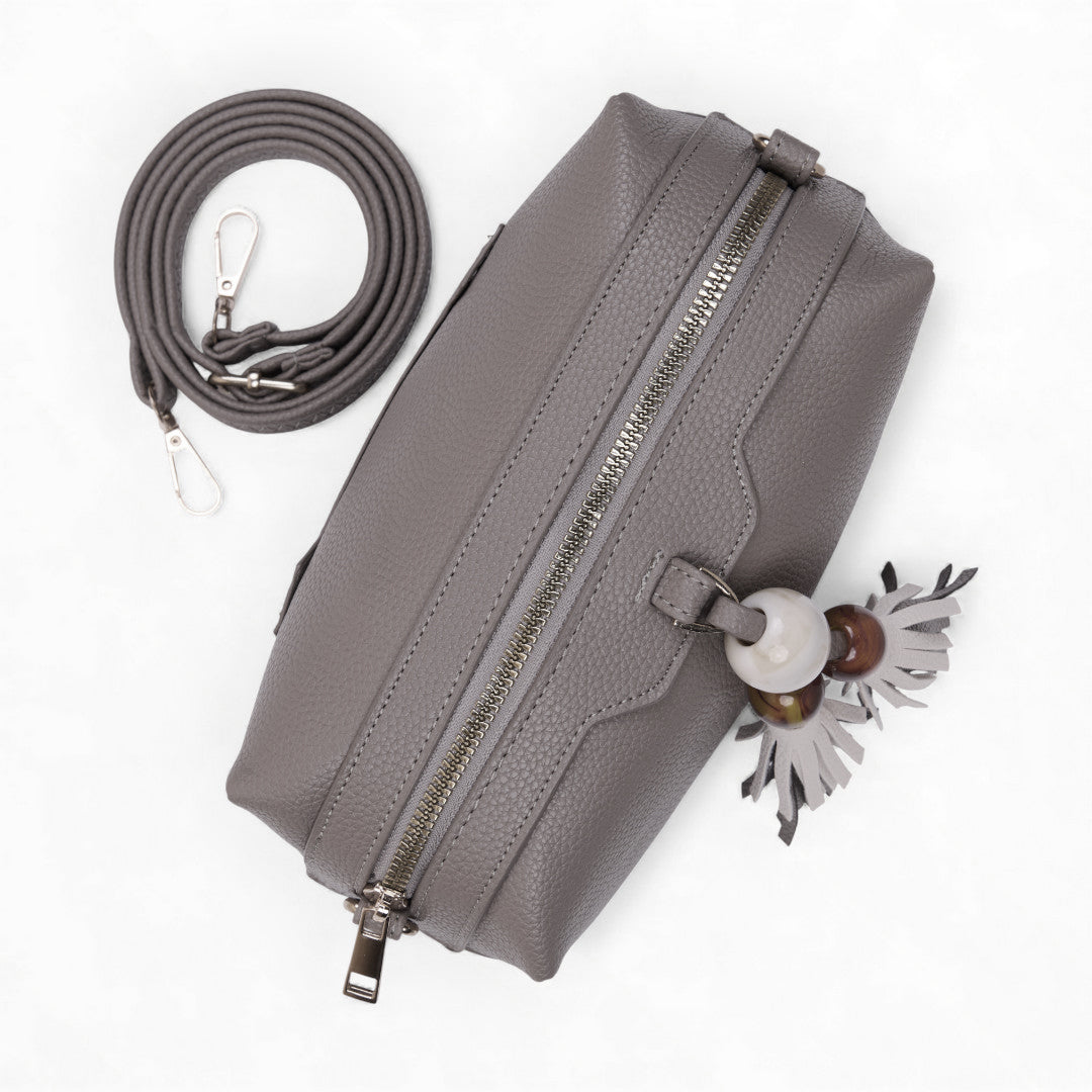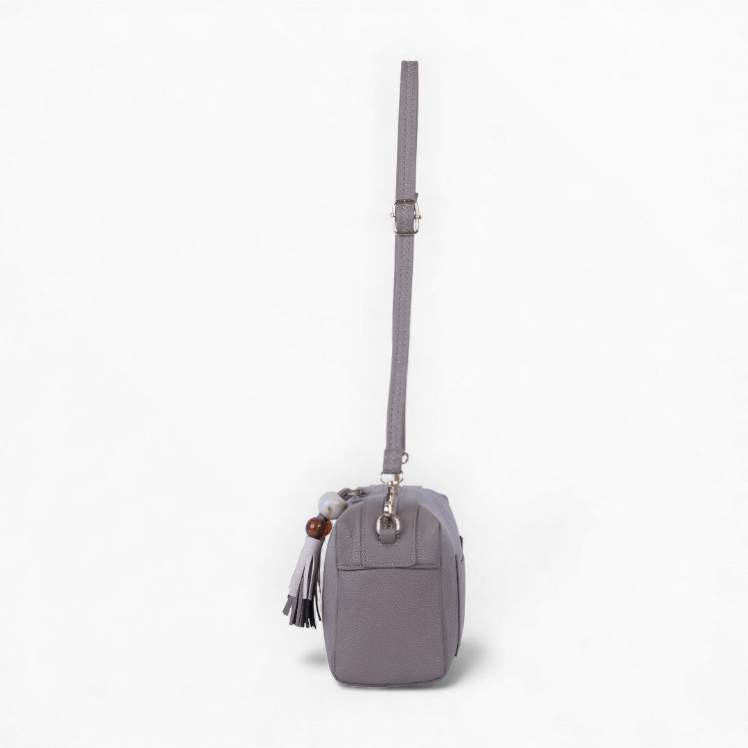 Bolso crossbody gris con borla decorativa y asa desmontable; moderno, práctico y perfecto para uso diario.