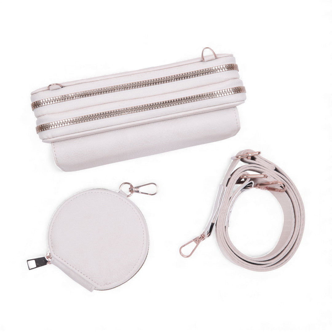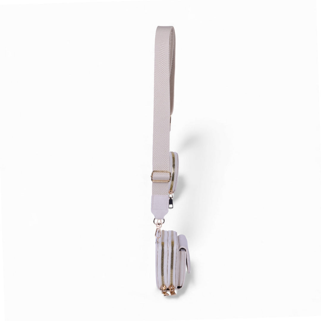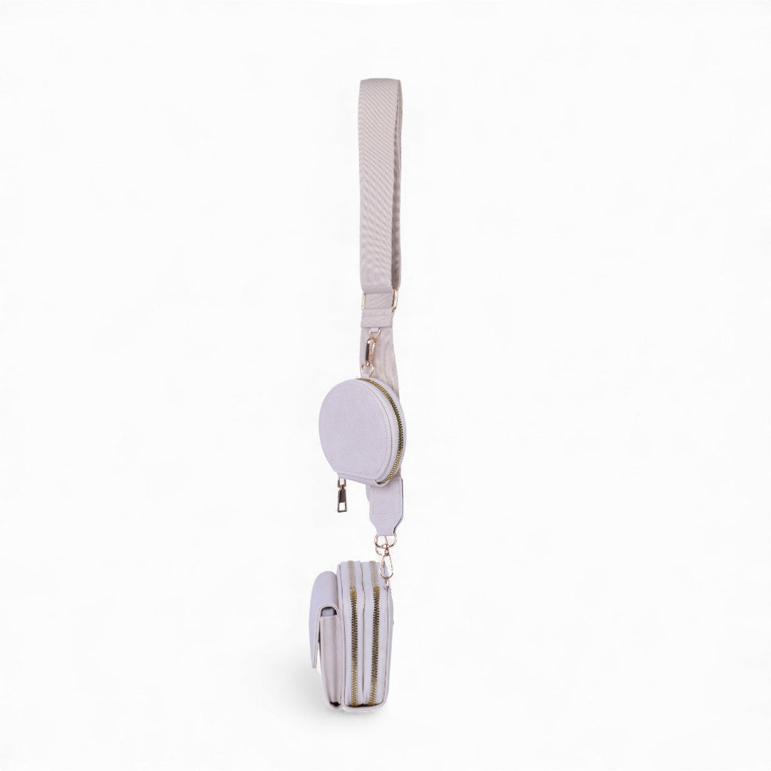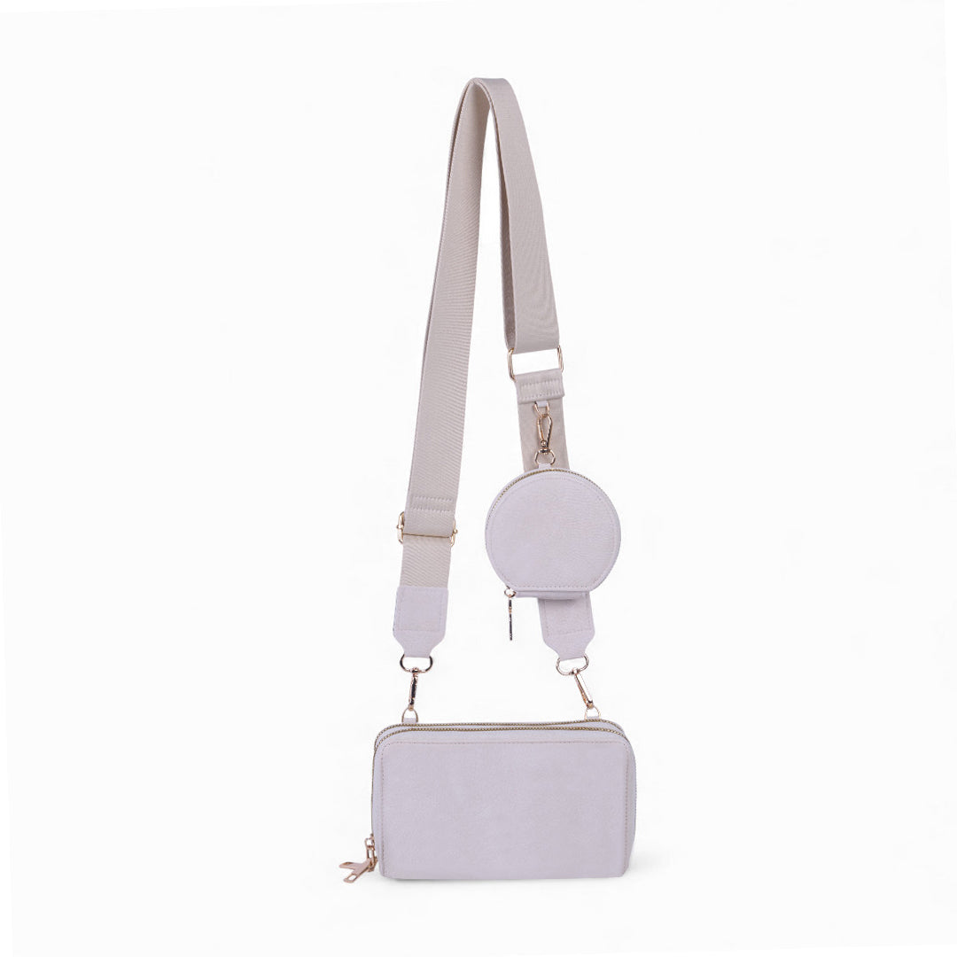 Bolso crossbody color ivory con monedero extraíble redondo, diseño práctico y funcional para uso diario; moderno y combinable. Incluye correa desmontable.