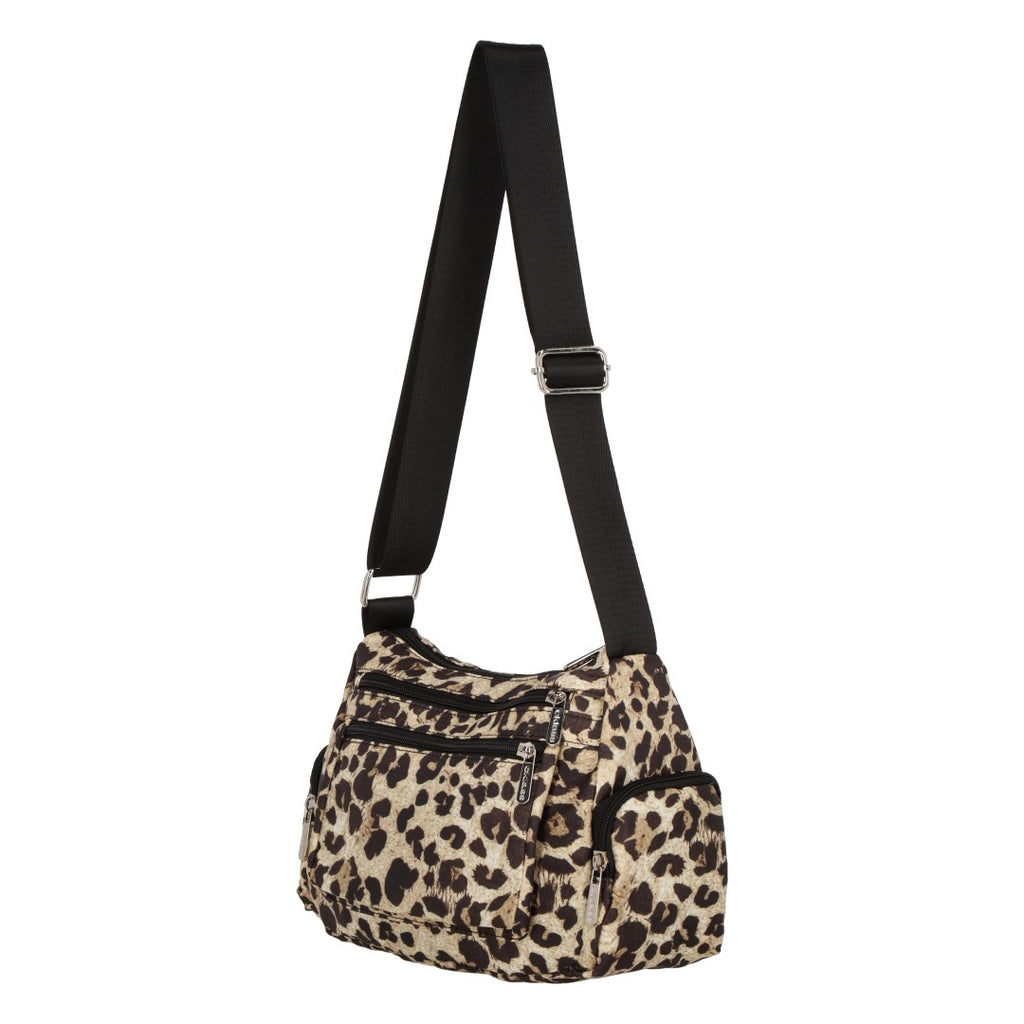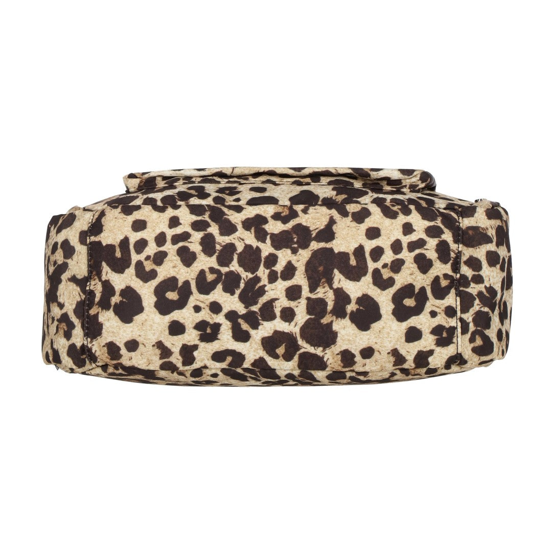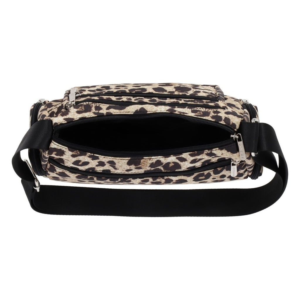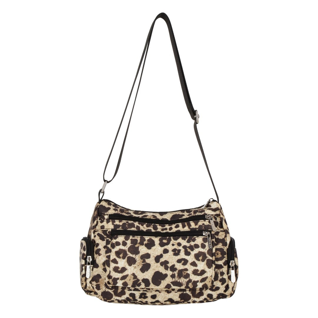 Bolso crossbody con estampado animal print tipo leopardo, 5 compartimentos externos y correa ajustable color negro; accesorio moderno y funcional.