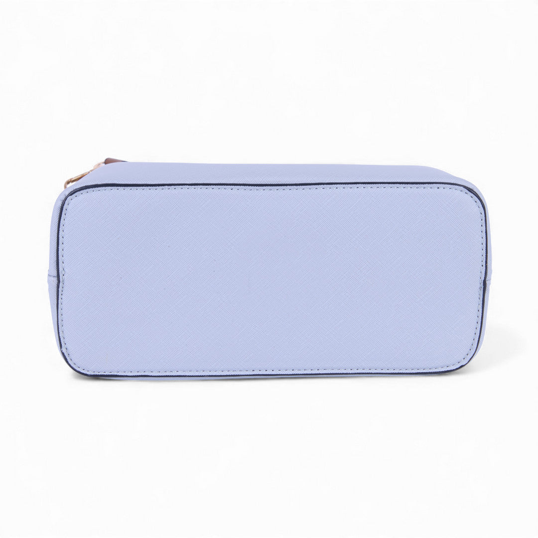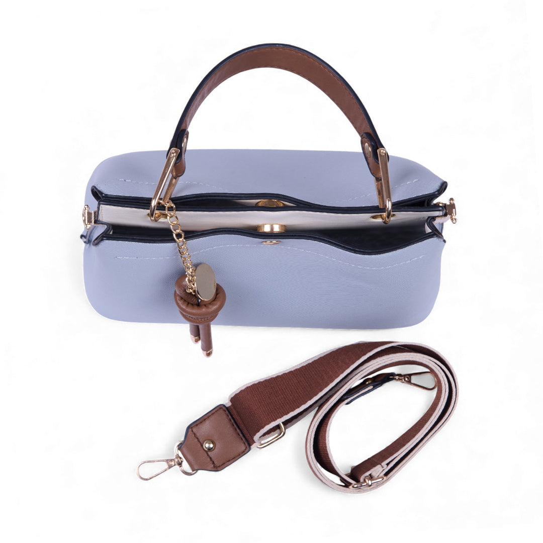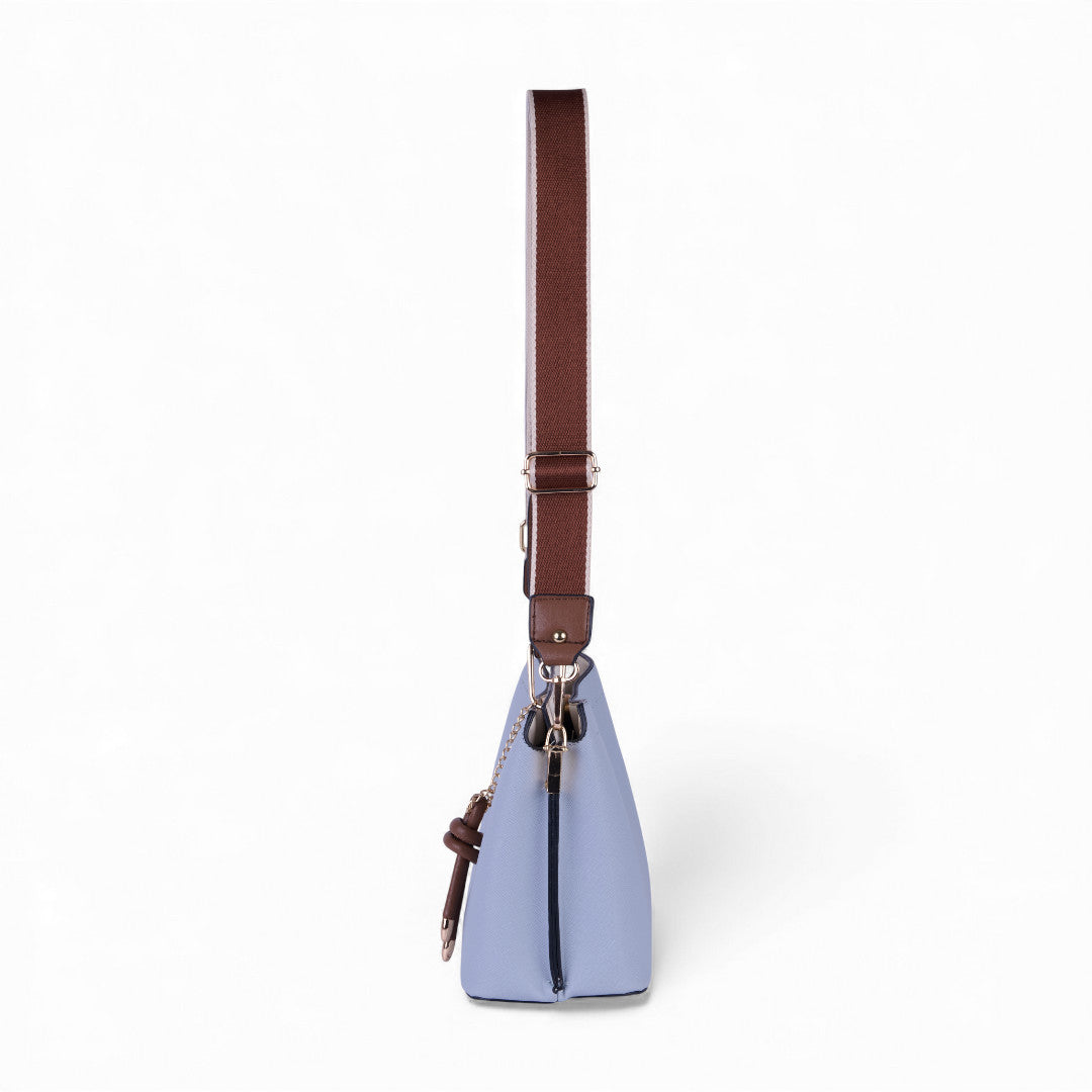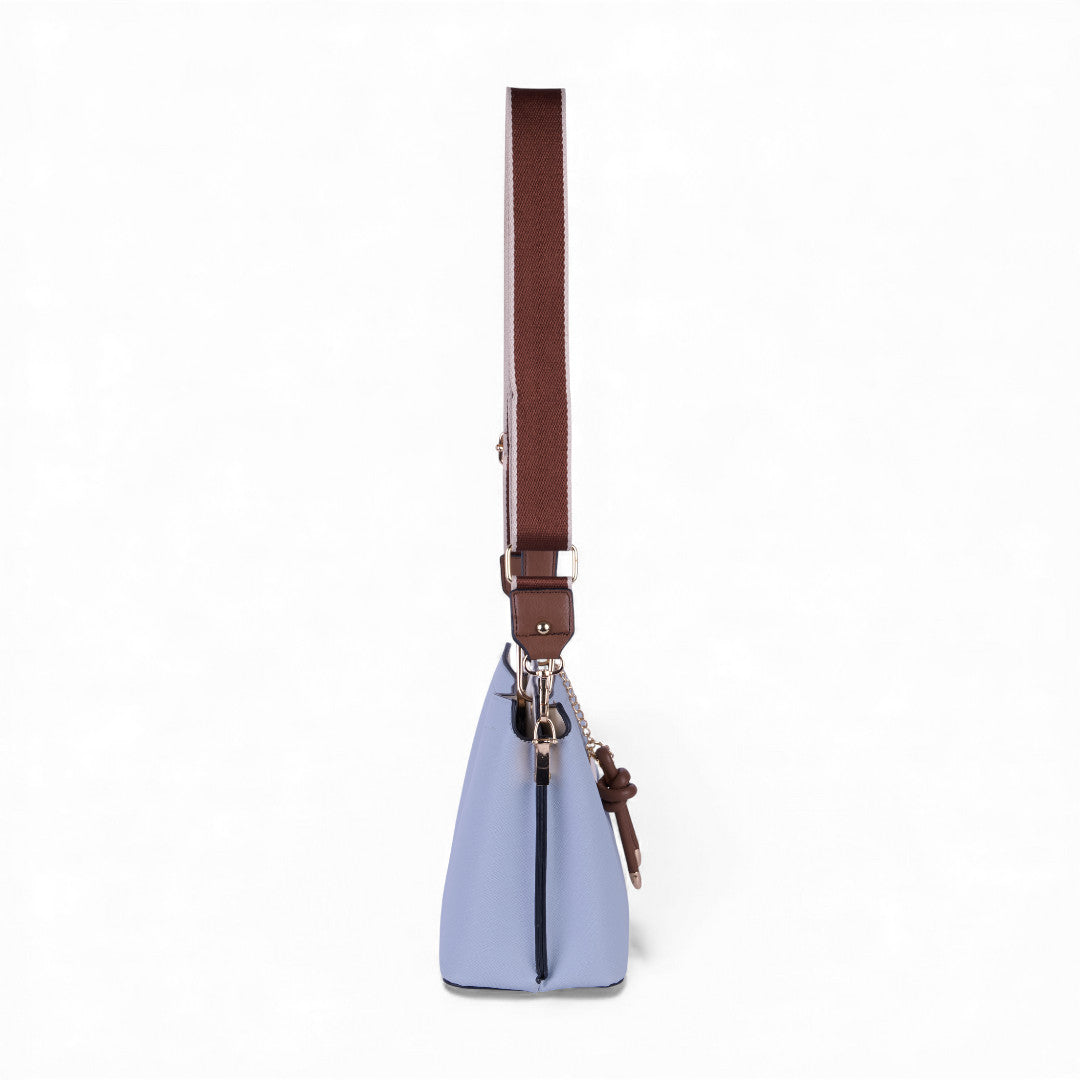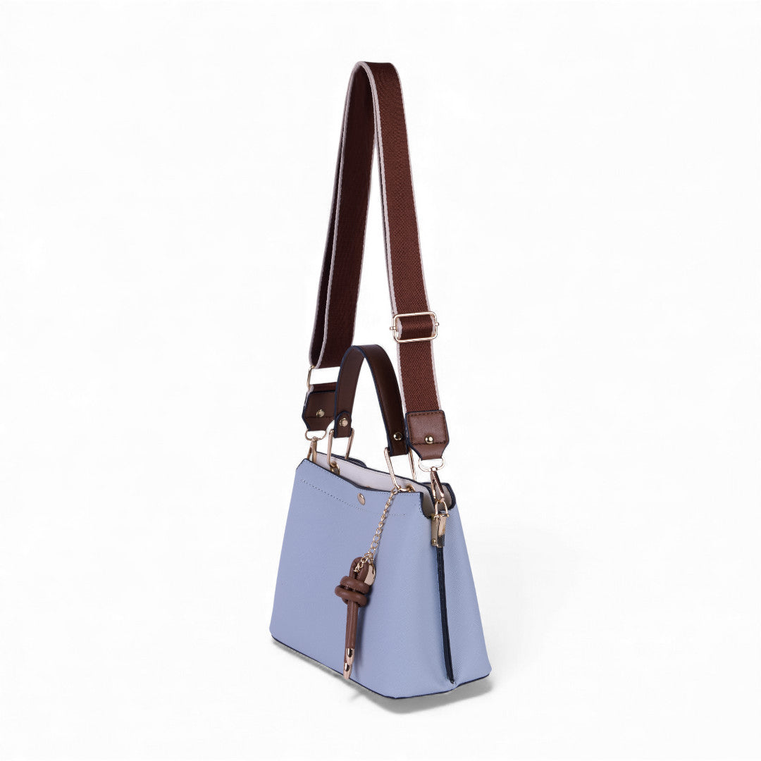 Bolso crossbody multicolor con asa desmontable y llavero café decorativo; ligero, moderno y práctico para el día a día.