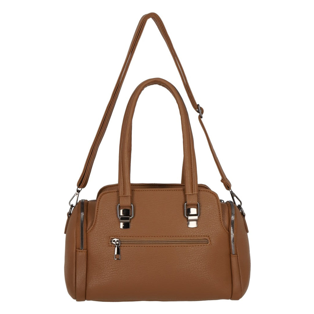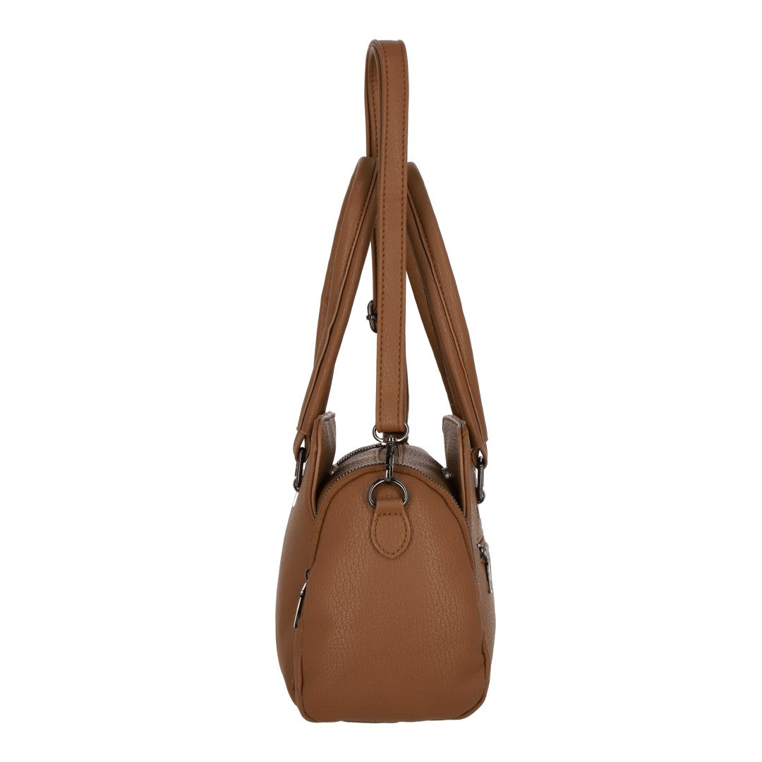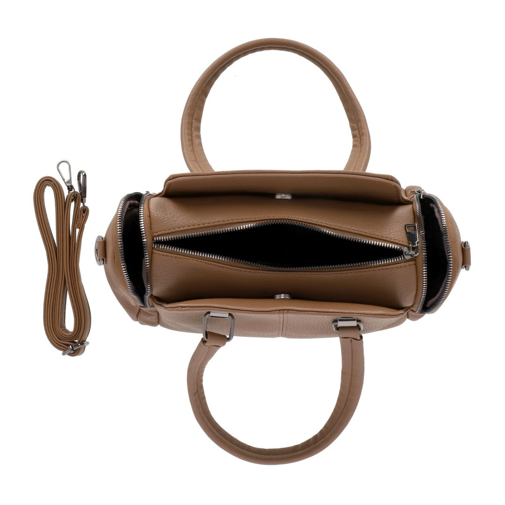 Bolso tipo bowling con asa desmontable y herrajes en níquel negro; cuenta con 6 compartimentos externos para máxima organización.