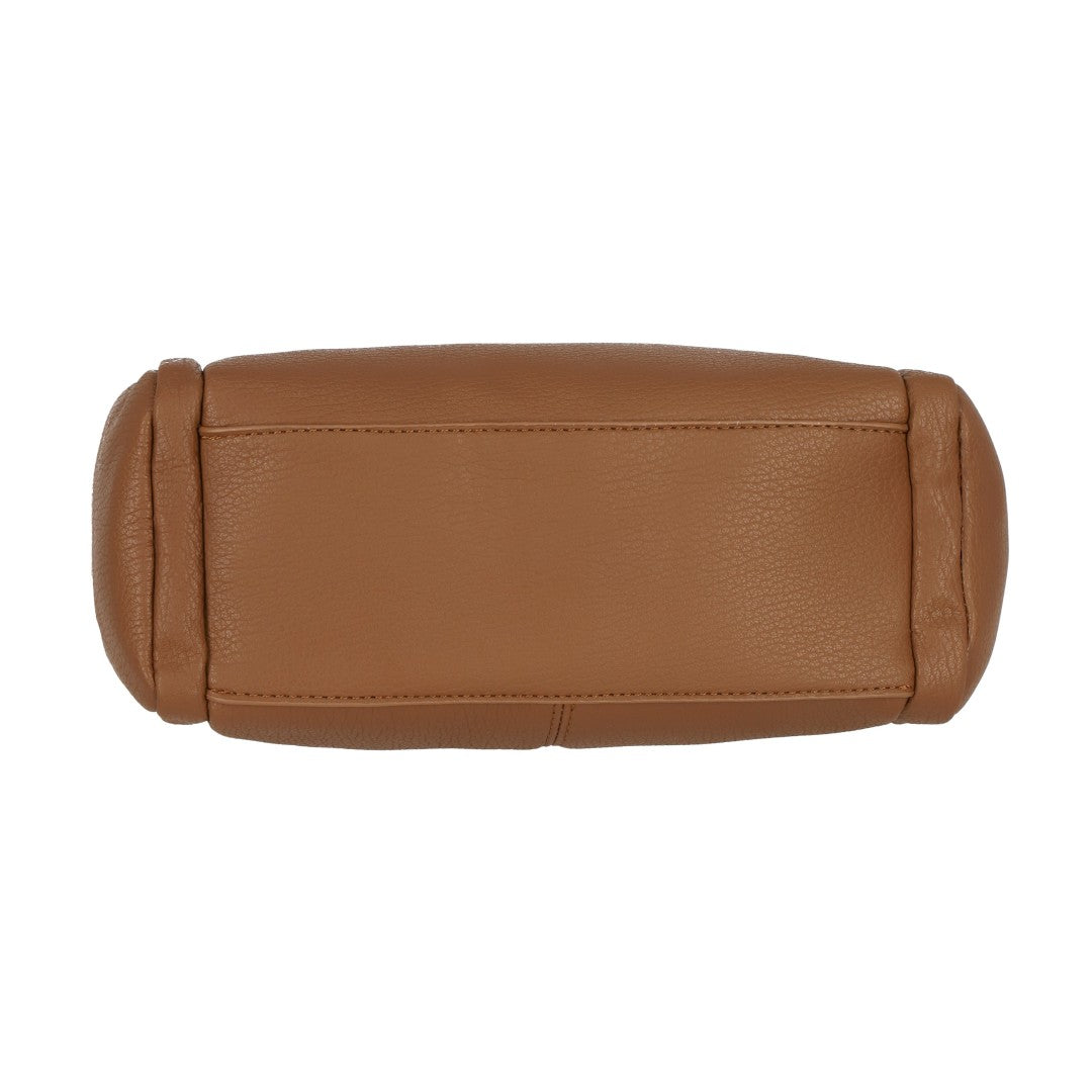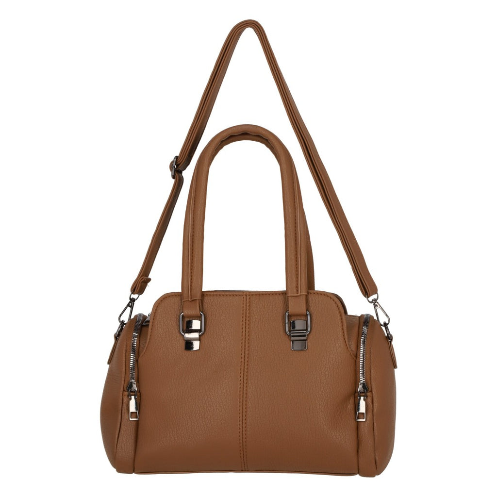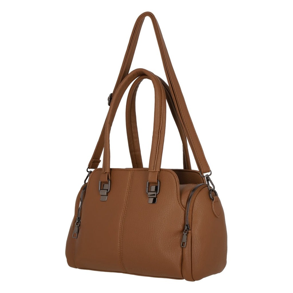 Bolso tipo bowling con asa desmontable y herrajes en níquel negro; cuenta con 6 compartimentos externos para máxima organización.