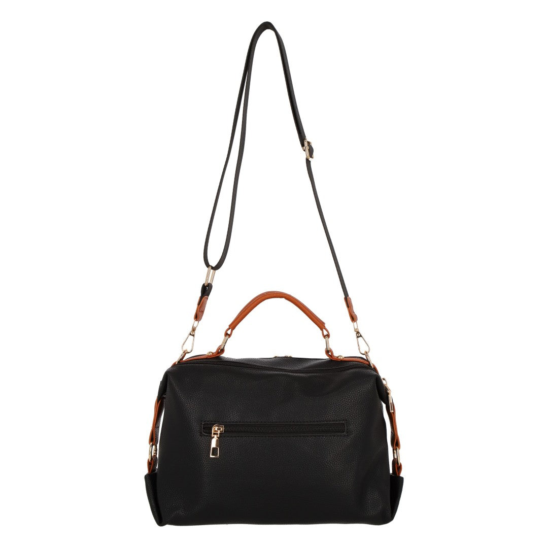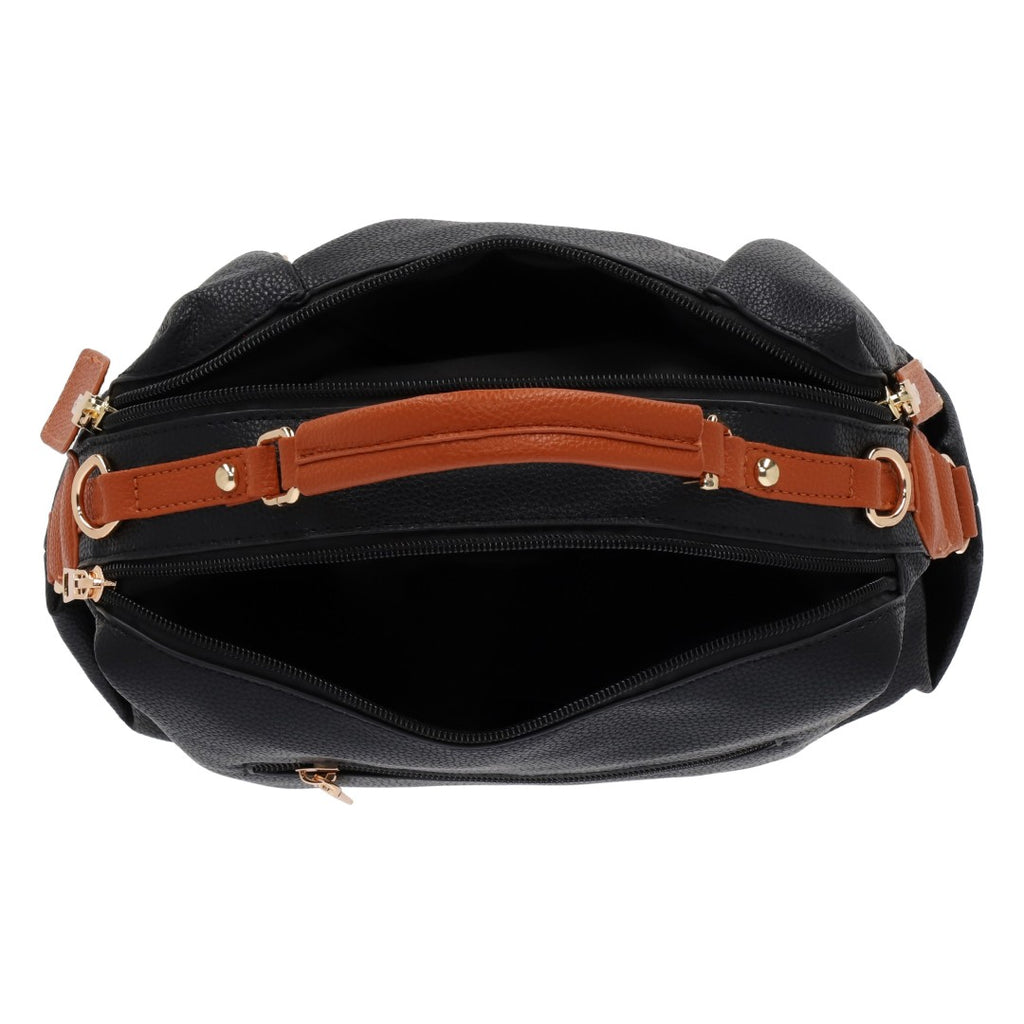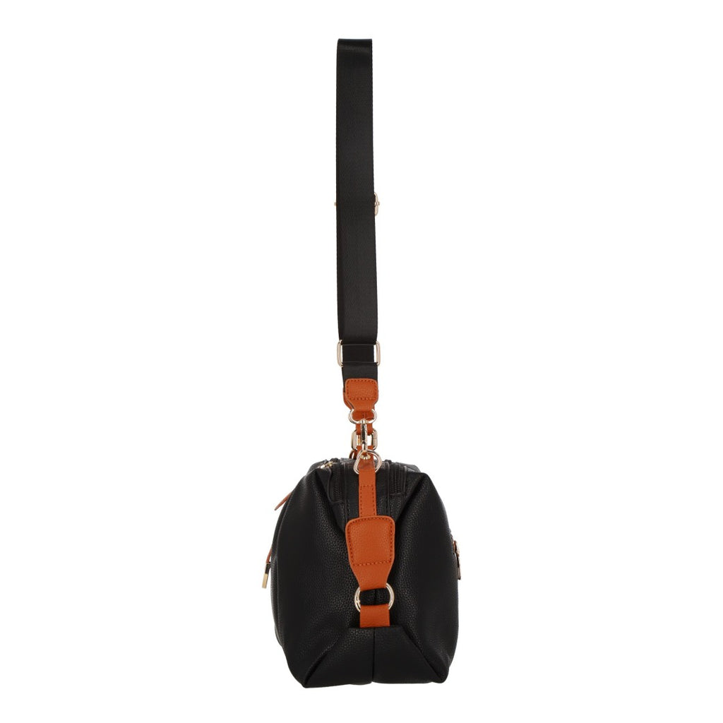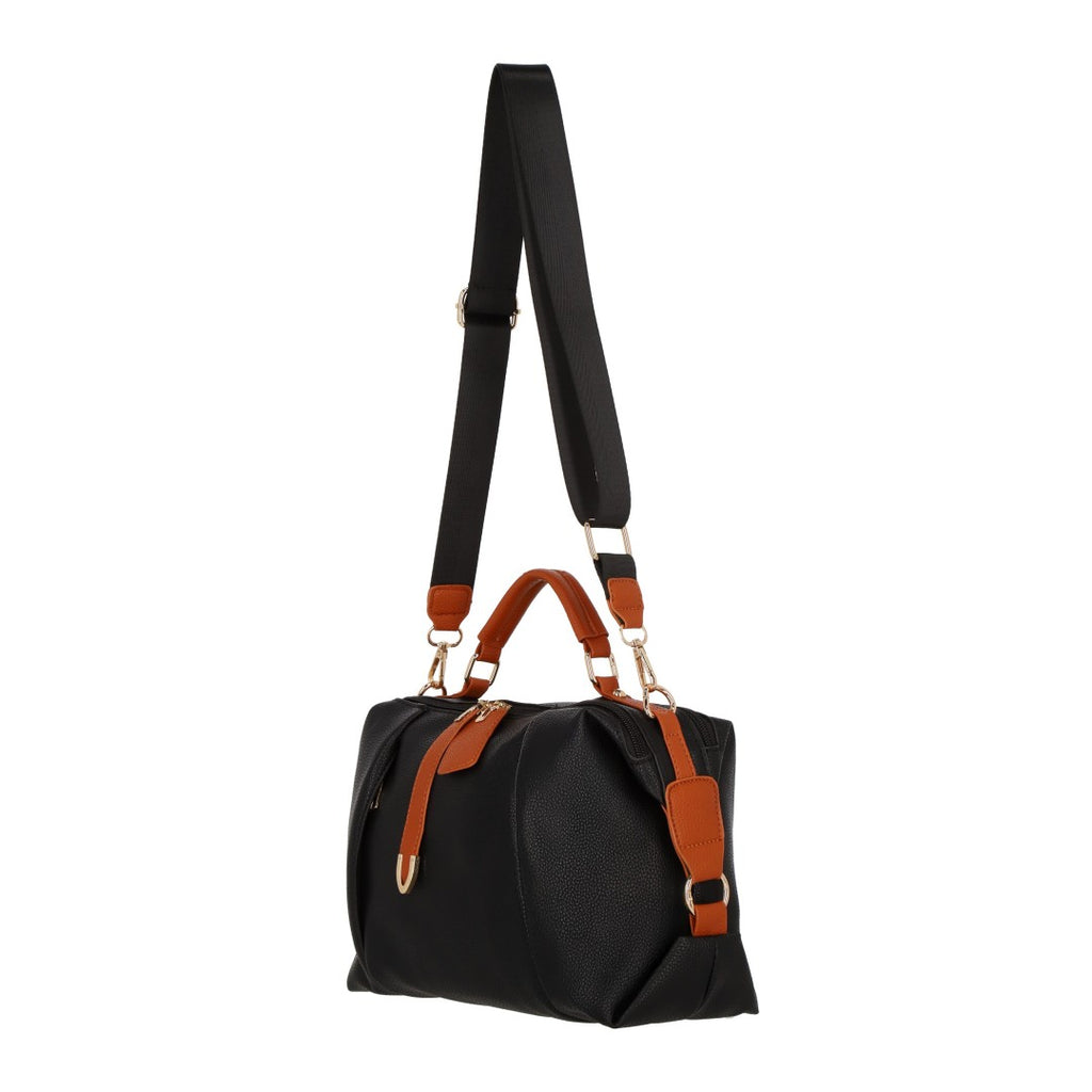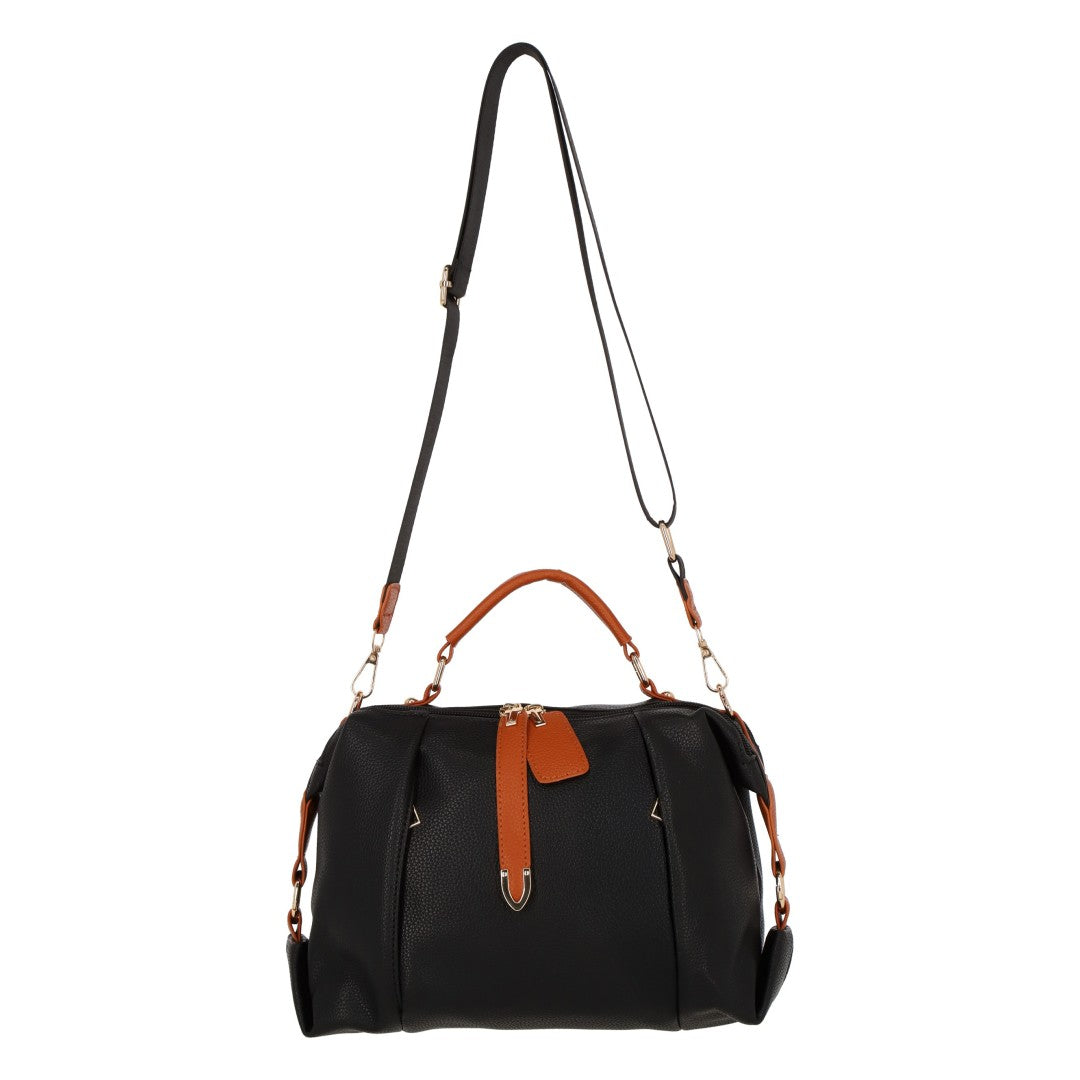 Bolso tipo bowling color negro con asa larga desmontable y detalles en color camel; diseño elegante y funcional para cualquier ocasión.