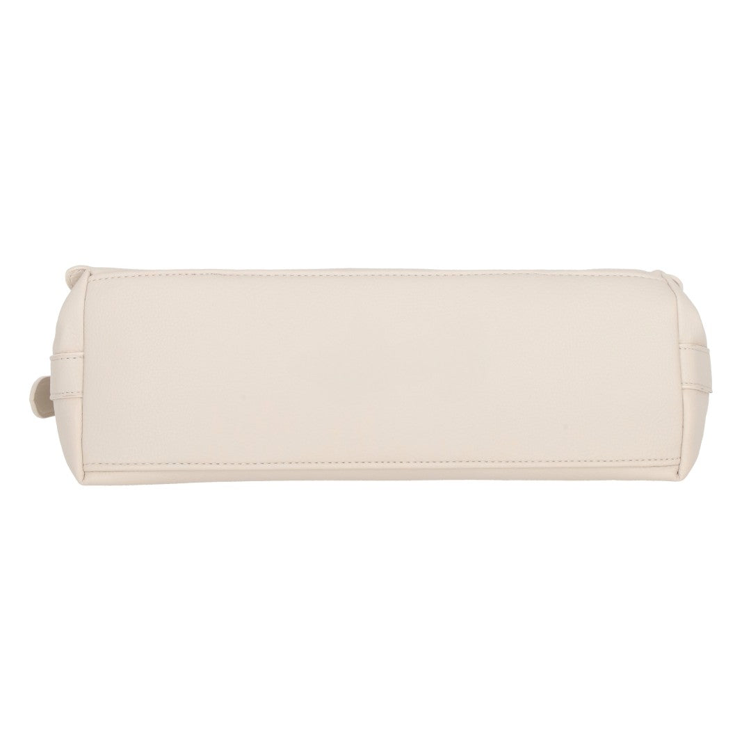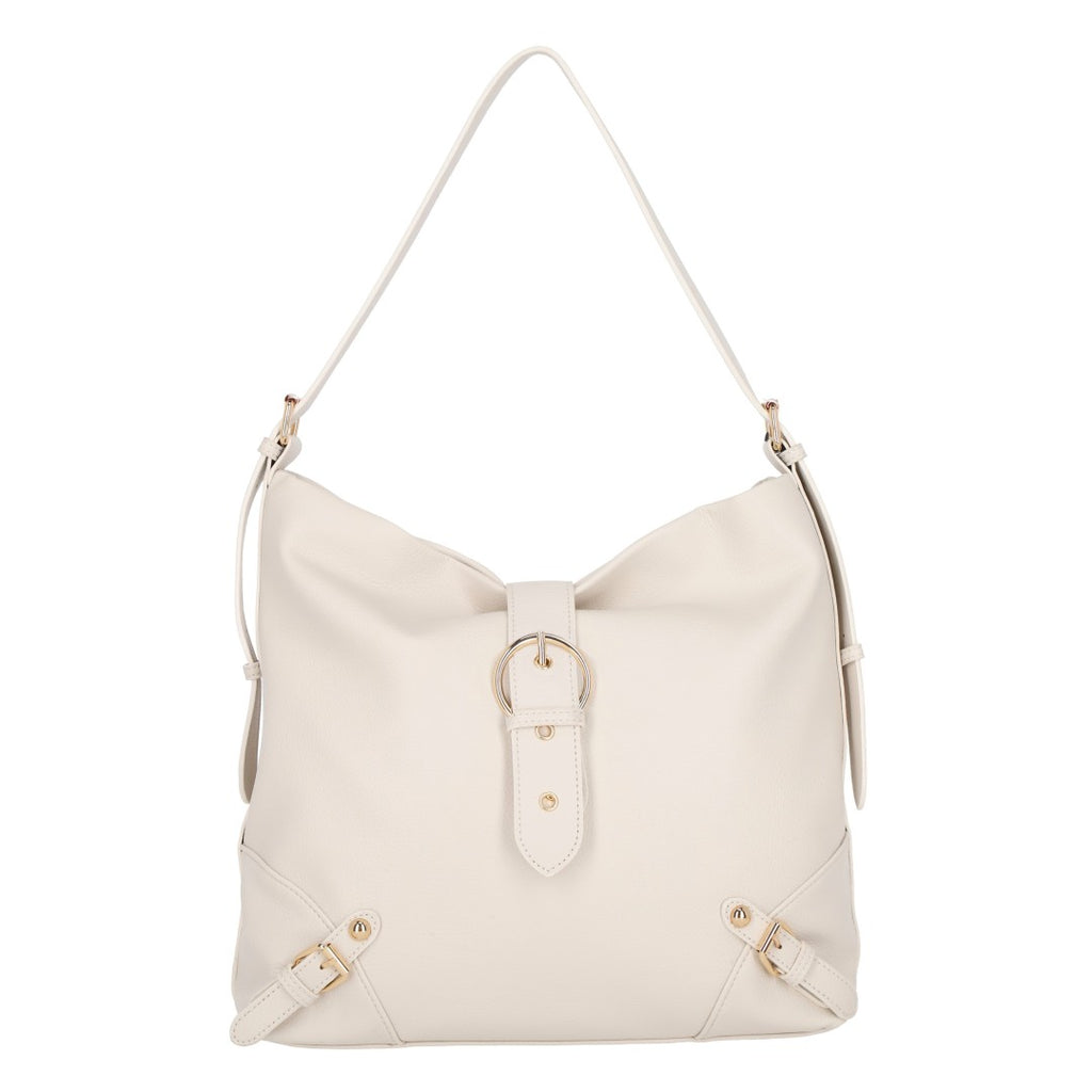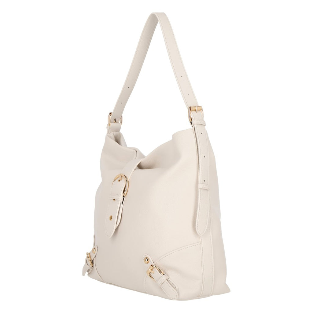Bolso tipo tote color ivory con herrajes dorados y hebilla en látigo ajustable; diseño elegante y espacioso para uso diario.