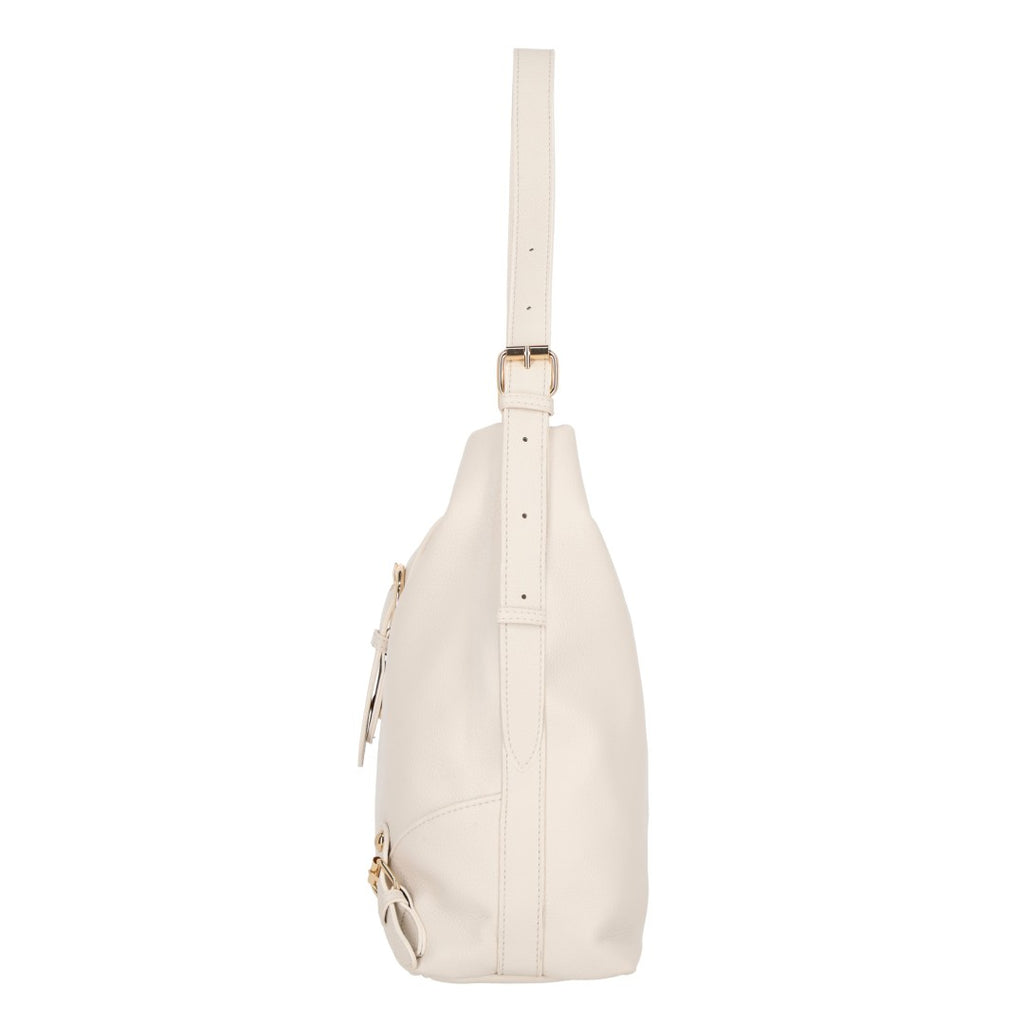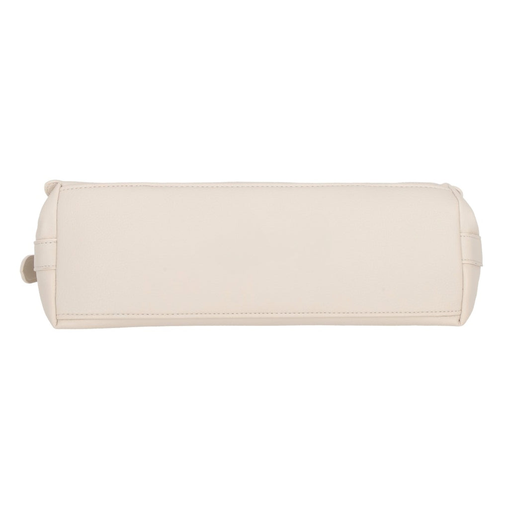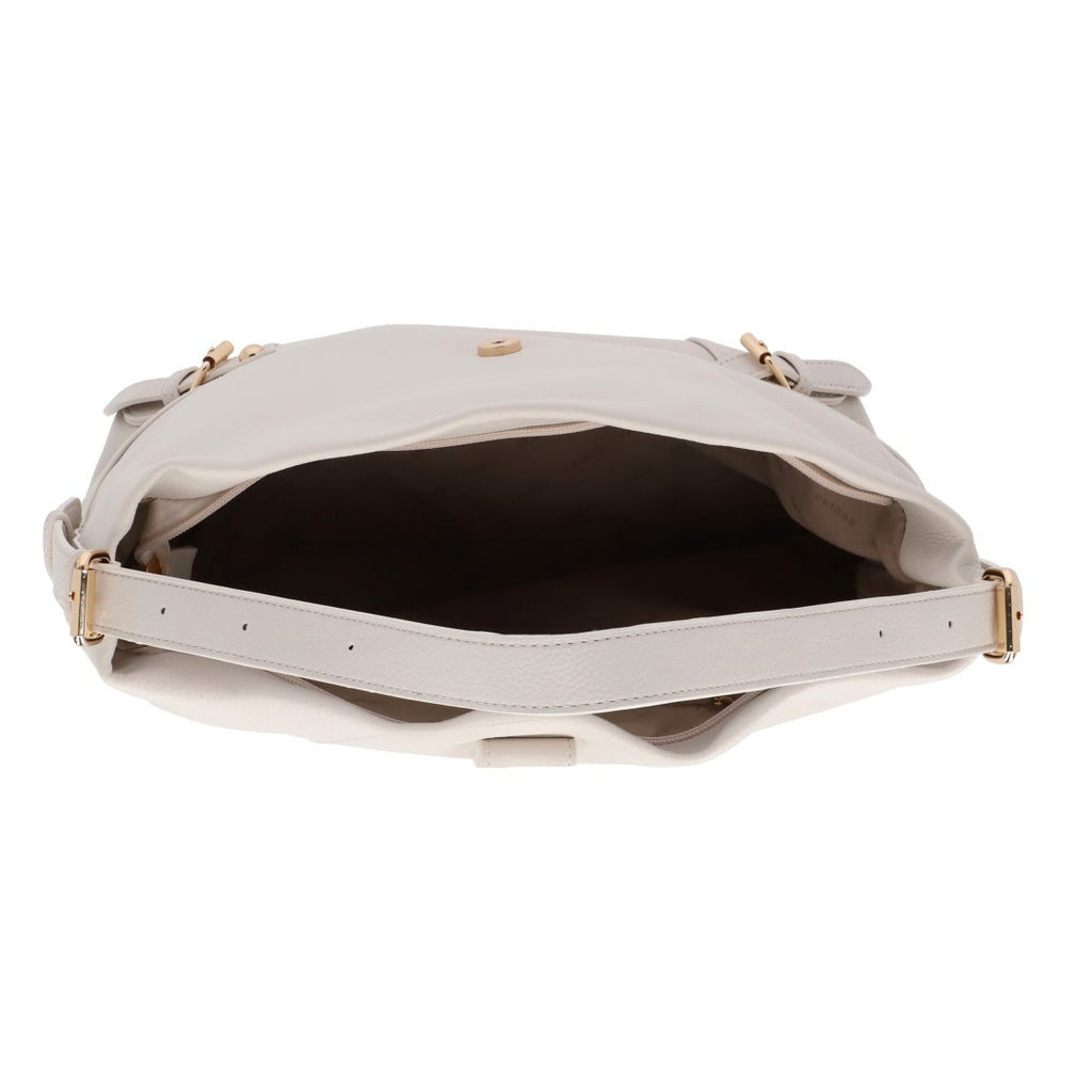 Bolso tipo tote color ivory con herrajes dorados y hebilla en látigo ajustable; diseño elegante y espacioso para uso diario.