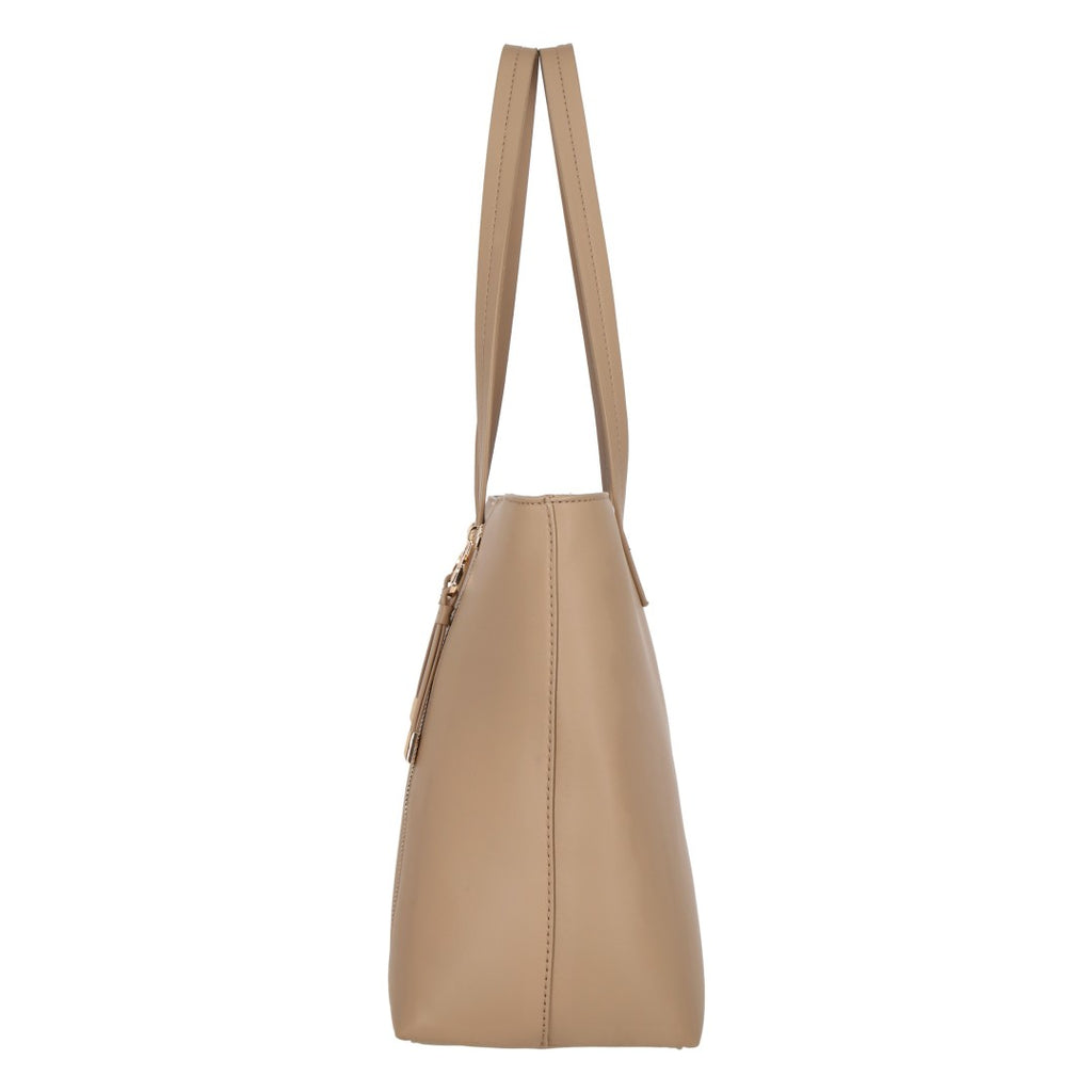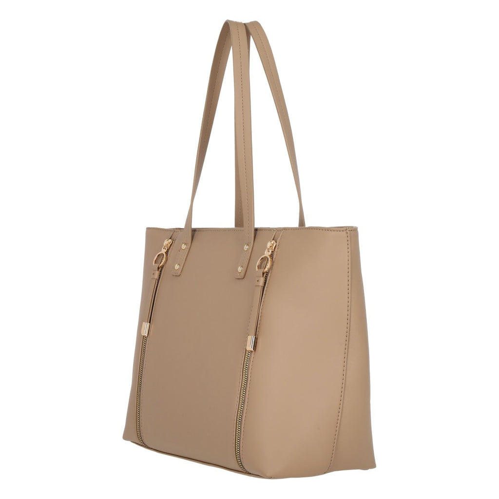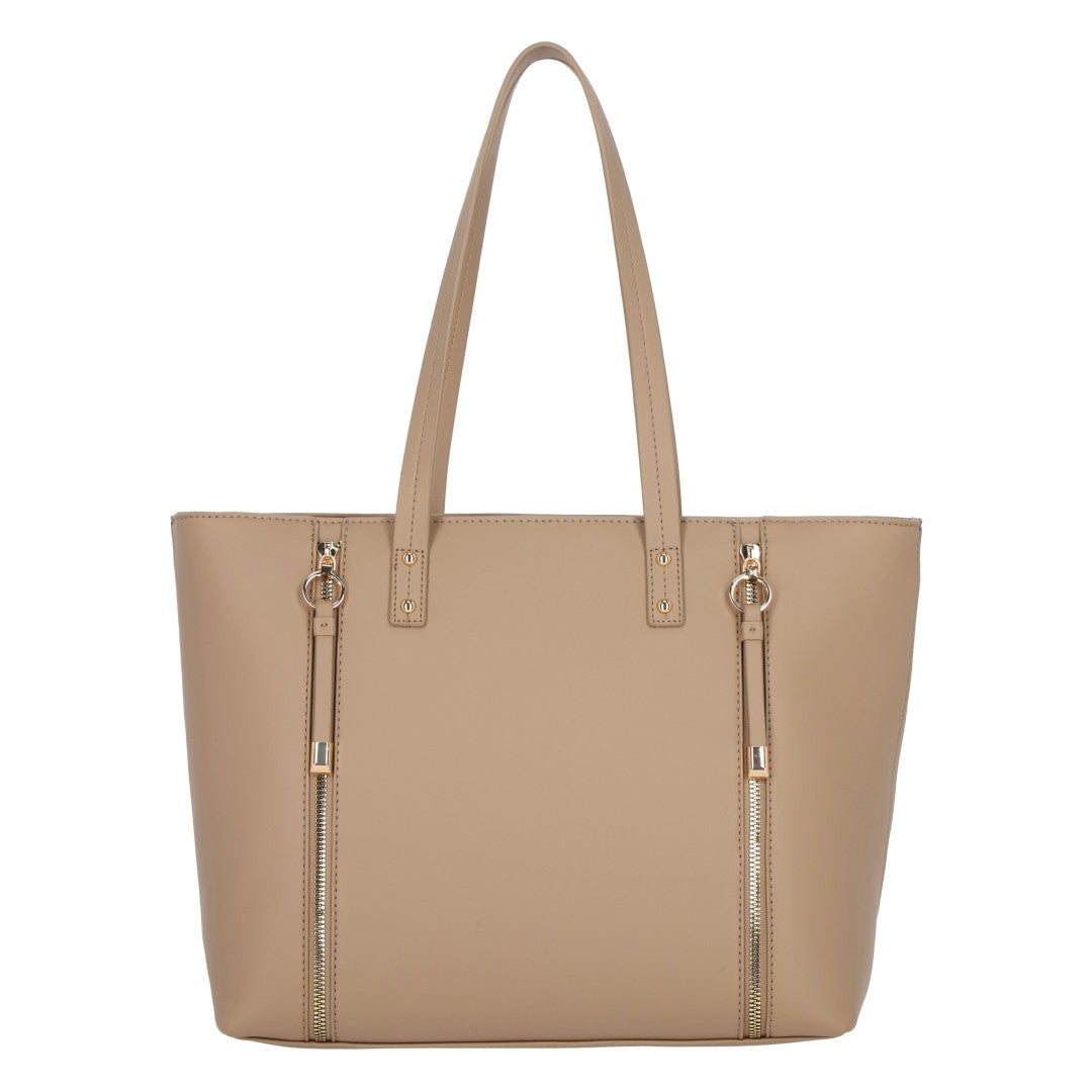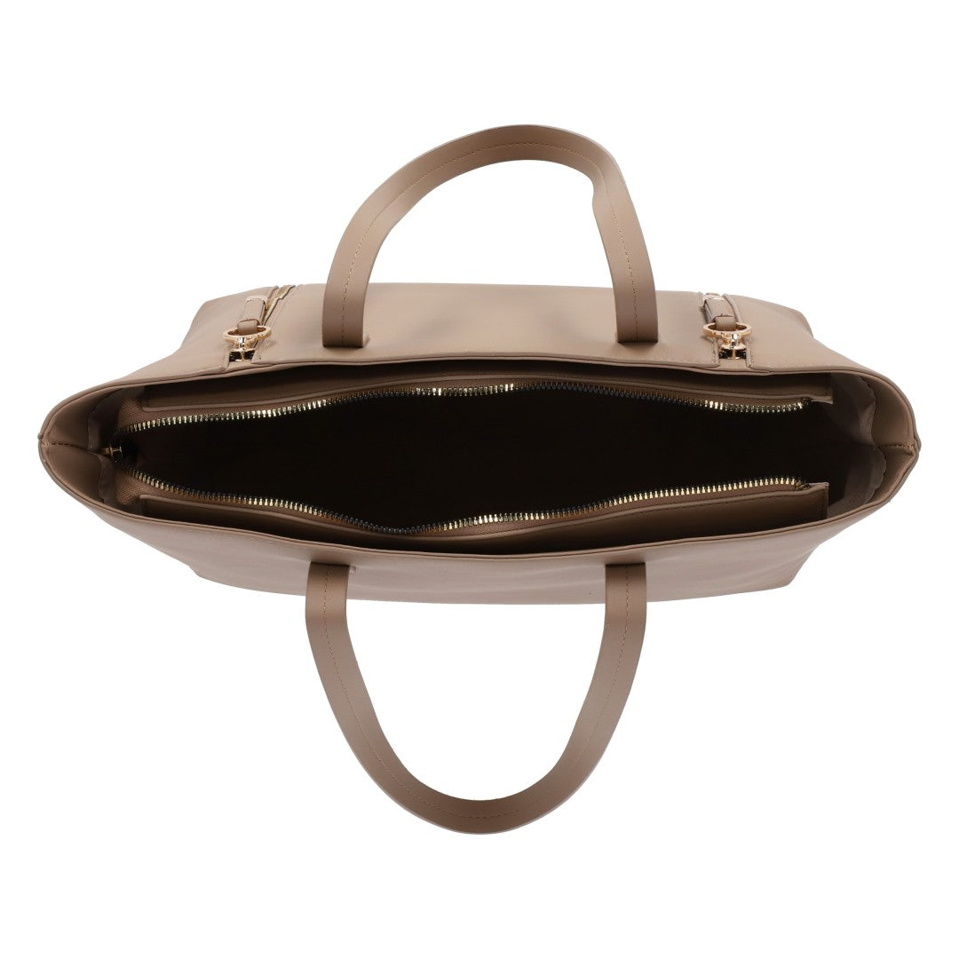 Bolso tipo tote con diseño moderno y funcional, ideal para complementar cualquier look. Presenta dos cierres decorativos en la pala frontal que aportan un toque distintivo y elegante. Su estructura amplia permite llevar todos tus esenciales con comodidad y estilo.