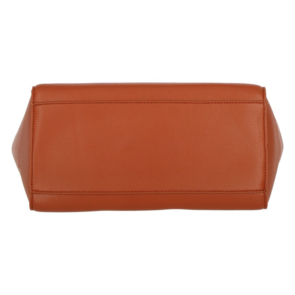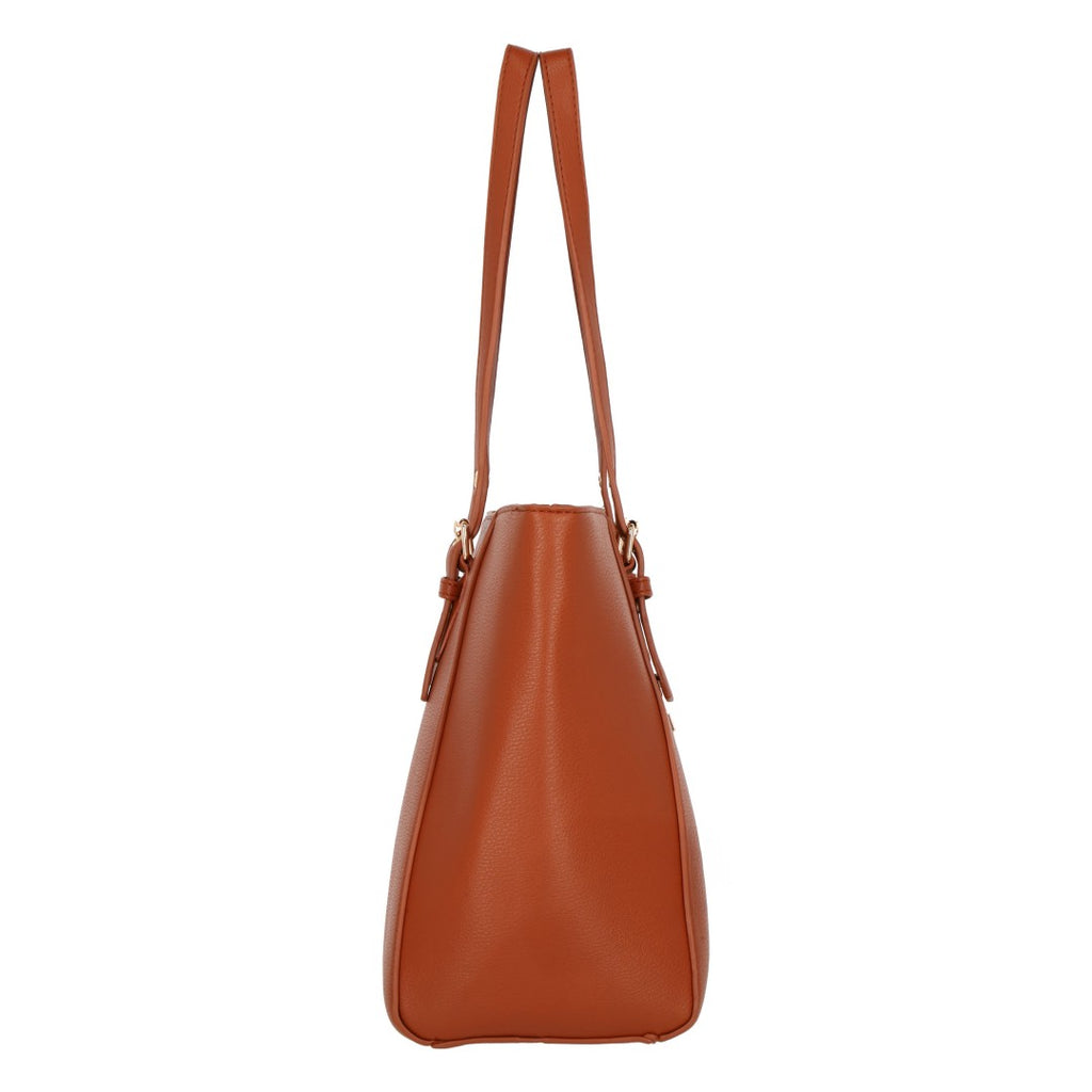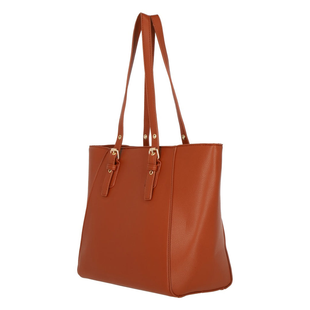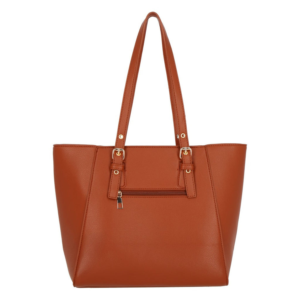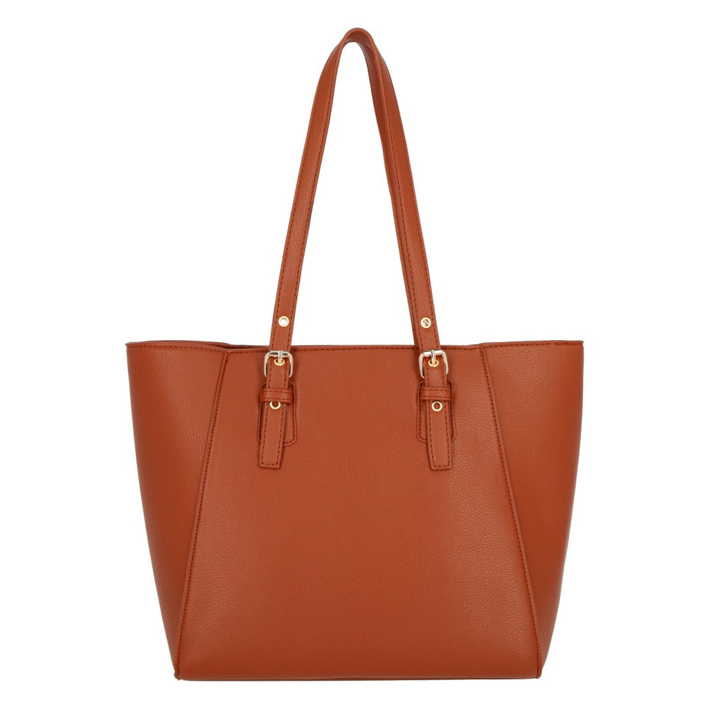 Bolso tote color café con detalle de hebillas ajustables en asas; accesorio funcional y sofisticado para uso diario.