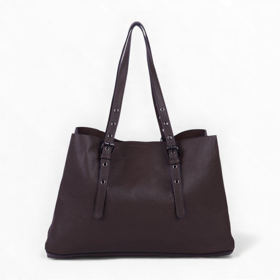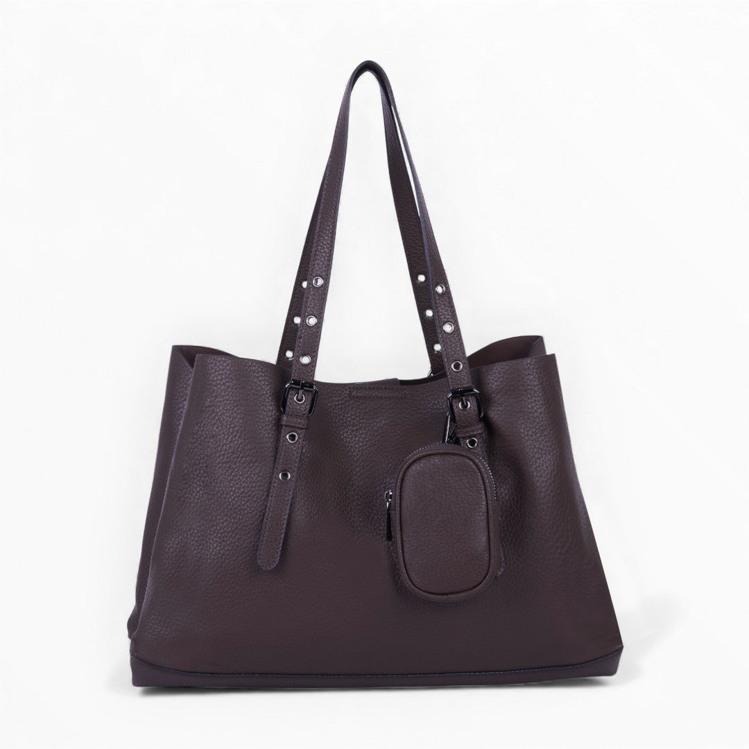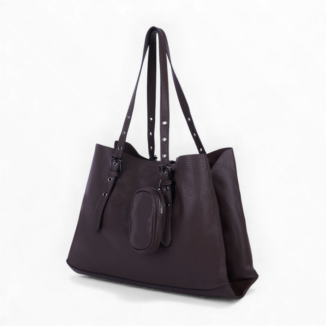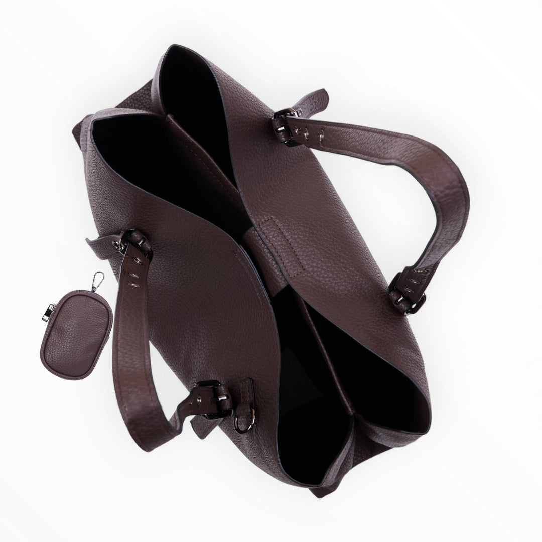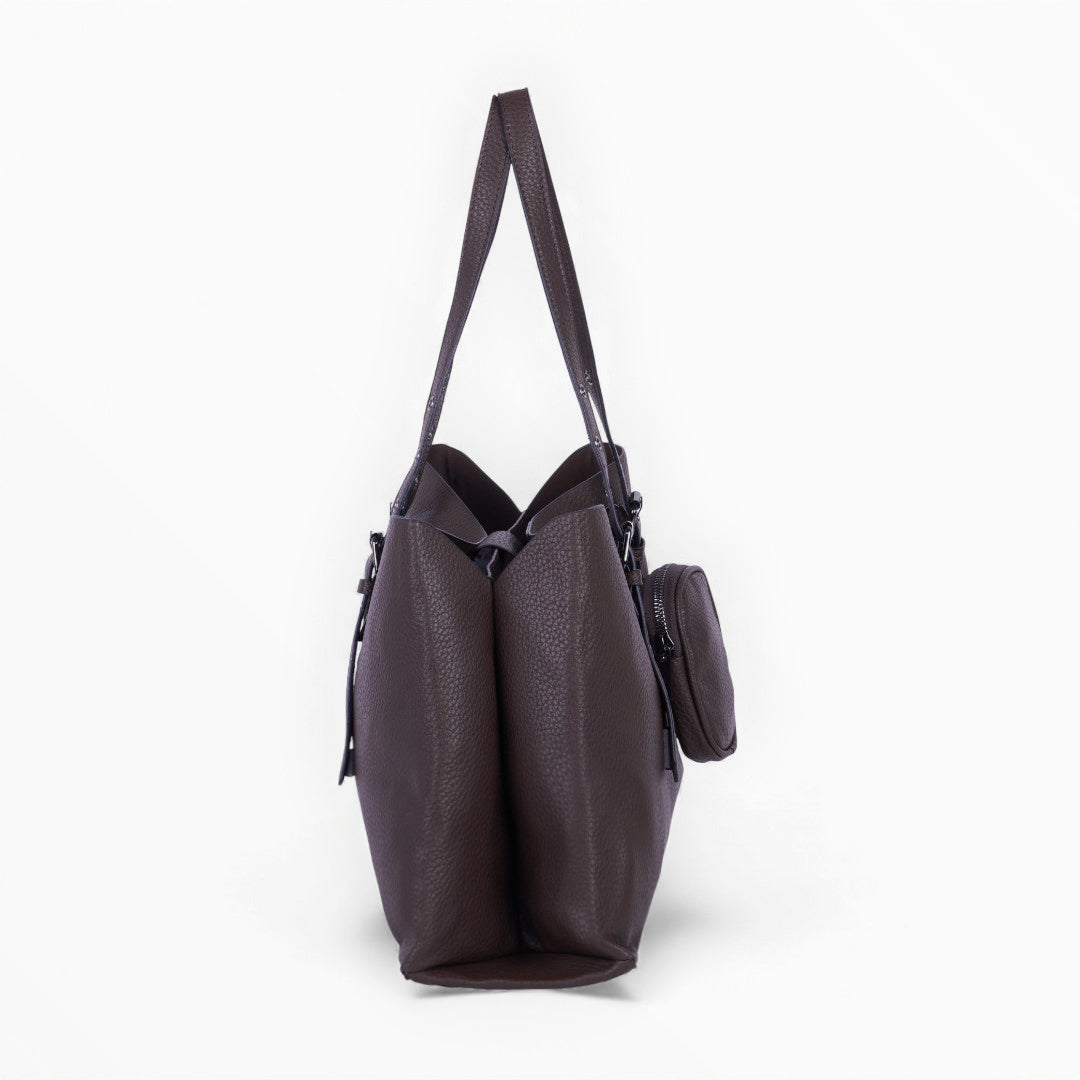 Bolso tote color café con monedero extraíble, diseño amplio y funcional ideal para organización diaria; elegante, práctico y resistente.
