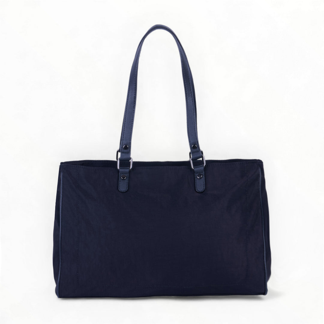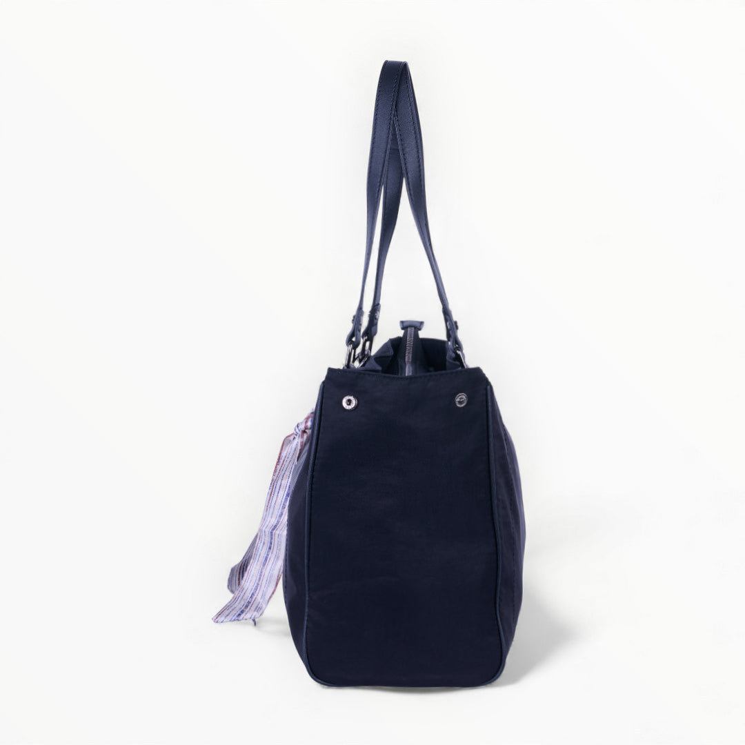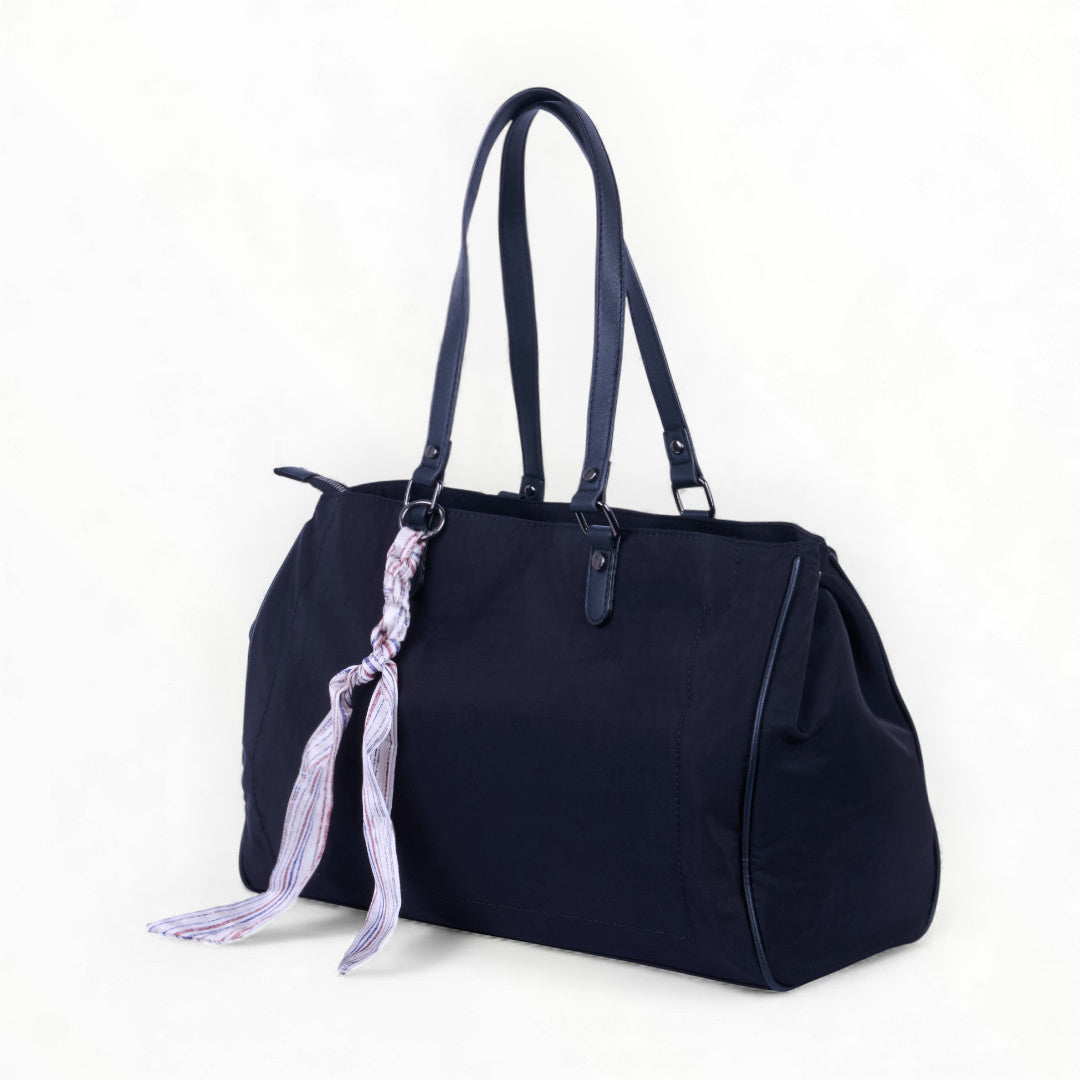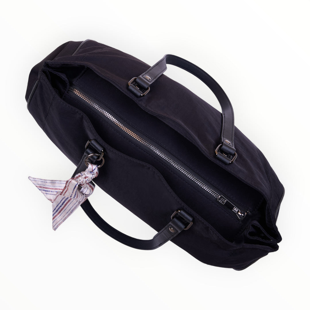 Bolso tote textil negro con pañuelo multicolor extraíble, diseño moderno y ligero ideal para complementar looks diarios; práctico, elegante y versátil.