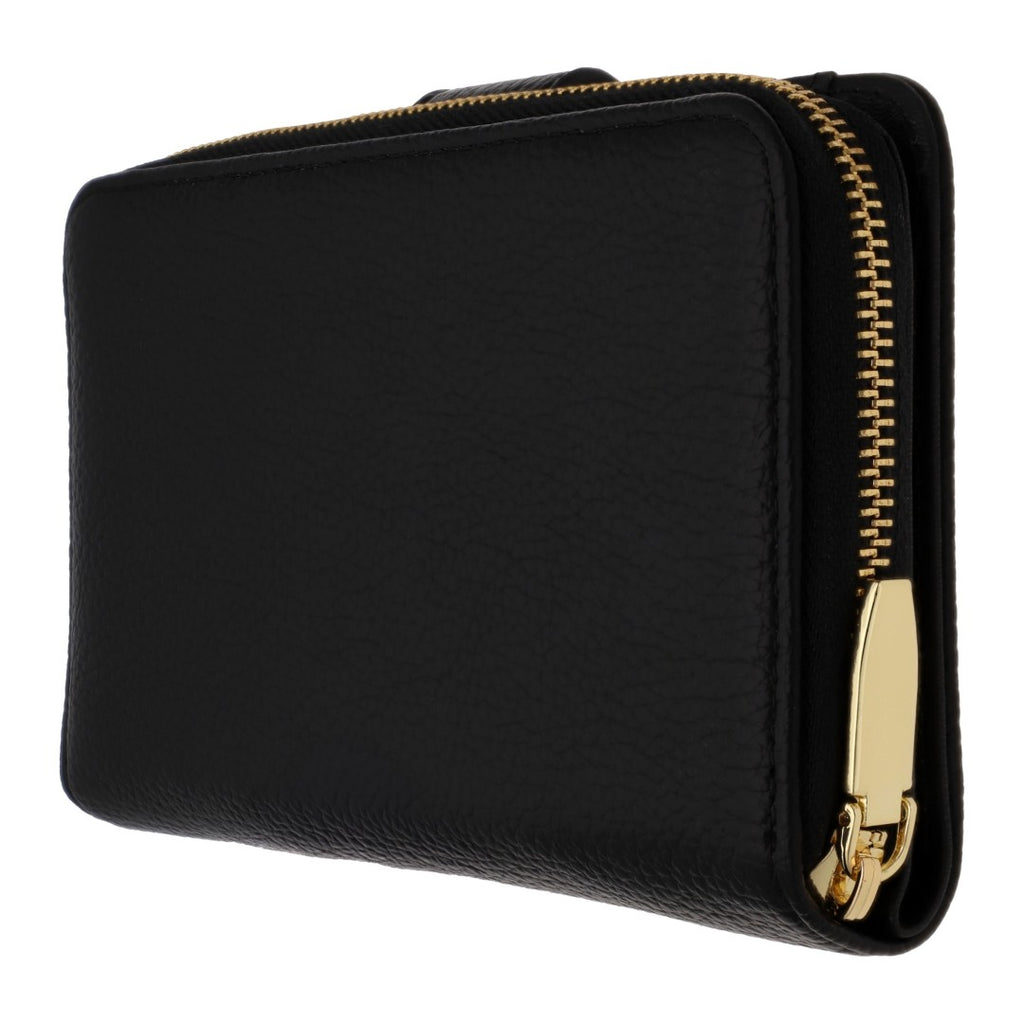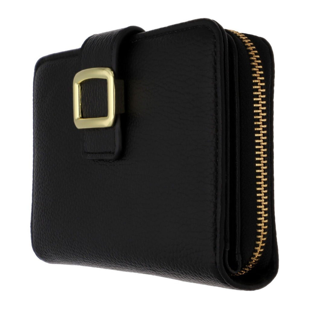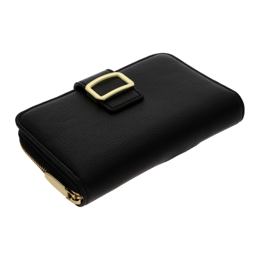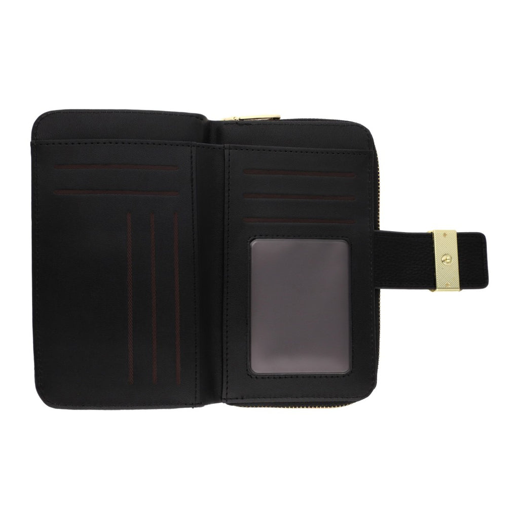 Cartera de dama color negro con herraje en color oro, 1 cierre externo y 7 compartimentos para tarjetas, perfecta para mantener todo organizado con estilo.
