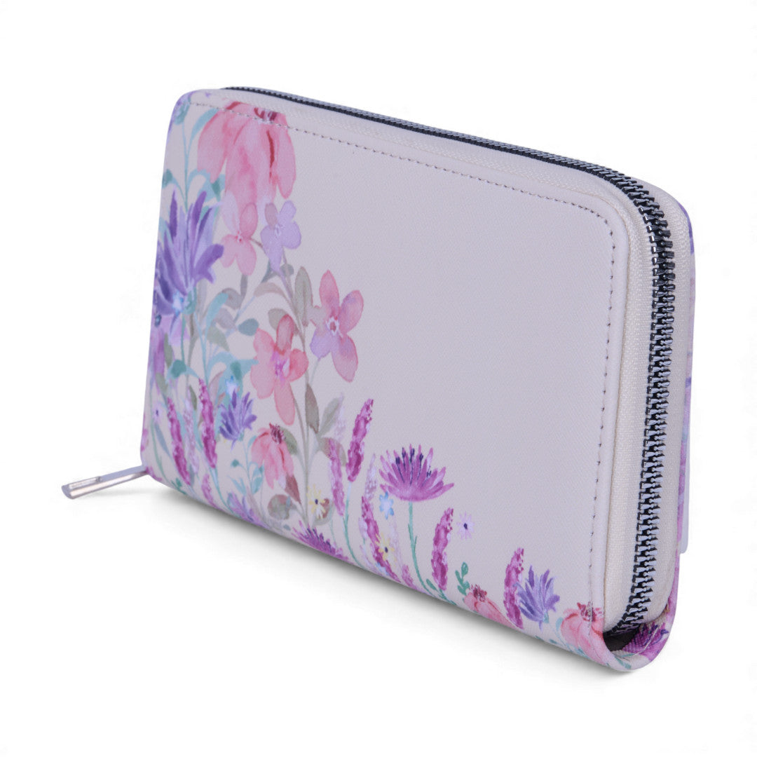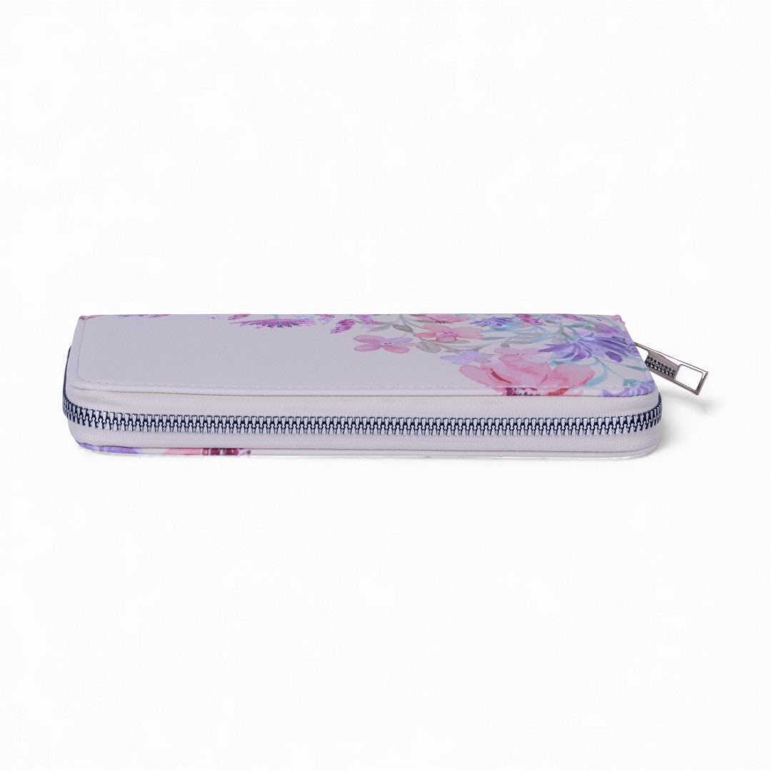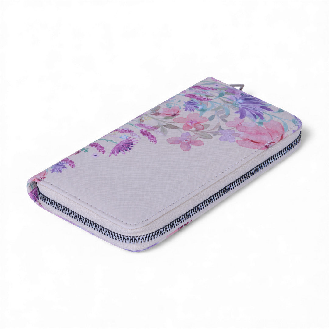 Cartera de dama con estampado floral y ocho compartimentos para tarjetas; práctica, ligera y perfecta para organizar lo esencial con estilo.