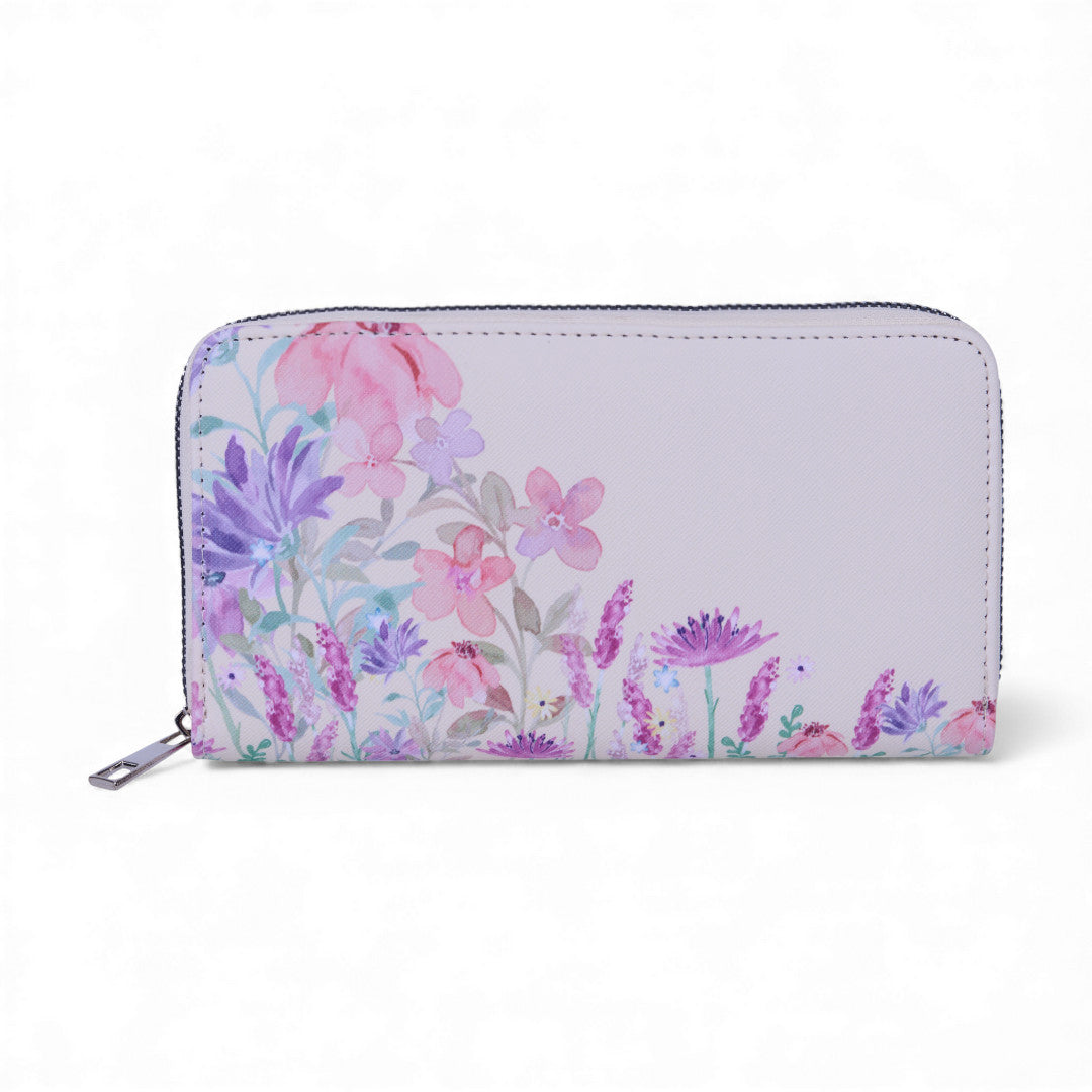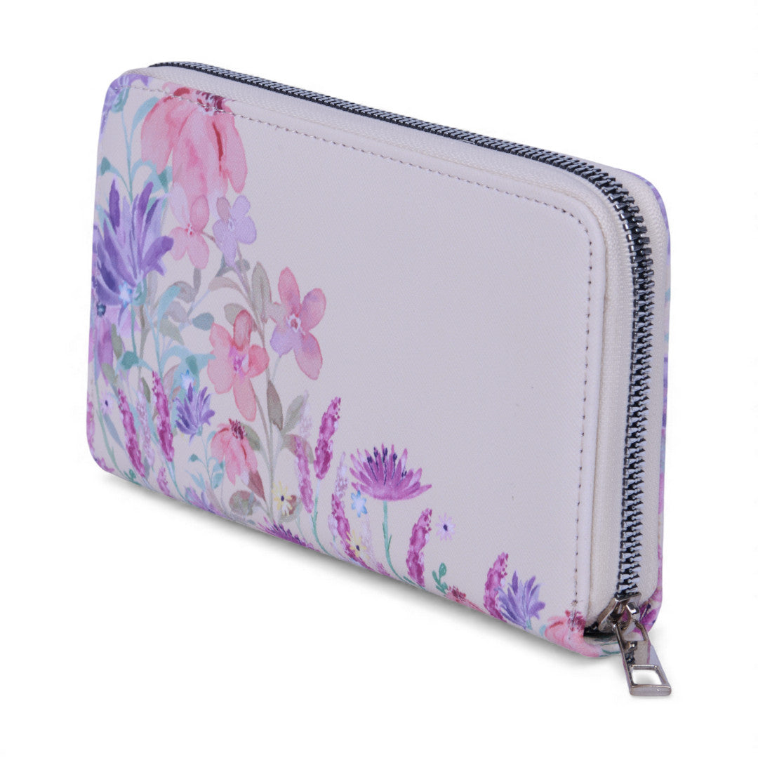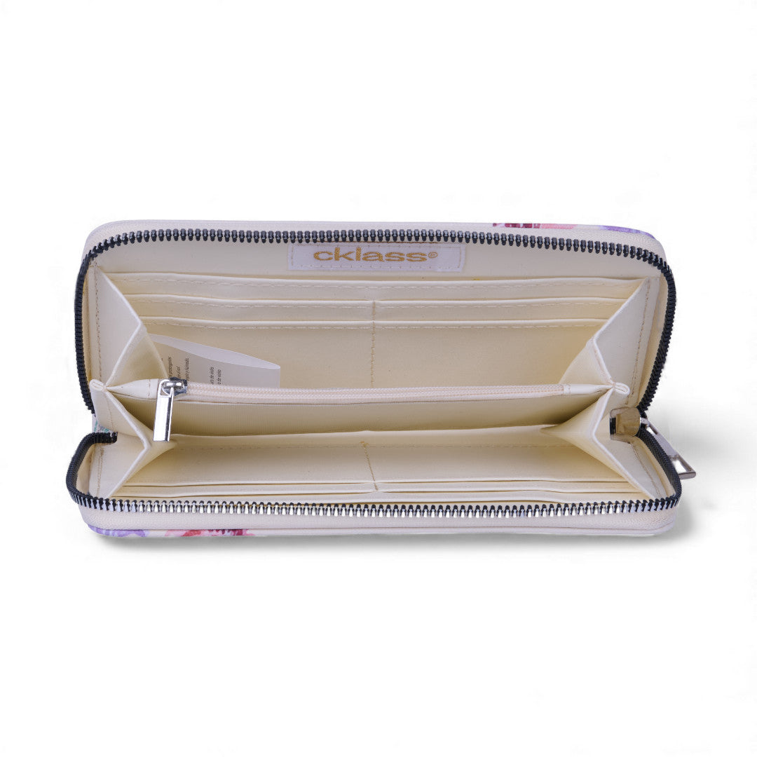 Cartera de dama con estampado floral y ocho compartimentos para tarjetas; práctica, ligera y perfecta para organizar lo esencial con estilo.