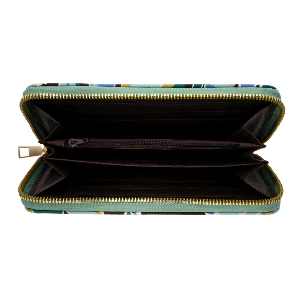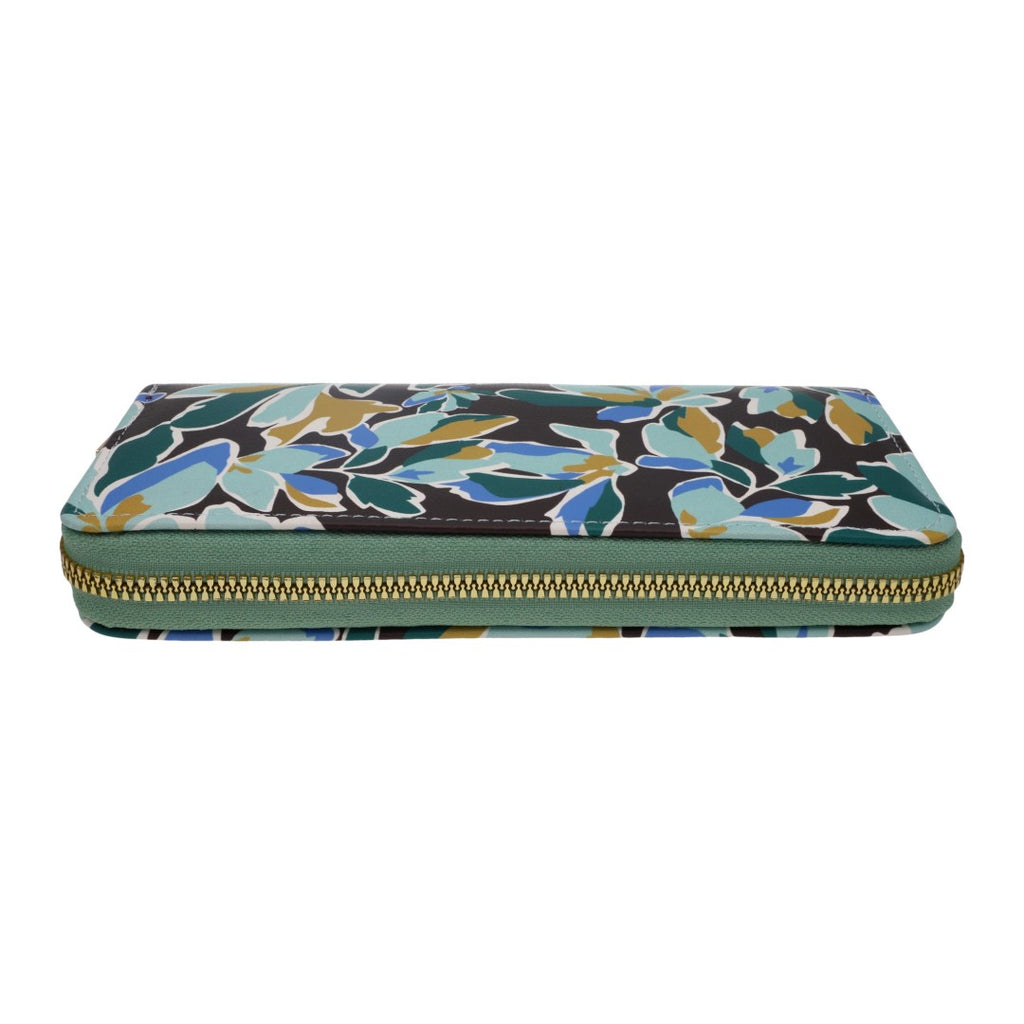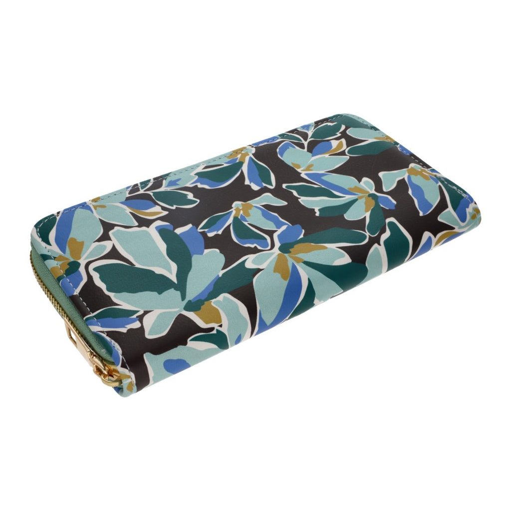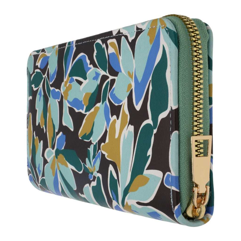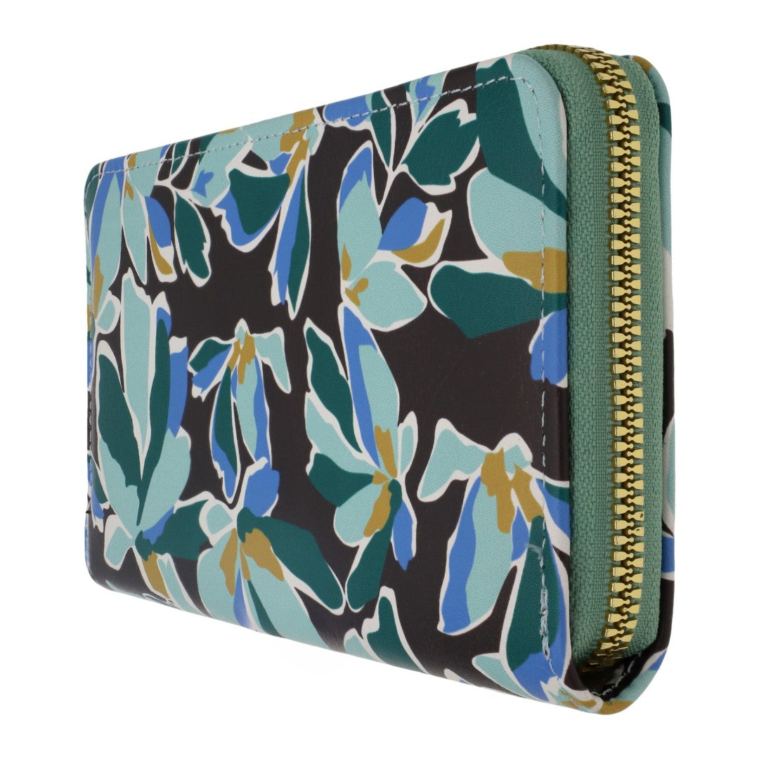 Cartera de dama con estampado floral y cierre dorado, incluye 12 compartimentos para tarjetas; accesorio elegante y práctico para cualquier ocasión.