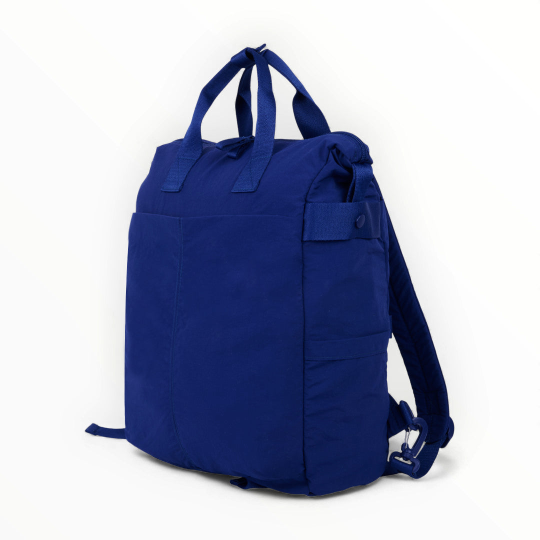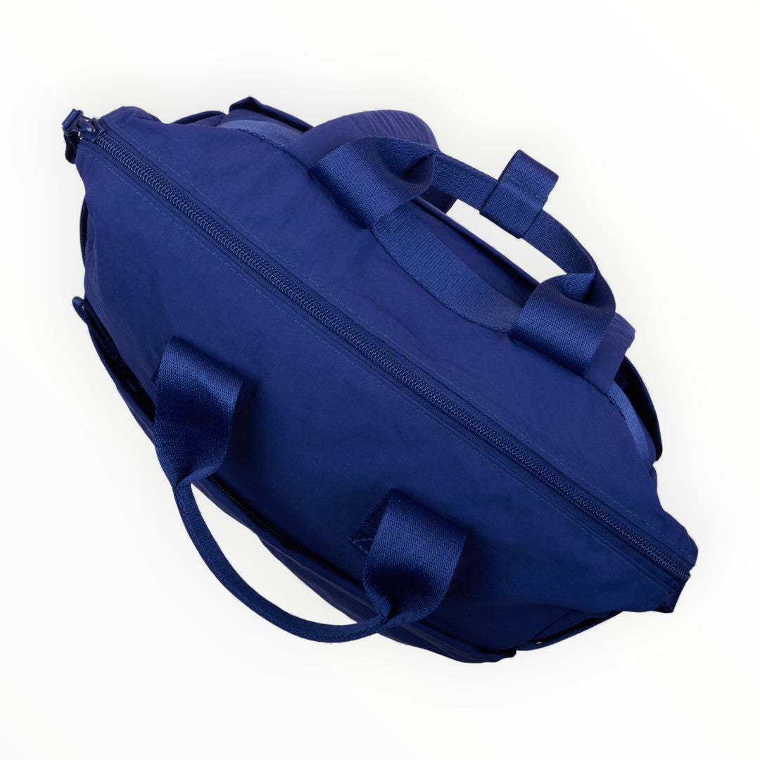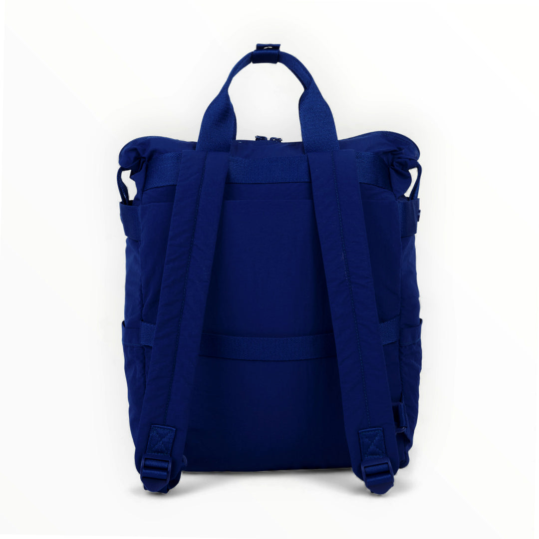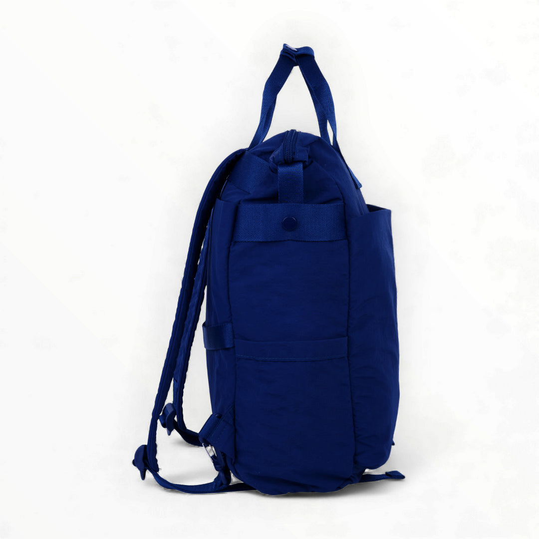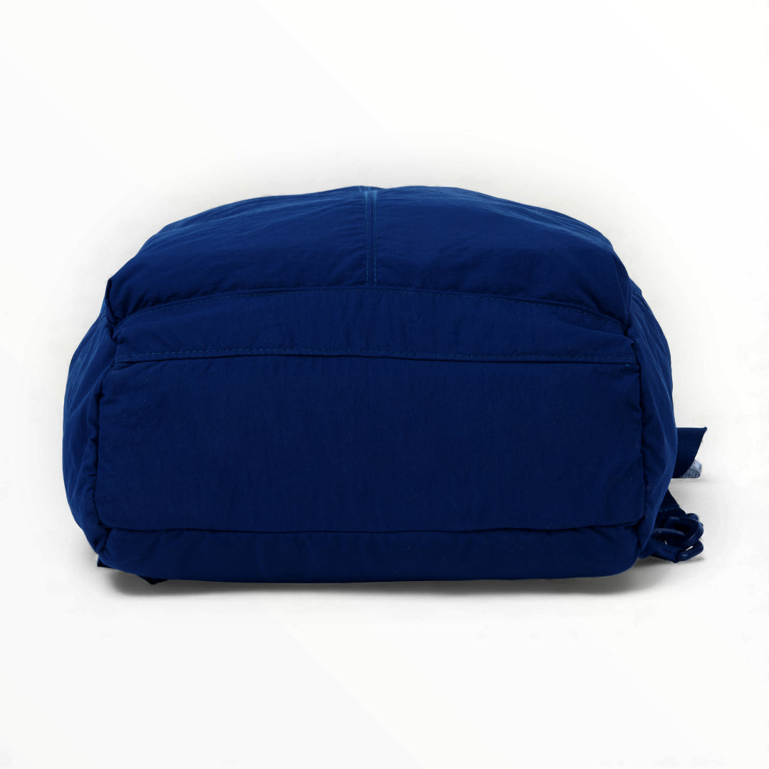 Mochila textil azul marino con múltiples compartimentos, ligera, funcional y práctica para uso diario en actividades escolares o laborales.