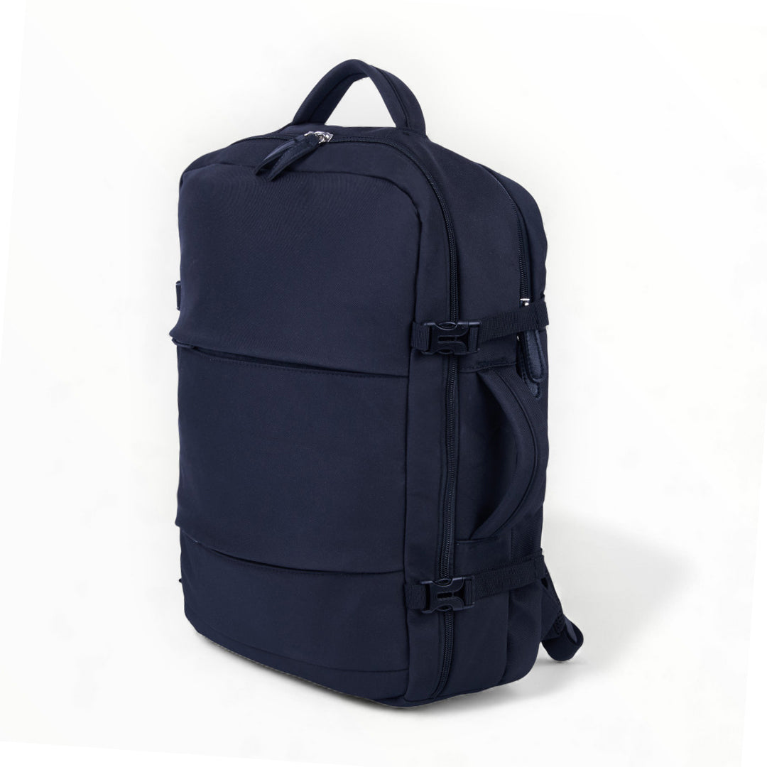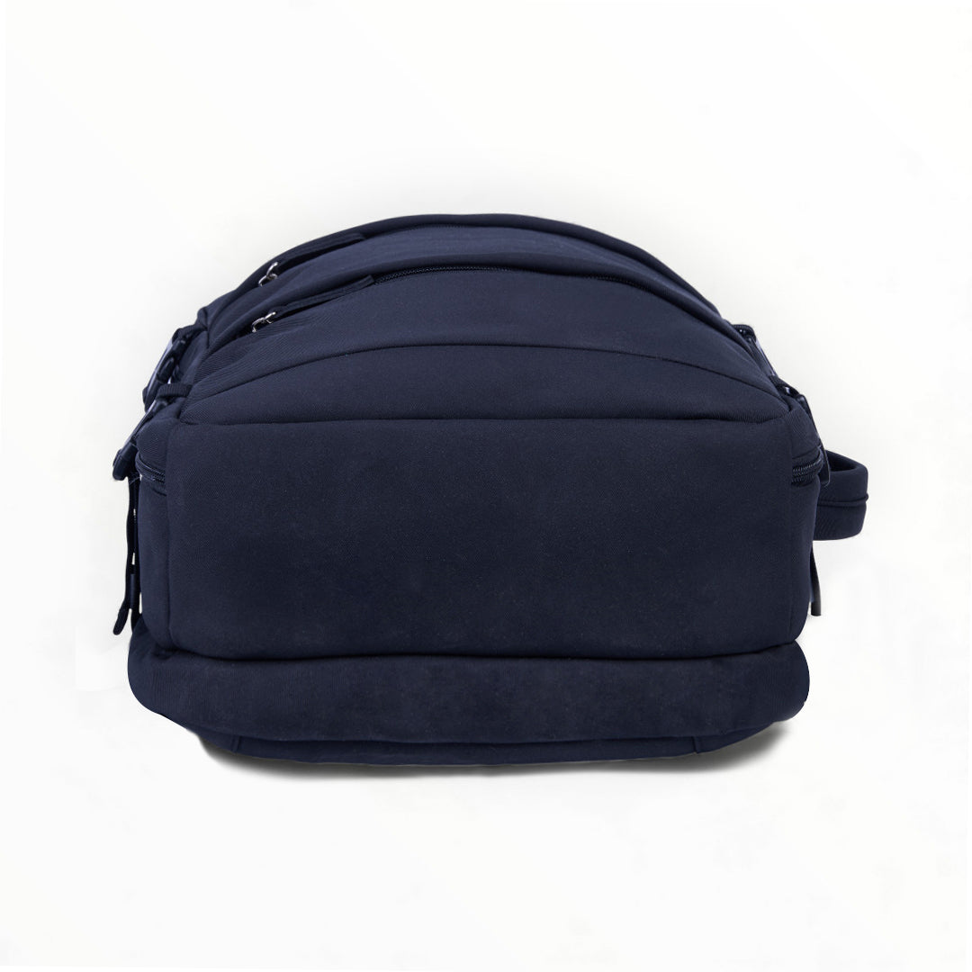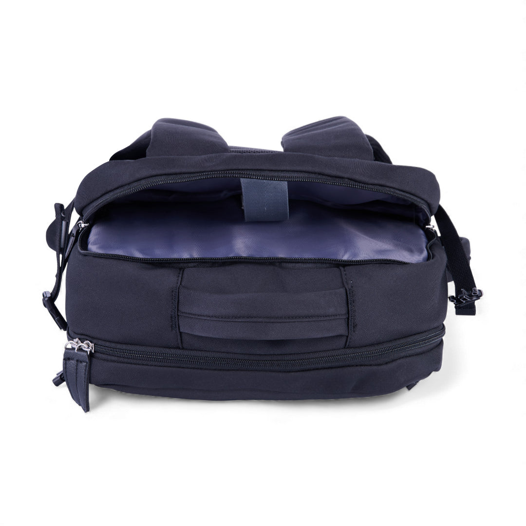 Mochila negra con compartimento para laptop y múltiples espacios de organización; ideal para trabajo, escuela y viajes cortos.