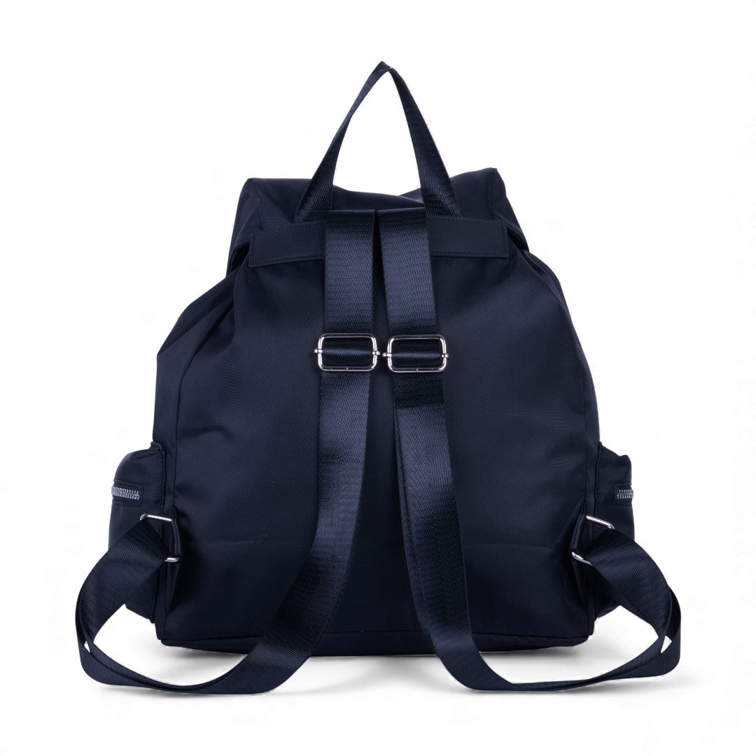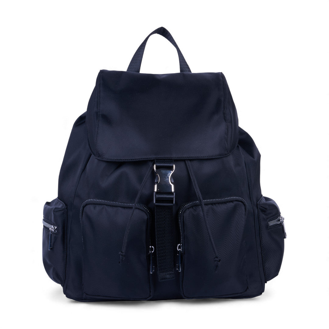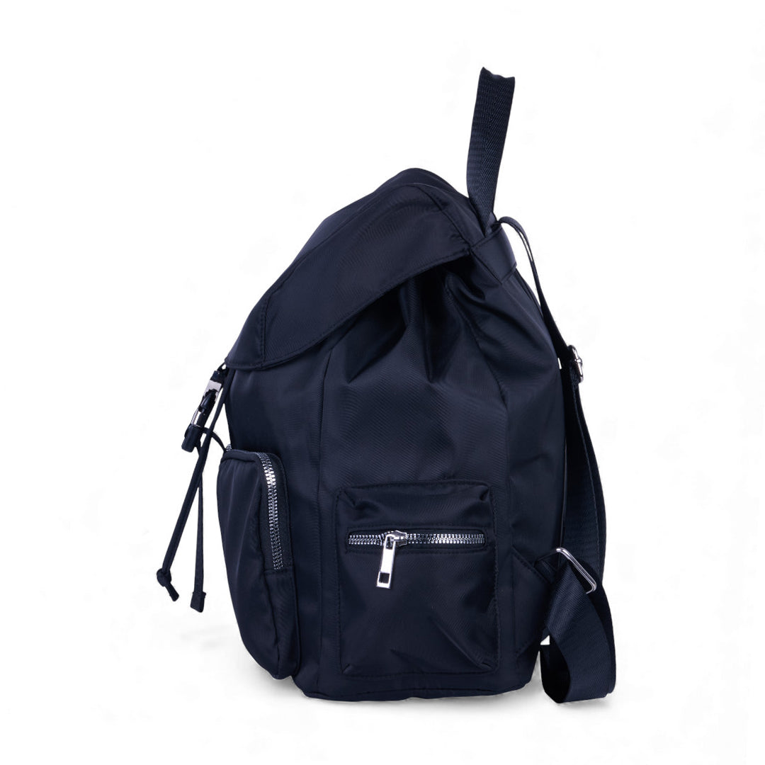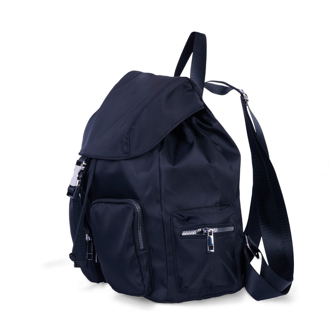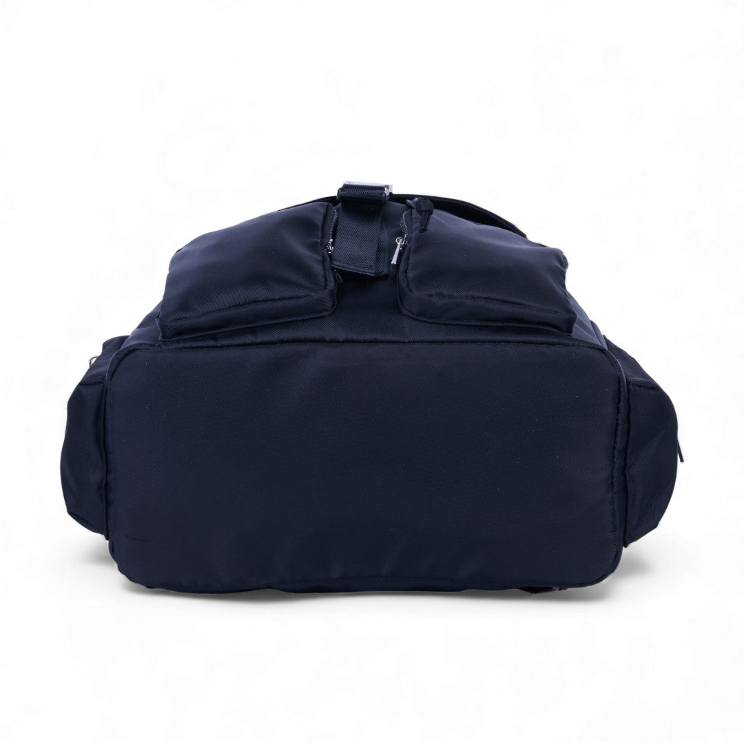 Mochila textil negra con múltiples compartimentos; práctica, resistente y perfecta para actividades diarias en trabajo o escuela.
