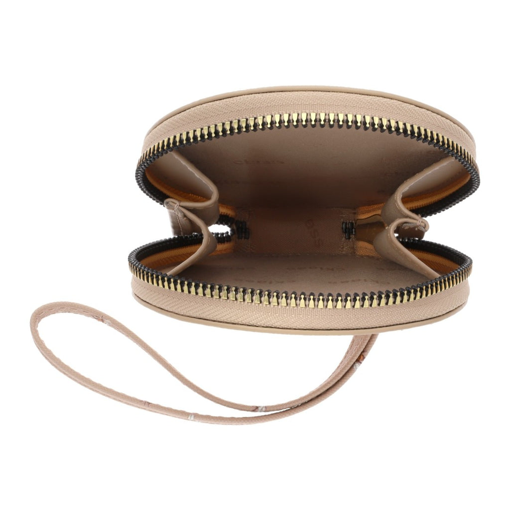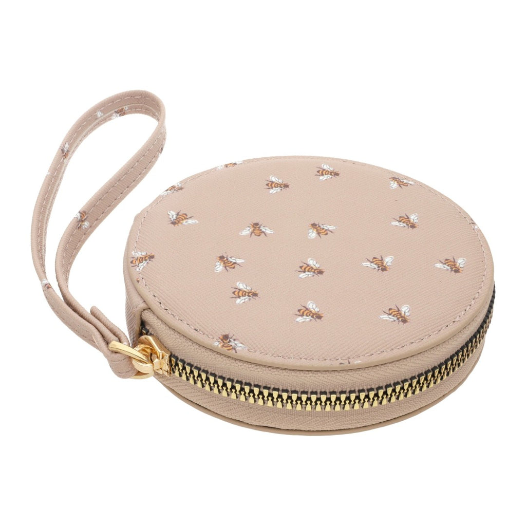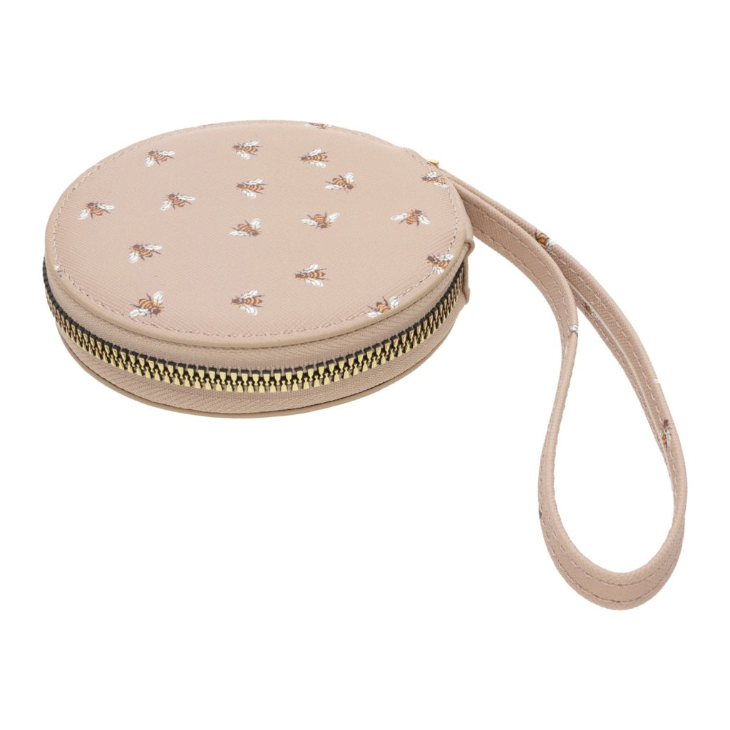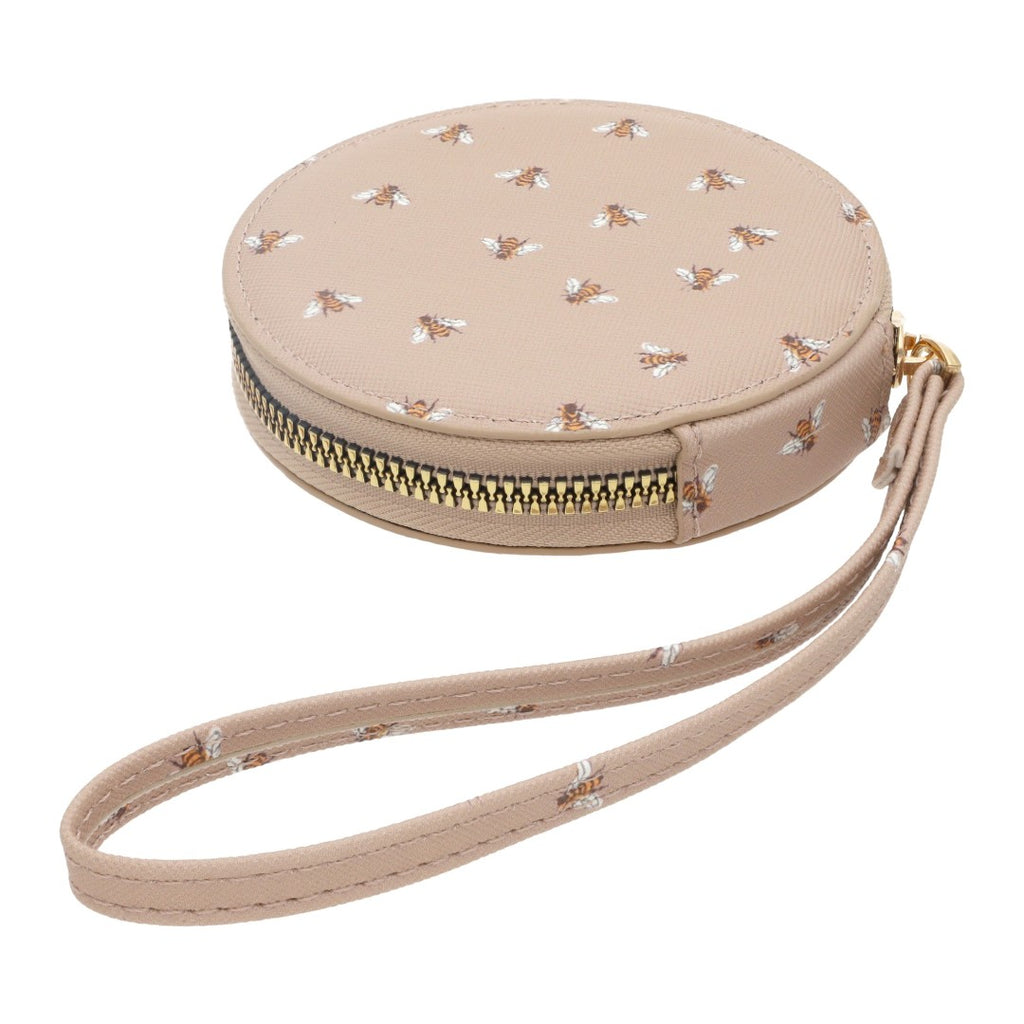 Monedero circular con estampado de abejas, incluye asa corta para cierre; diseño divertido y práctico para uso diario.