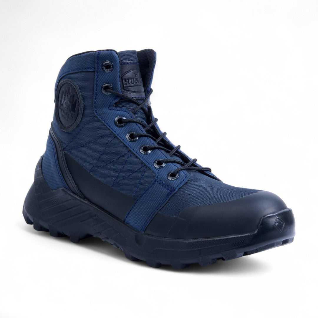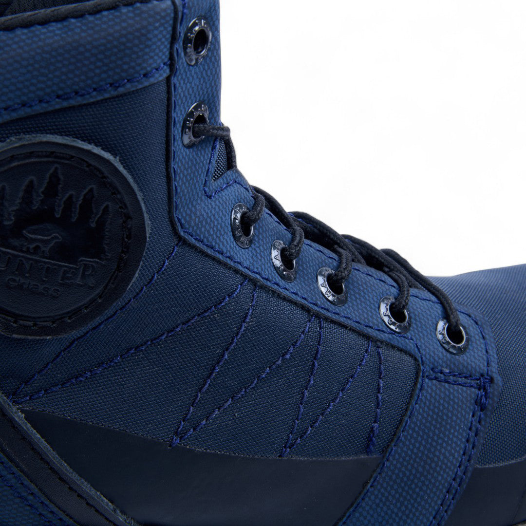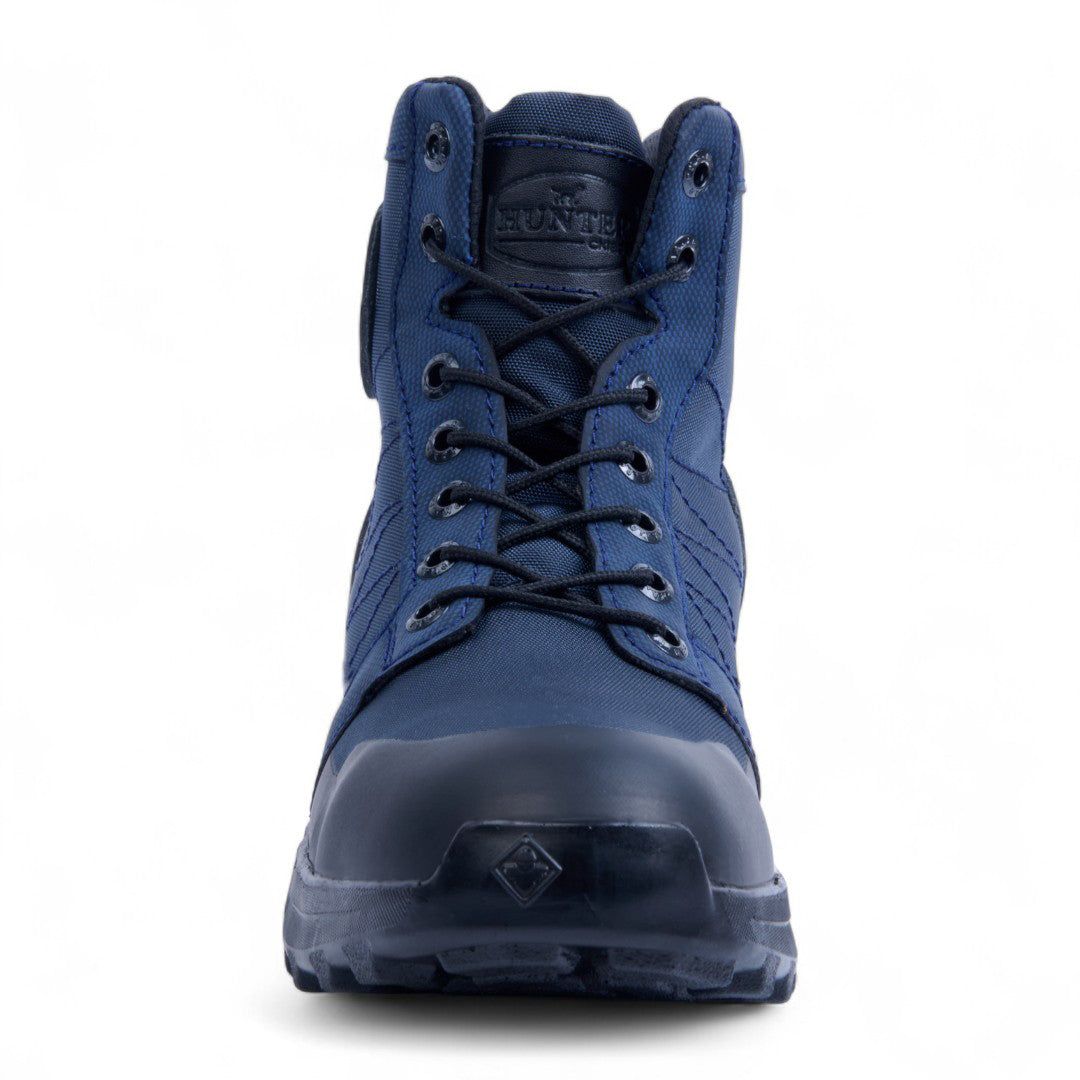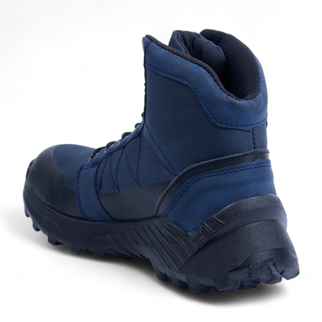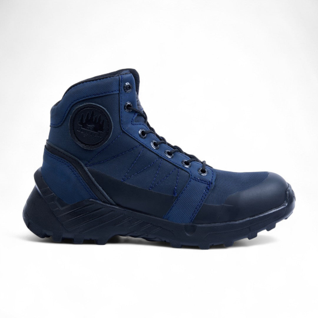 Bota de piso abullonada para dama, con detalles en negro y cintas decorativas. Plantilla textil que ofrece confort y transpirabilidad. Color azul elegante, ideal para looks casuales o urbanos con estilo moderno y versátil. Durable, ligera y a la moda, perfecta para uso diario.