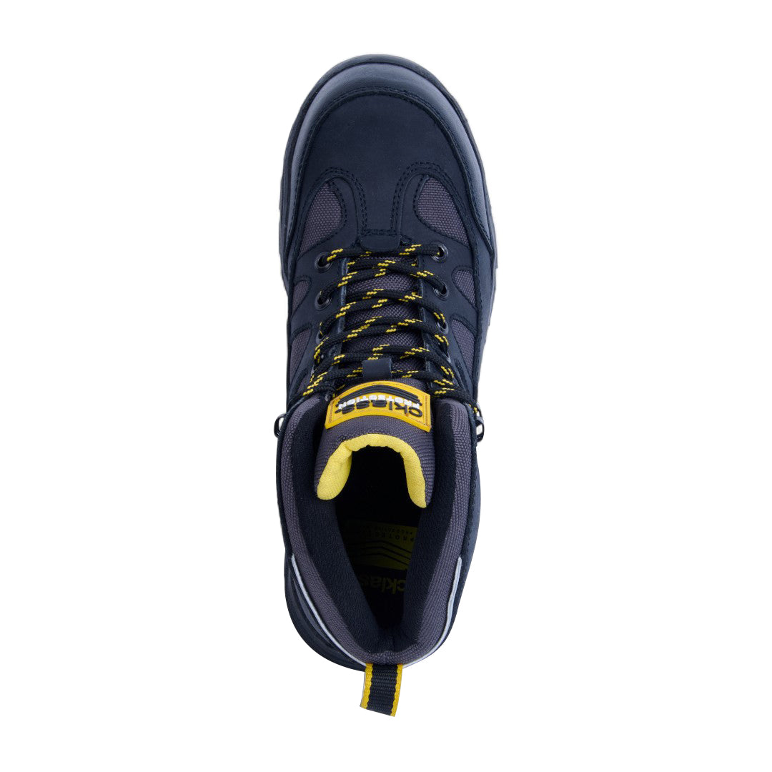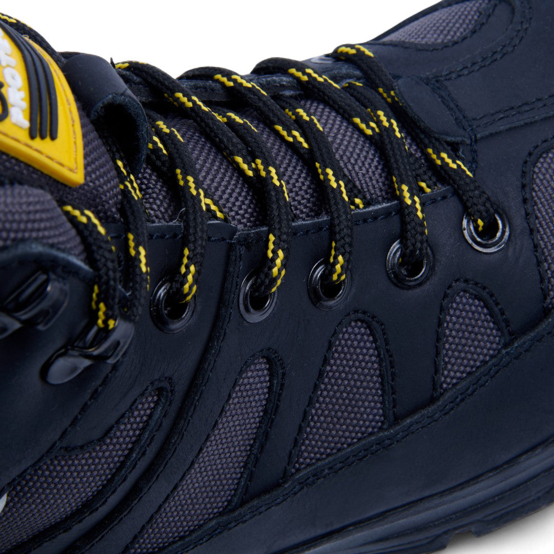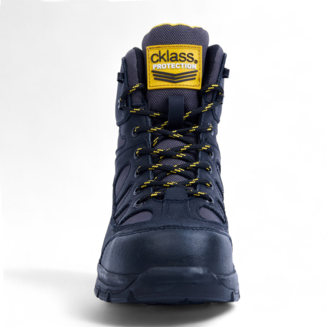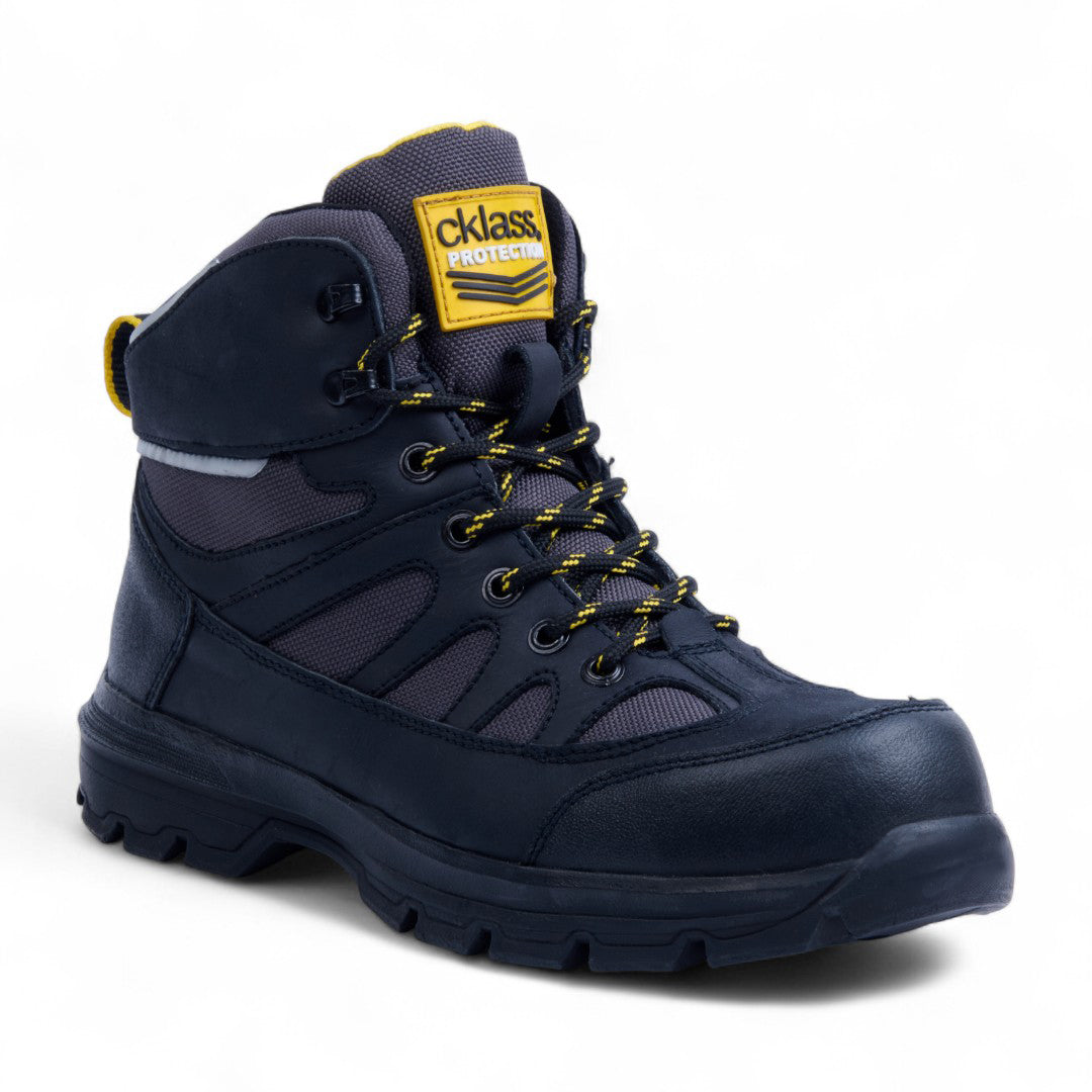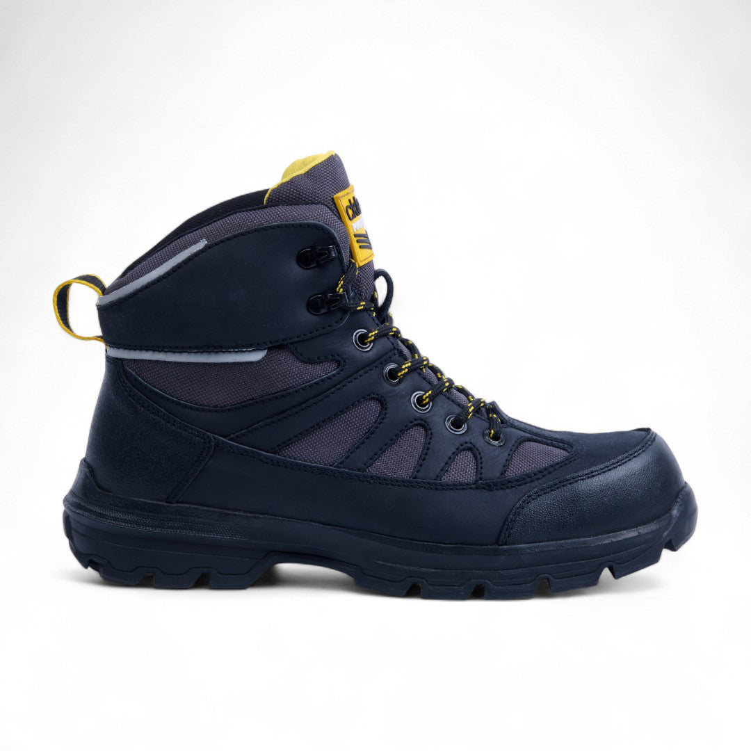 Bota de protección de piso color negro elaborada en piel vacuno de alta calidad. Diseñada con cuello acolchado para mayor confort, suela de doble densidad antideslizante y casco de poliamida que brinda seguridad y resistencia. Incluye ganchos metálicos, puntera reforzada y cinta ajustable que aseguran un ajuste firme. Ideal para trabajos industriales o de campo que requieren durabilidad y protección superior.