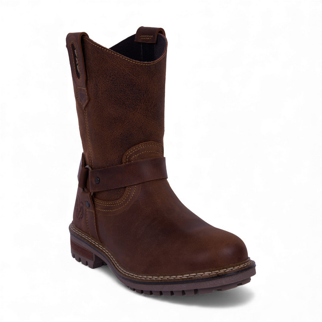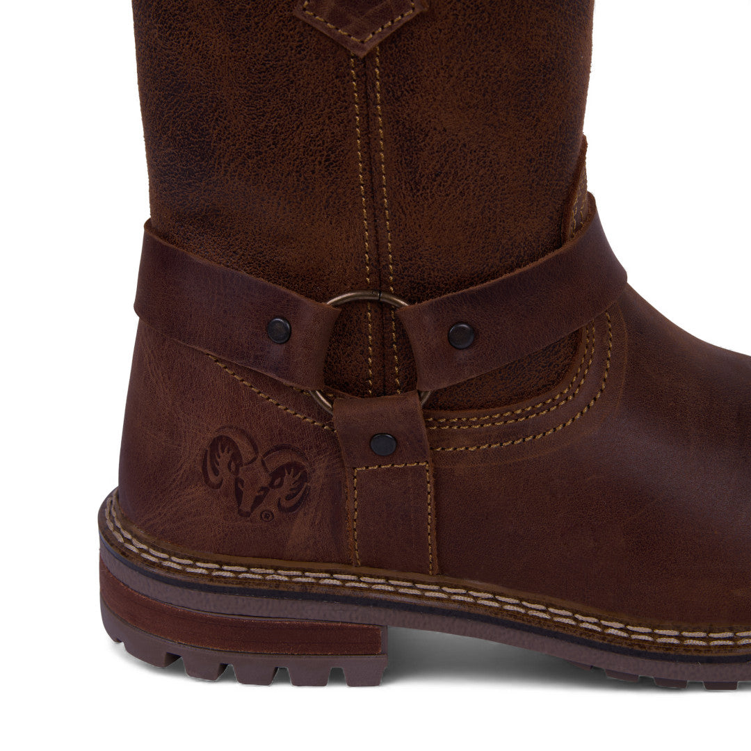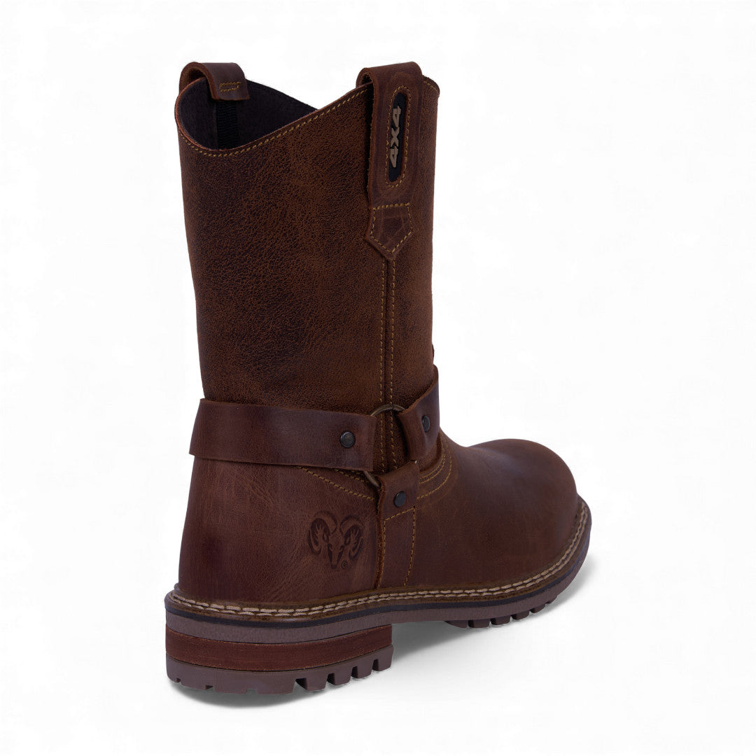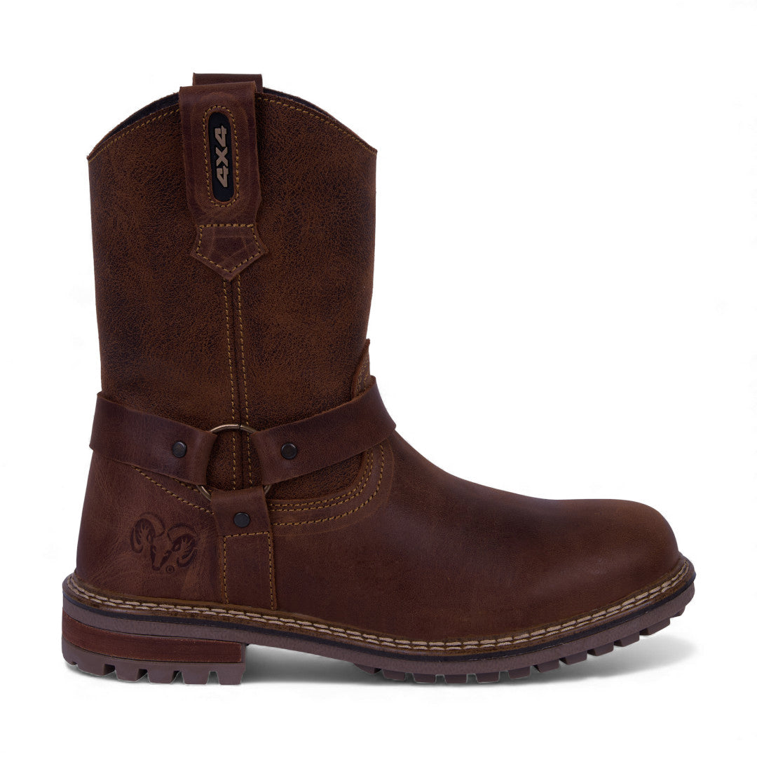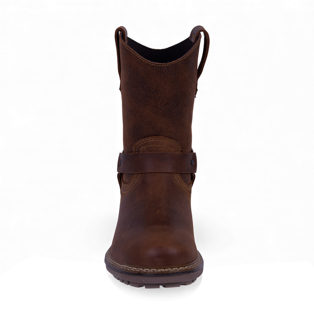 Bota vaquera para caballero con diseño western, cintillo decorativo y hebilla metálica clásica, corte café resistente y estilo auténtico para uso diario o looks rústicos.