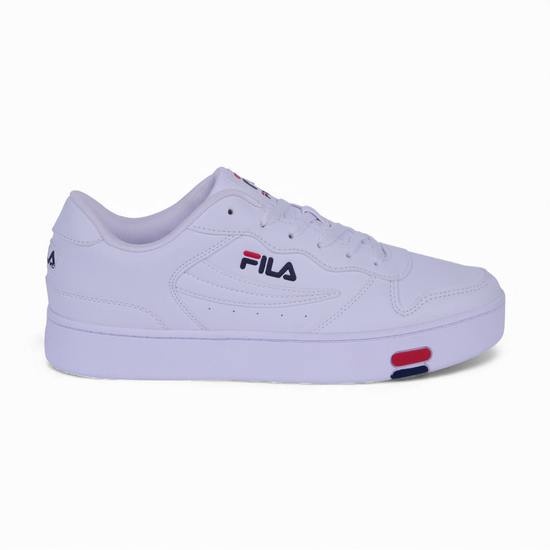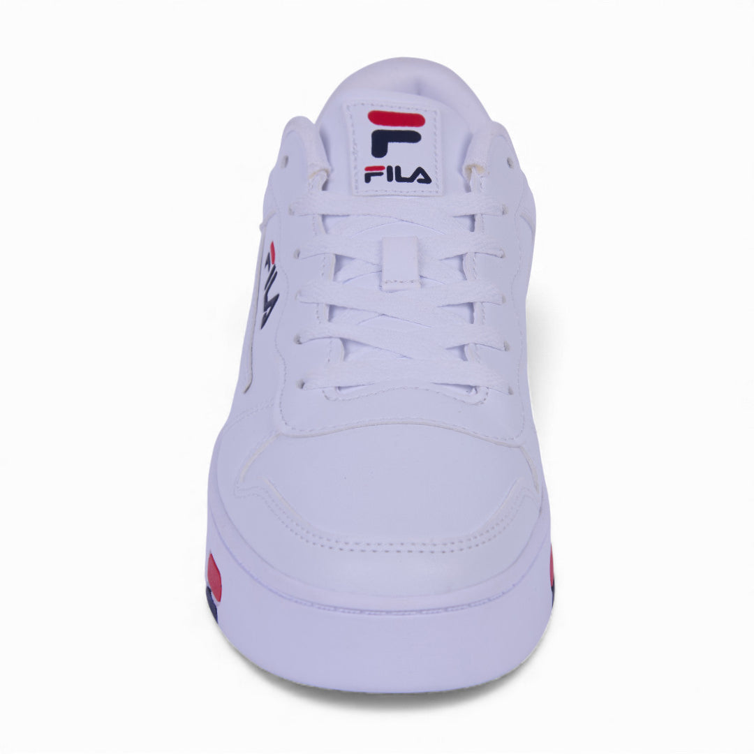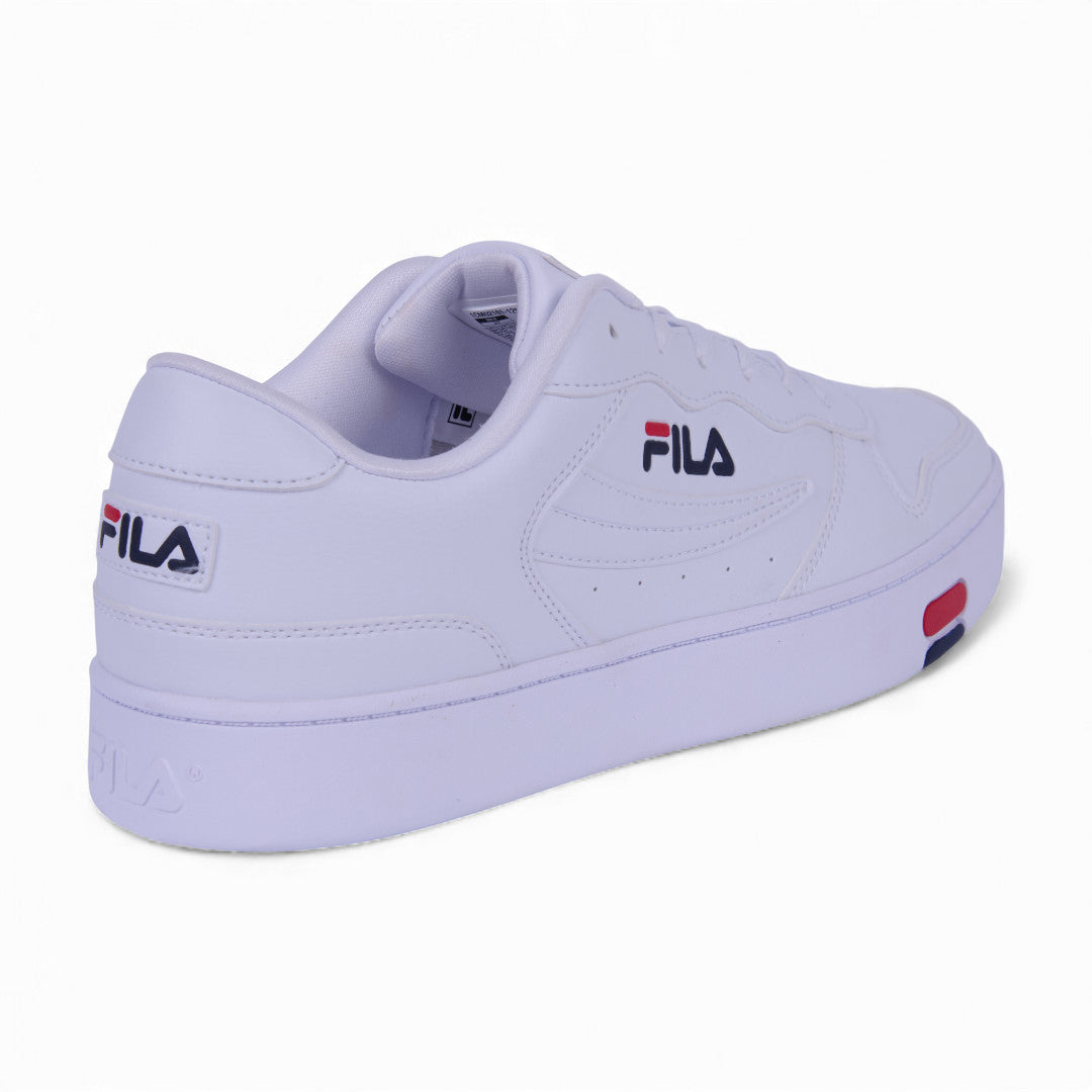 Tenis Fila blanco para caballero con suela antiderrapante, diseño transpirable y cordones ajustables; ideal para uso urbano cómodo y duradero.