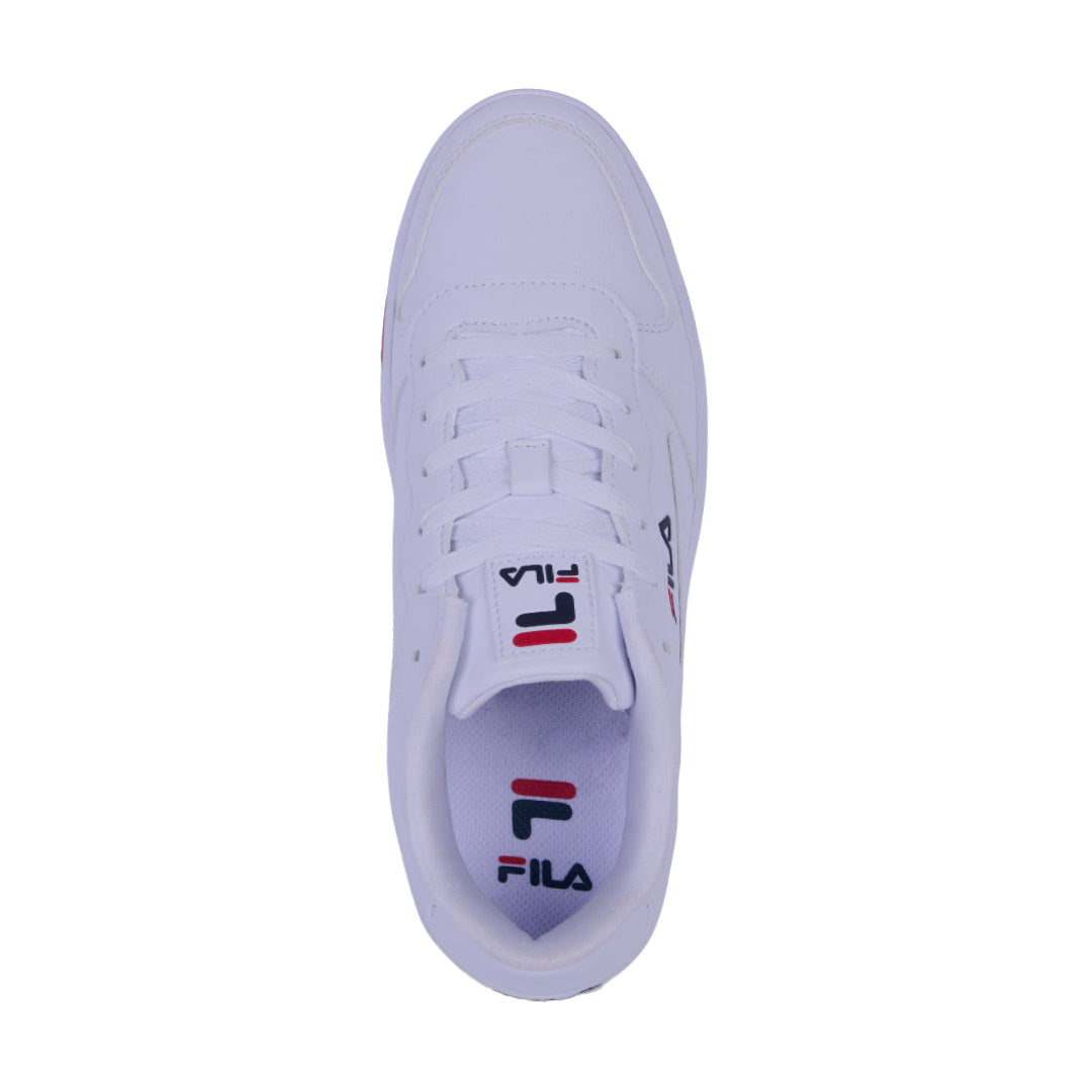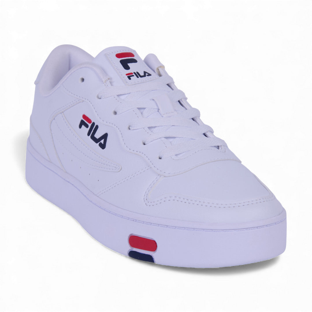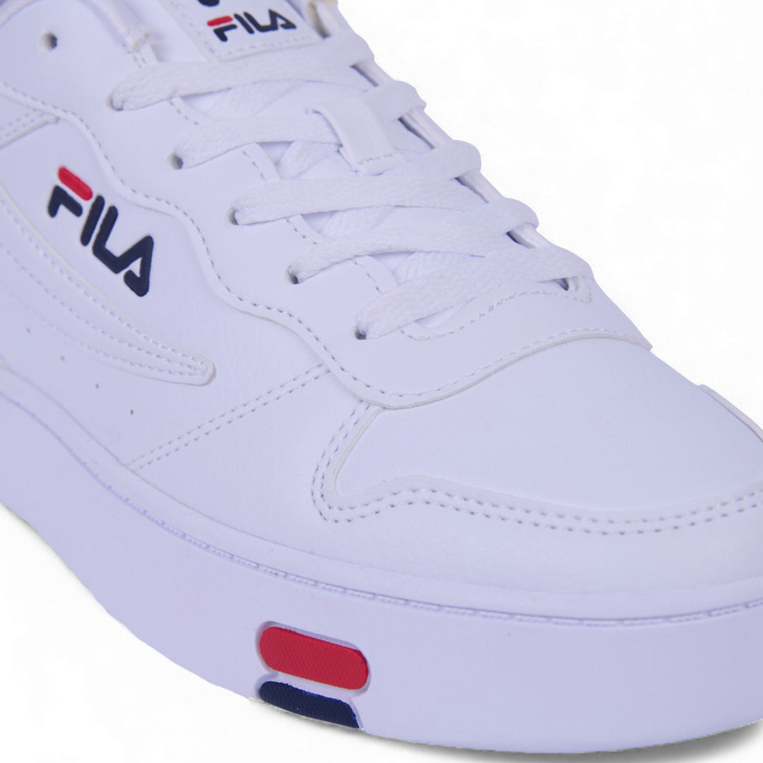 Tenis Fila blanco para caballero con suela antiderrapante, diseño transpirable y cordones ajustables; ideal para uso urbano cómodo y duradero.