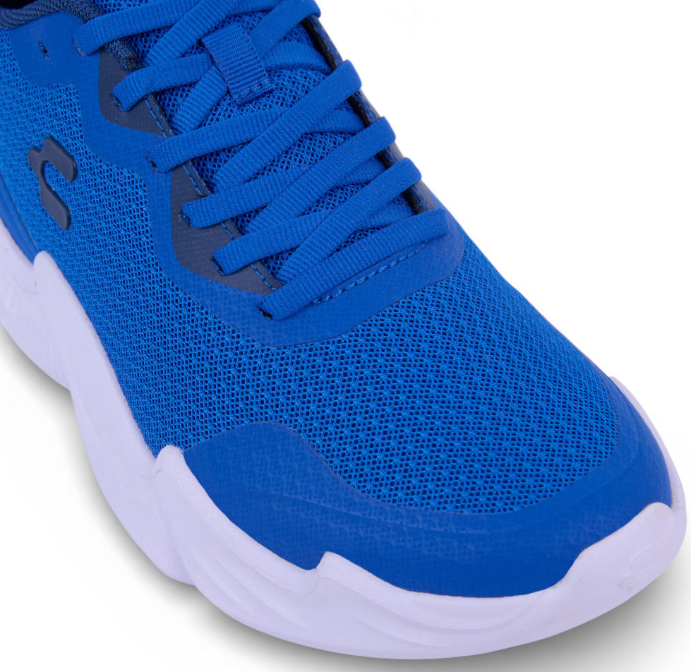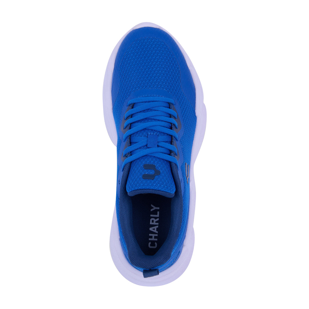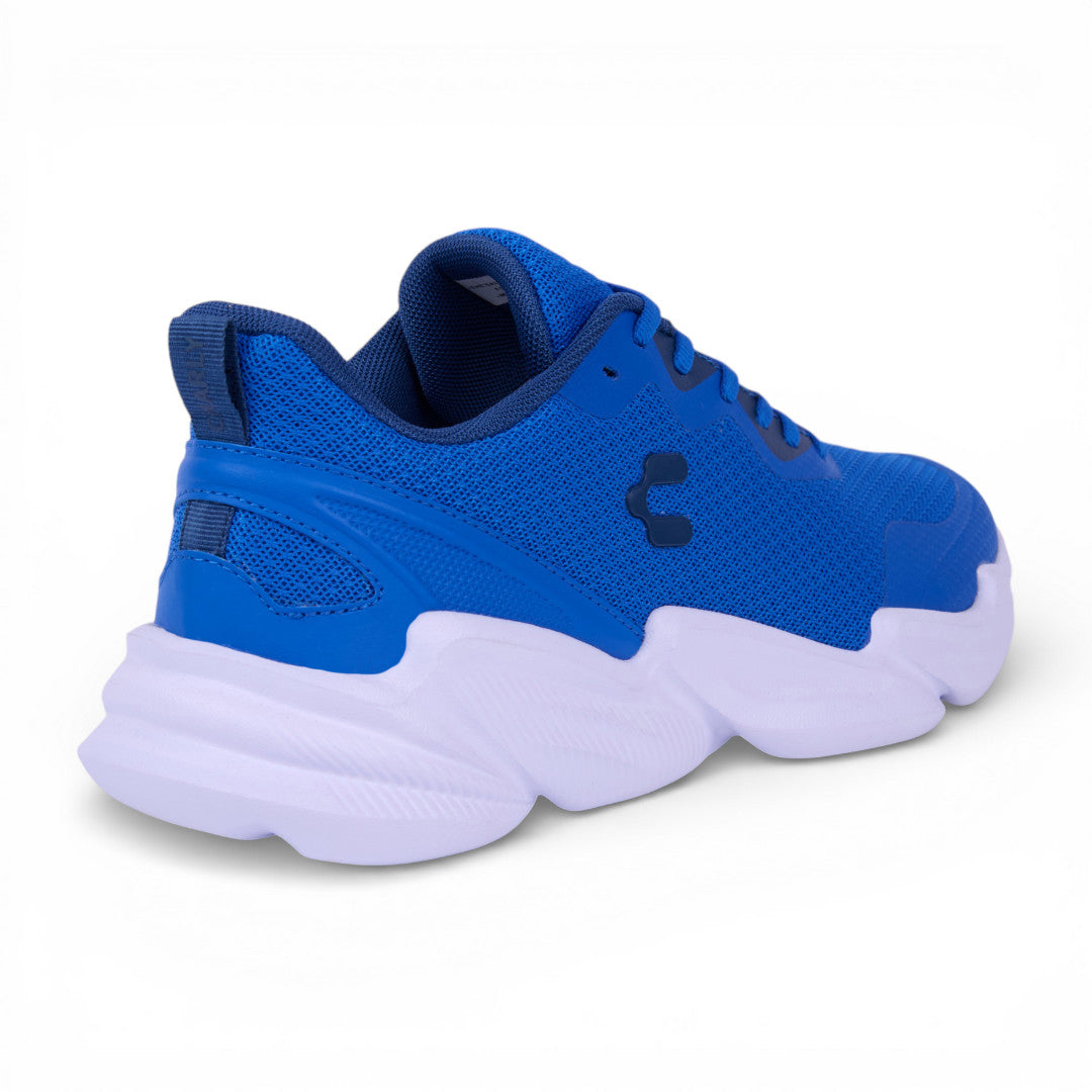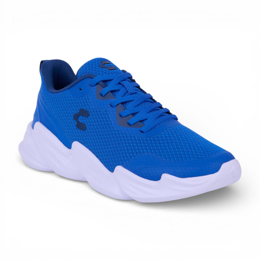 Tenis Charly de color azul con malla transpirable y cinta ajustable con jalador posterior; detalle de logo de la marca en lateral y en lengüeta con suela ligera antiderrapante. Material: Textil.