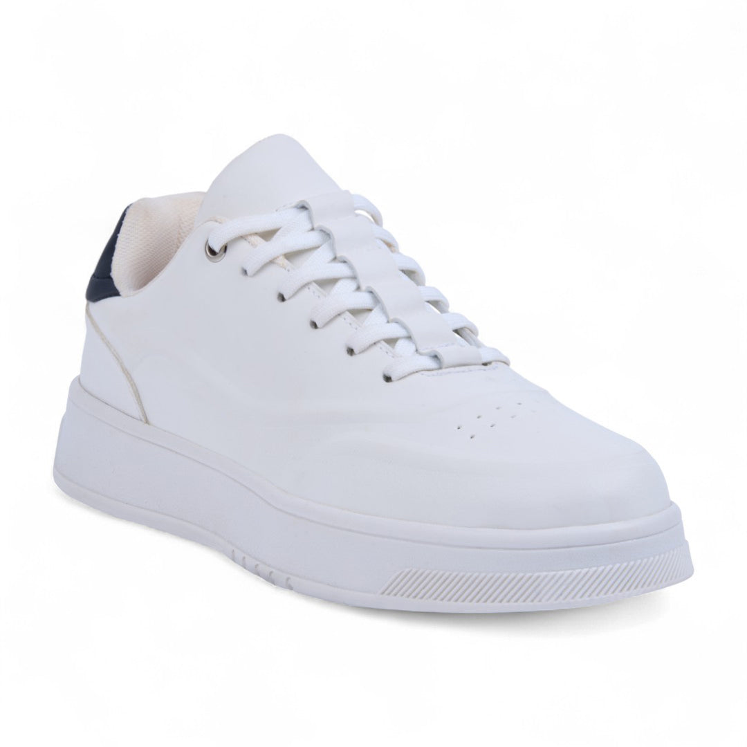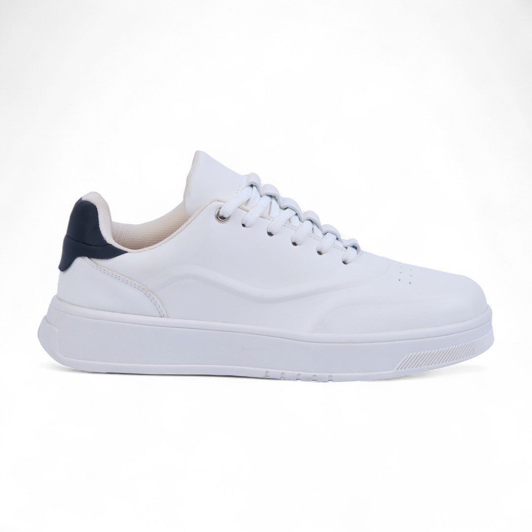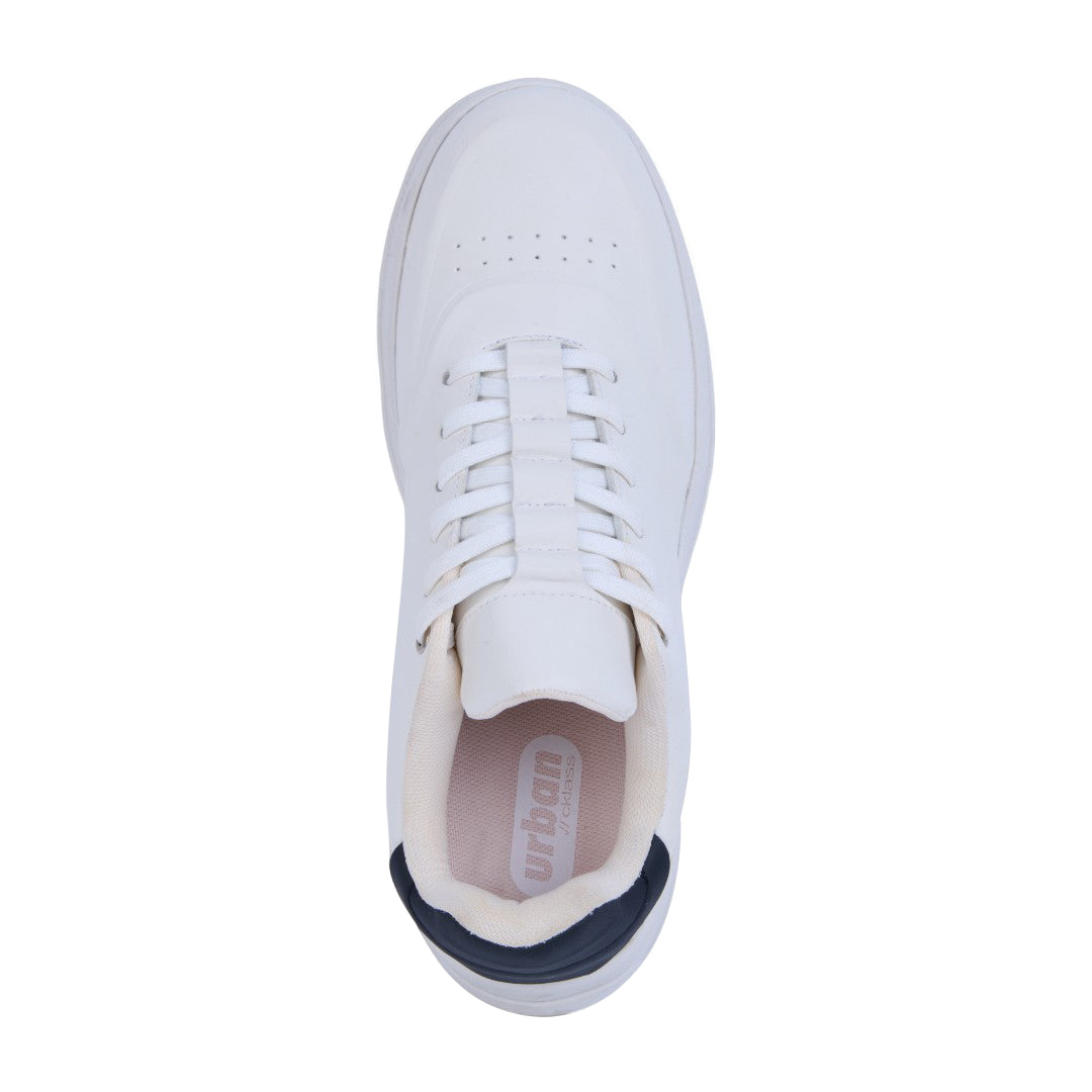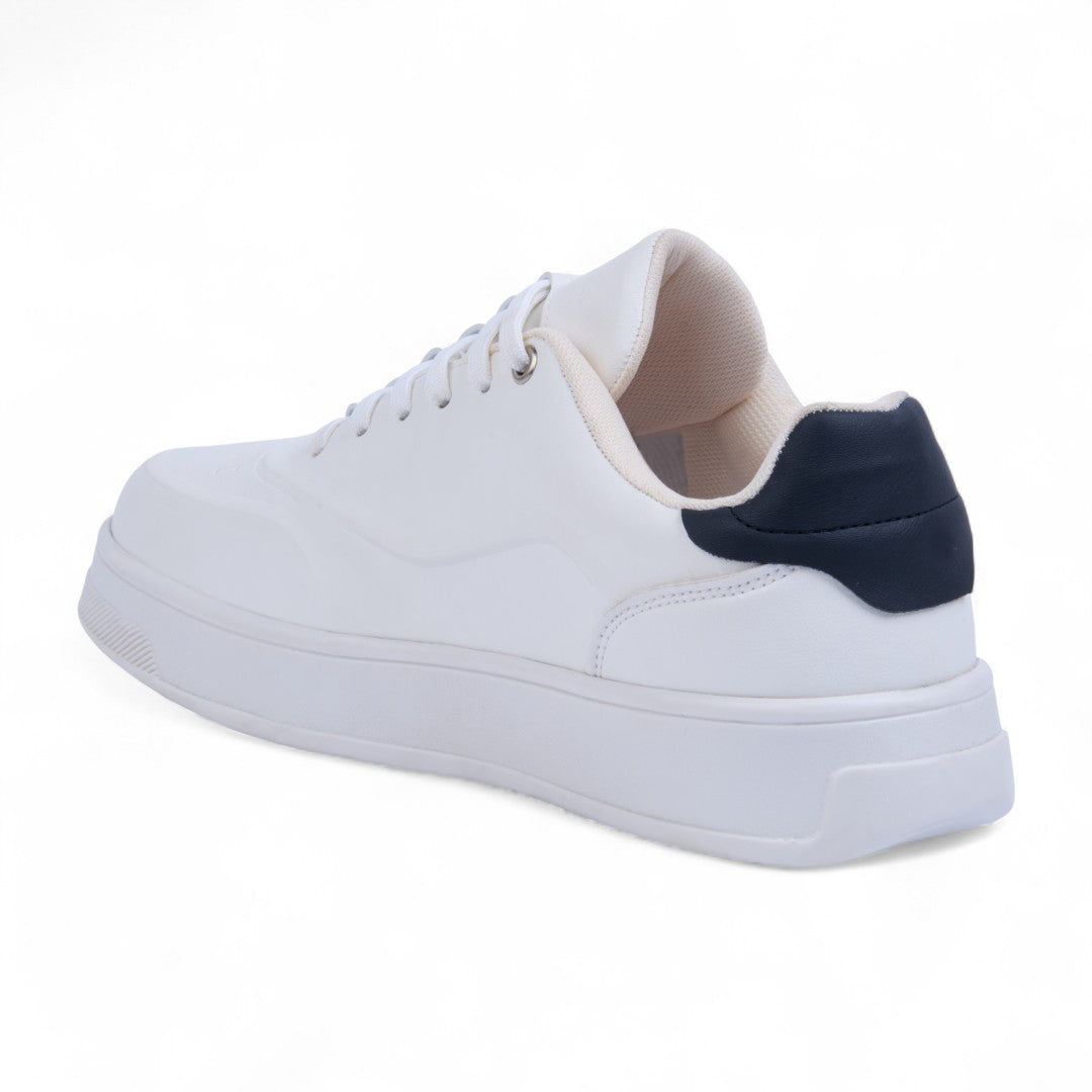 Tenis color hueso de piso confeccionado en material sintético con detalle en contraste en el talón. Incluye cintas frontales para un ajuste cómodo y plantilla textil suave que brinda confort y ligereza. Su diseño moderno y versátil complementa cualquier look urbano o casual.