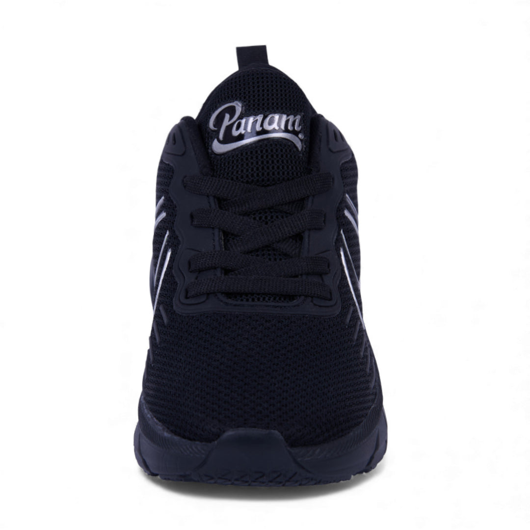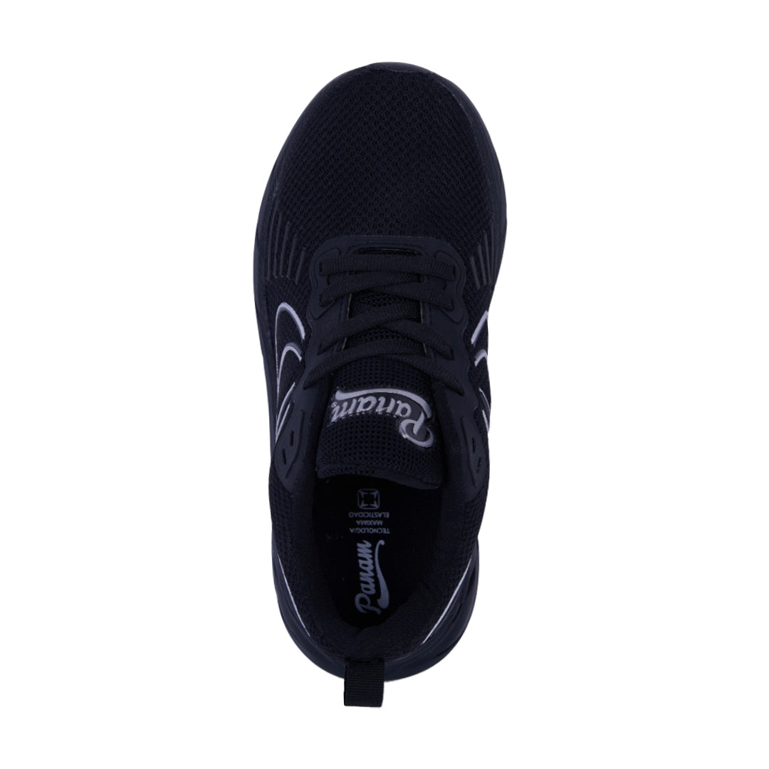 Tenis deportivo Panam para caballero en color negro, con corte textil ligero y suela sintética confortable que brinda amortiguación y estabilidad. Diseño moderno y funcional ideal para entrenar, caminar o usar a diario gracias a su comodidad, ligereza y estilo deportivo clásico.