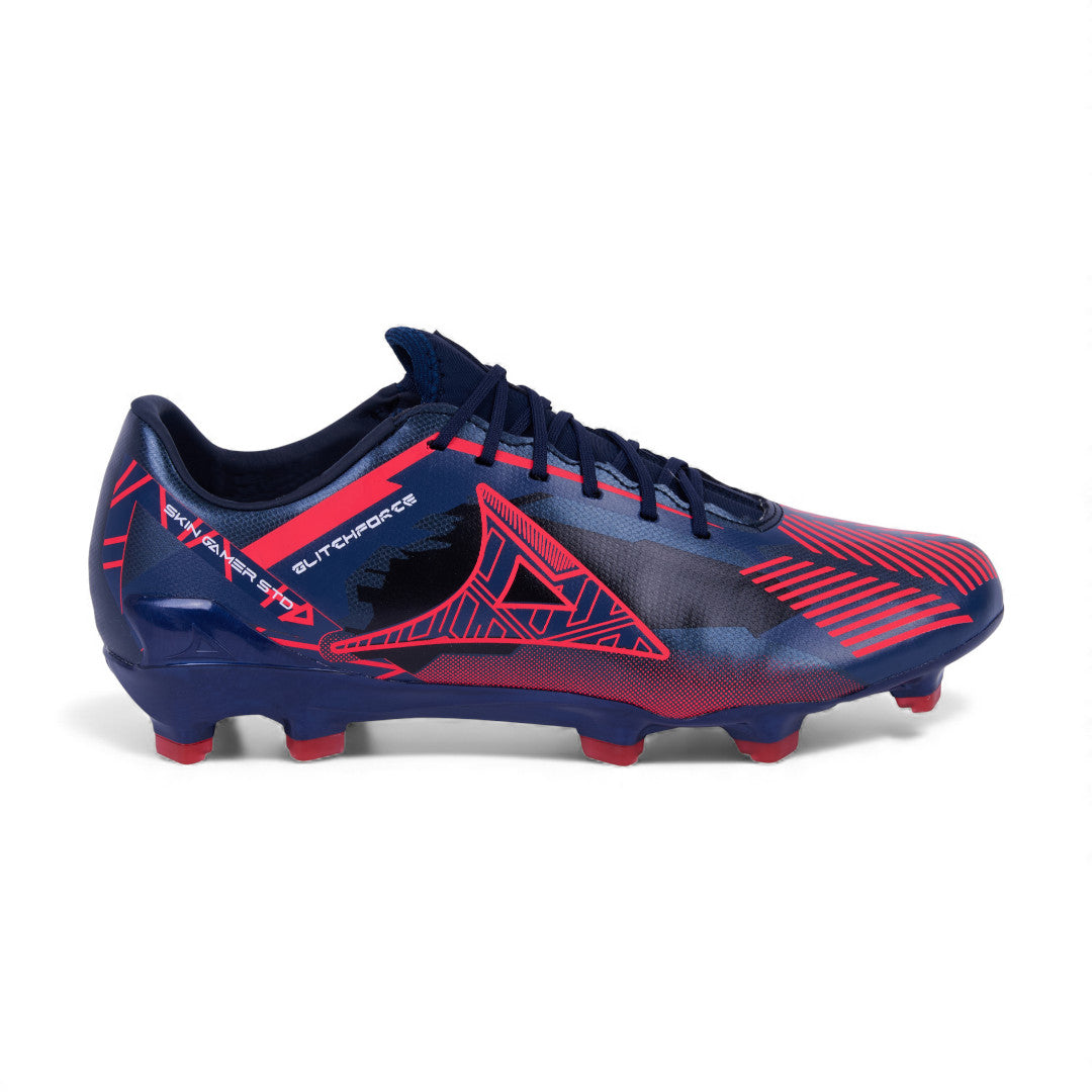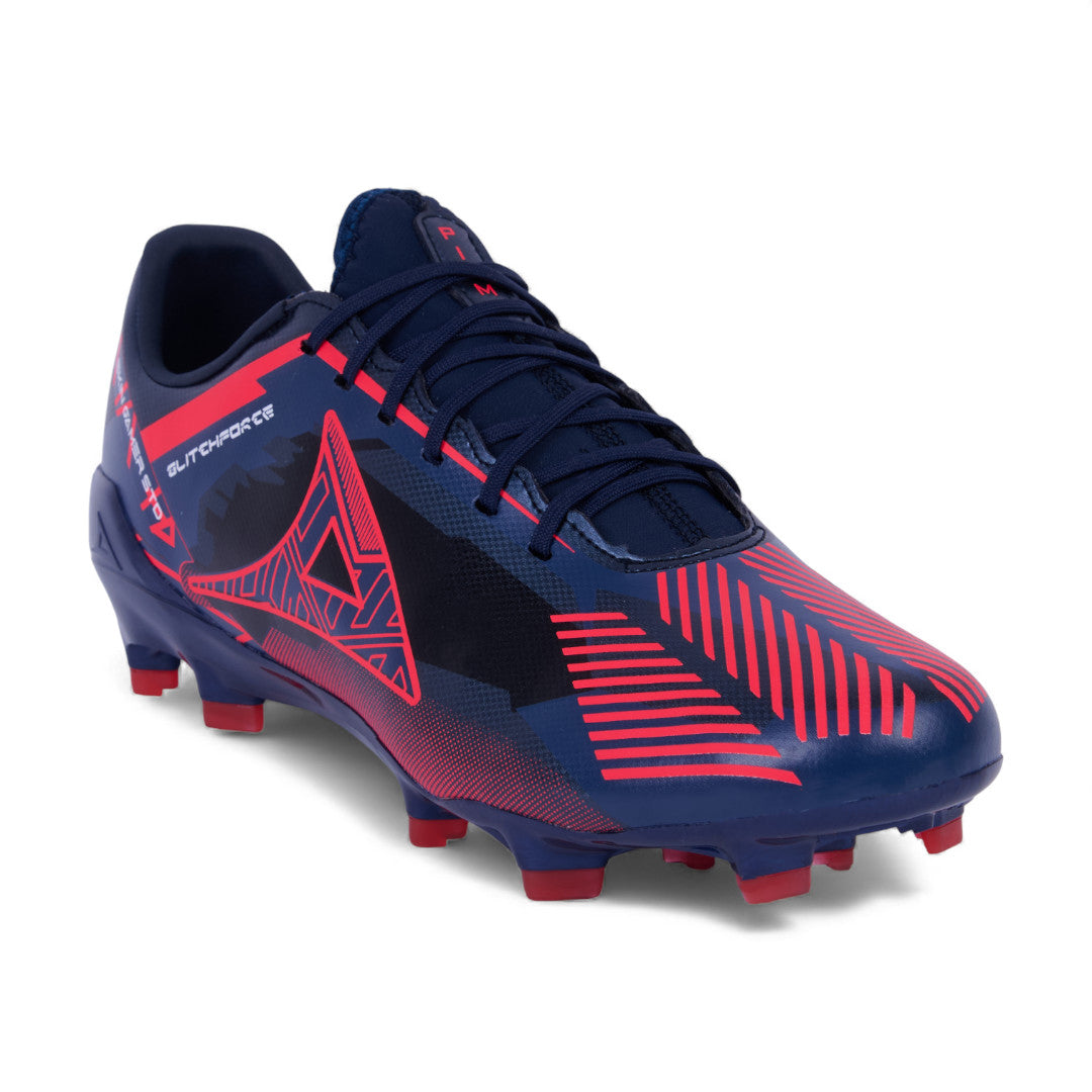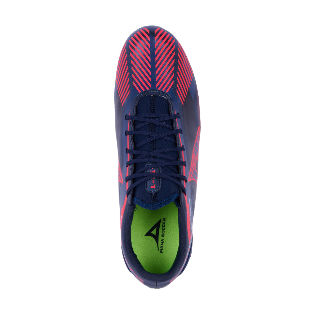 Tenis Pirma para soccer con tachones, combinación marino con rojo, cinta ajustable y suela diseñada para buen agarre en campo.