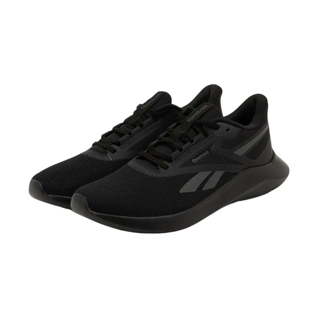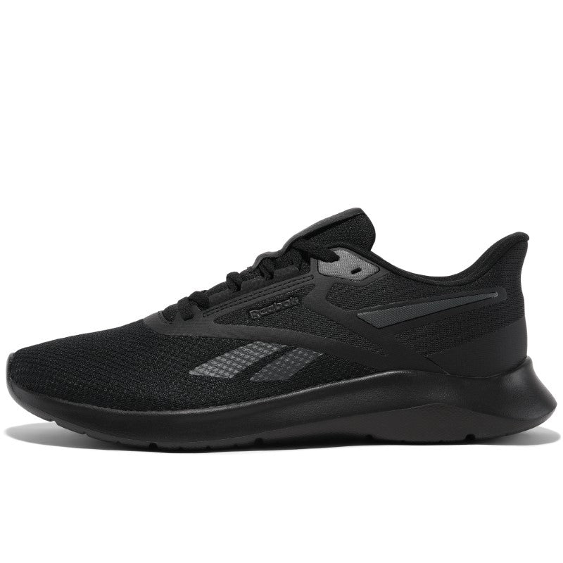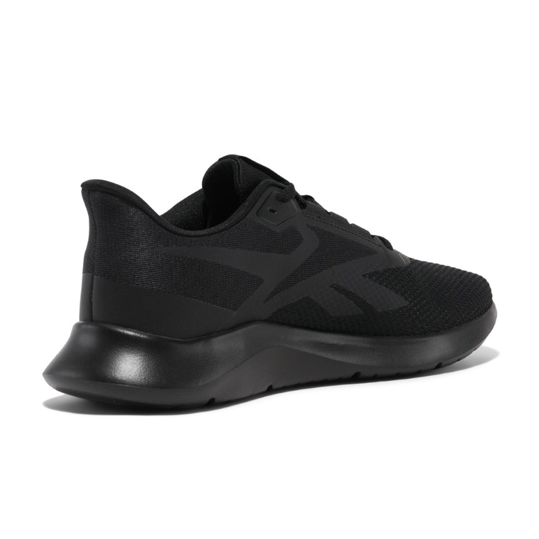 Tenis deportivo Reebok negro con malla transpirable, cintas ajustables y suela ligera; ideal para entrenamiento, caminata o uso diario gracias a su comodidad y frescura.