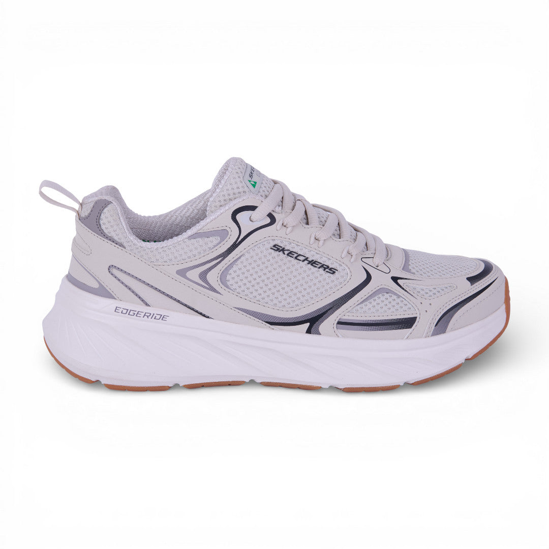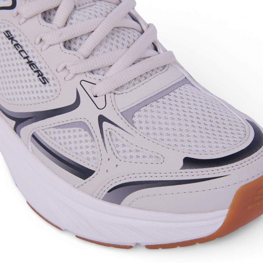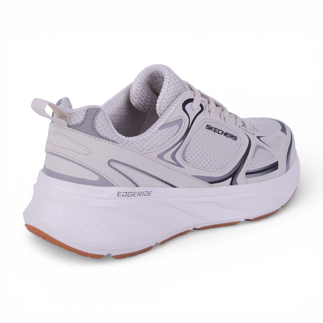 Tenis Skechers de color beige con plantilla interior de memory foam; detalle al contraste en corte, cintas ajustables con jalador posterior. Material: Textil/Sintético.