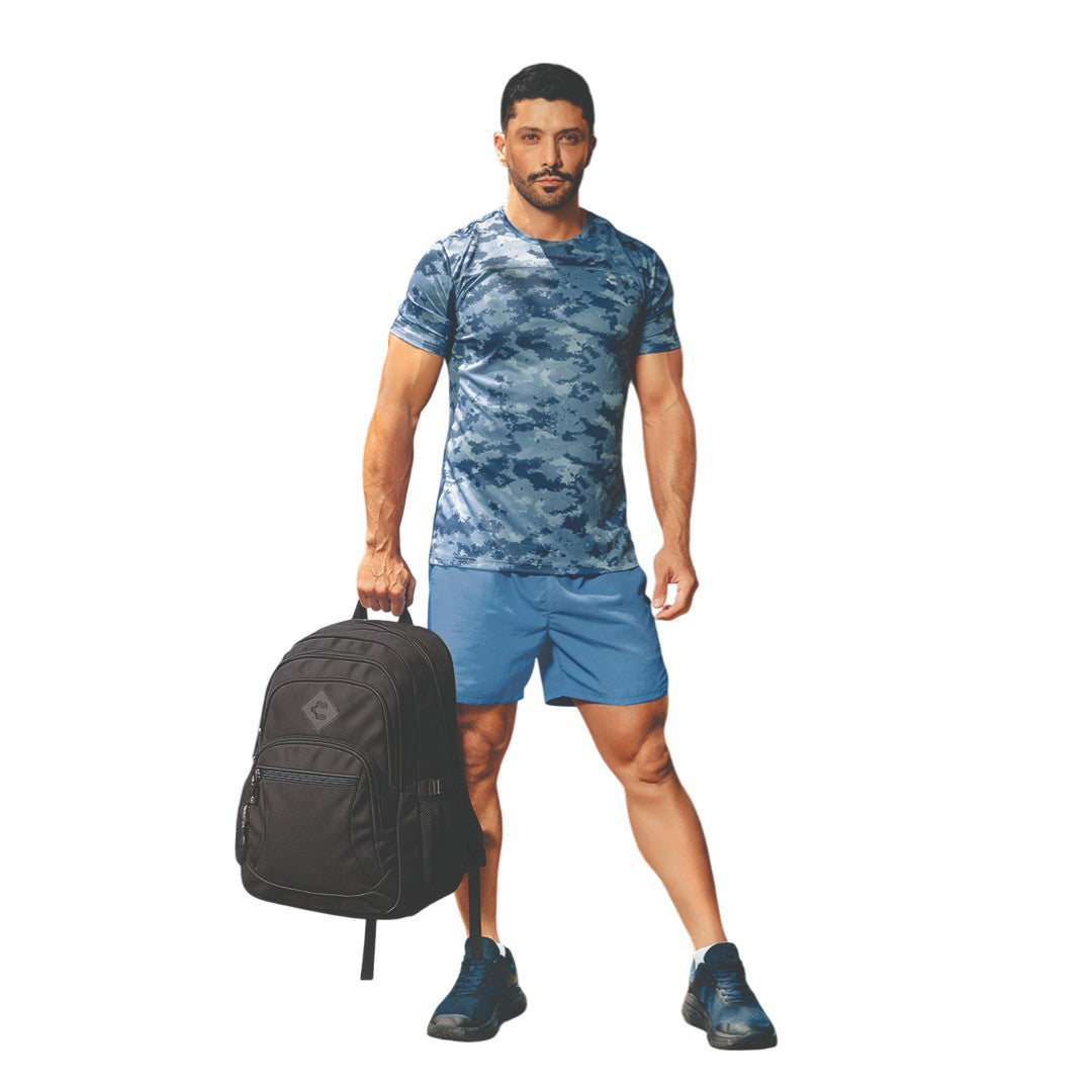 Short Charly azul para caballero con cintura elástica, detalle lateral de marca y tela ligera; ideal para entrenamientos, caminatas y uso diario con confort deportivo.
