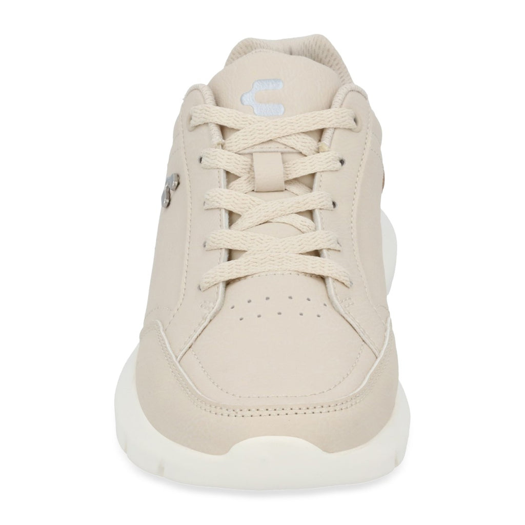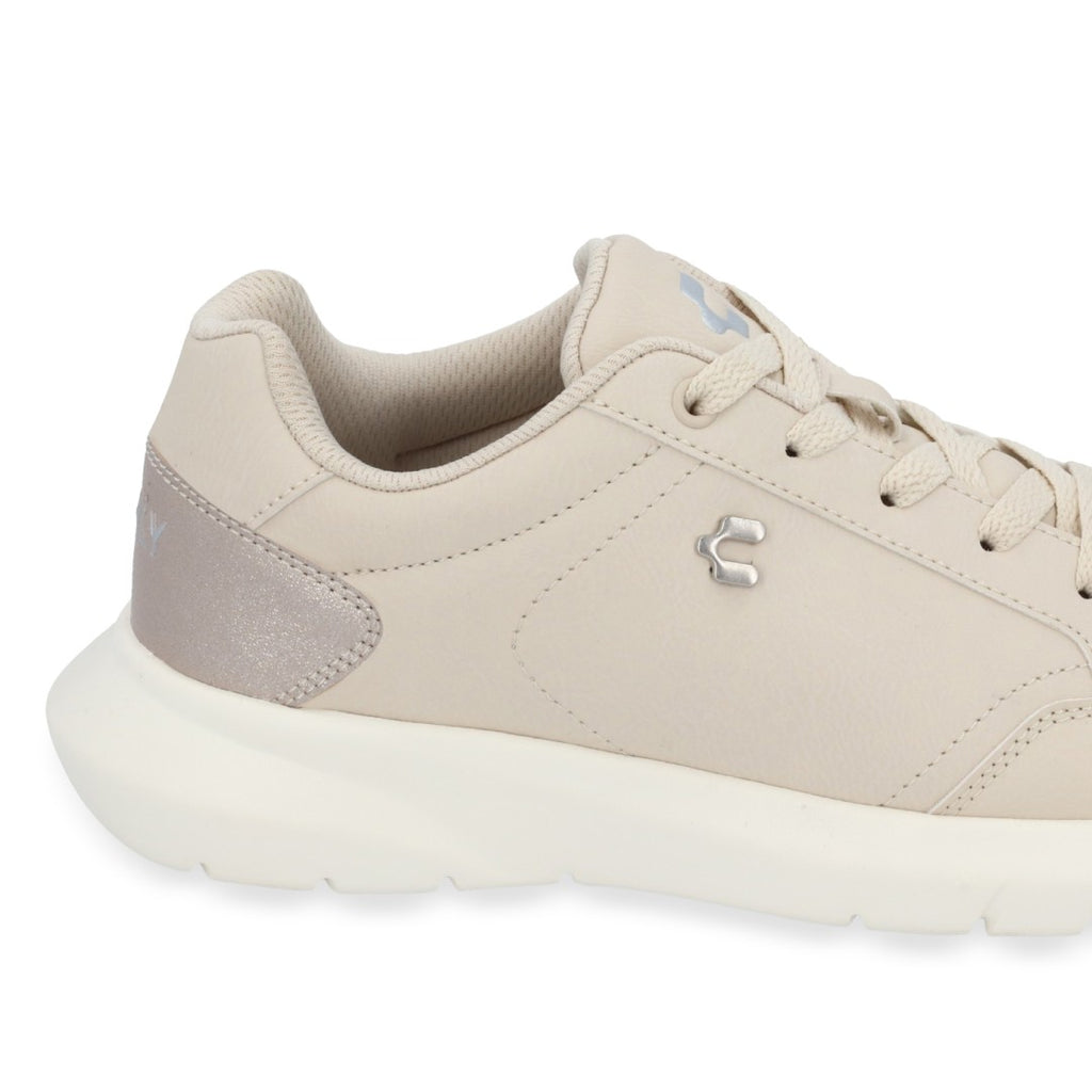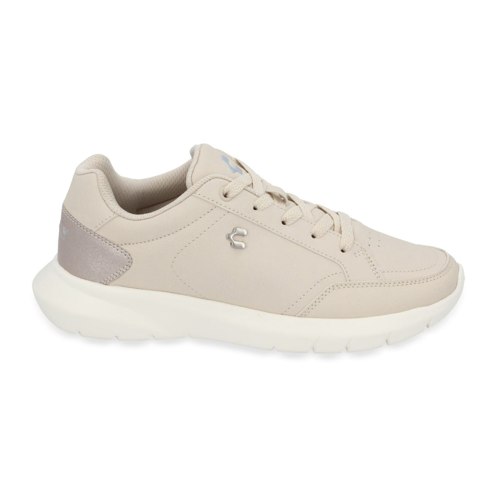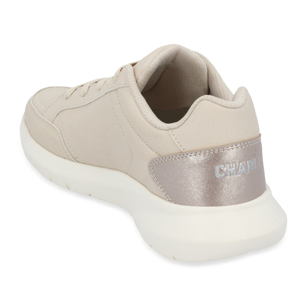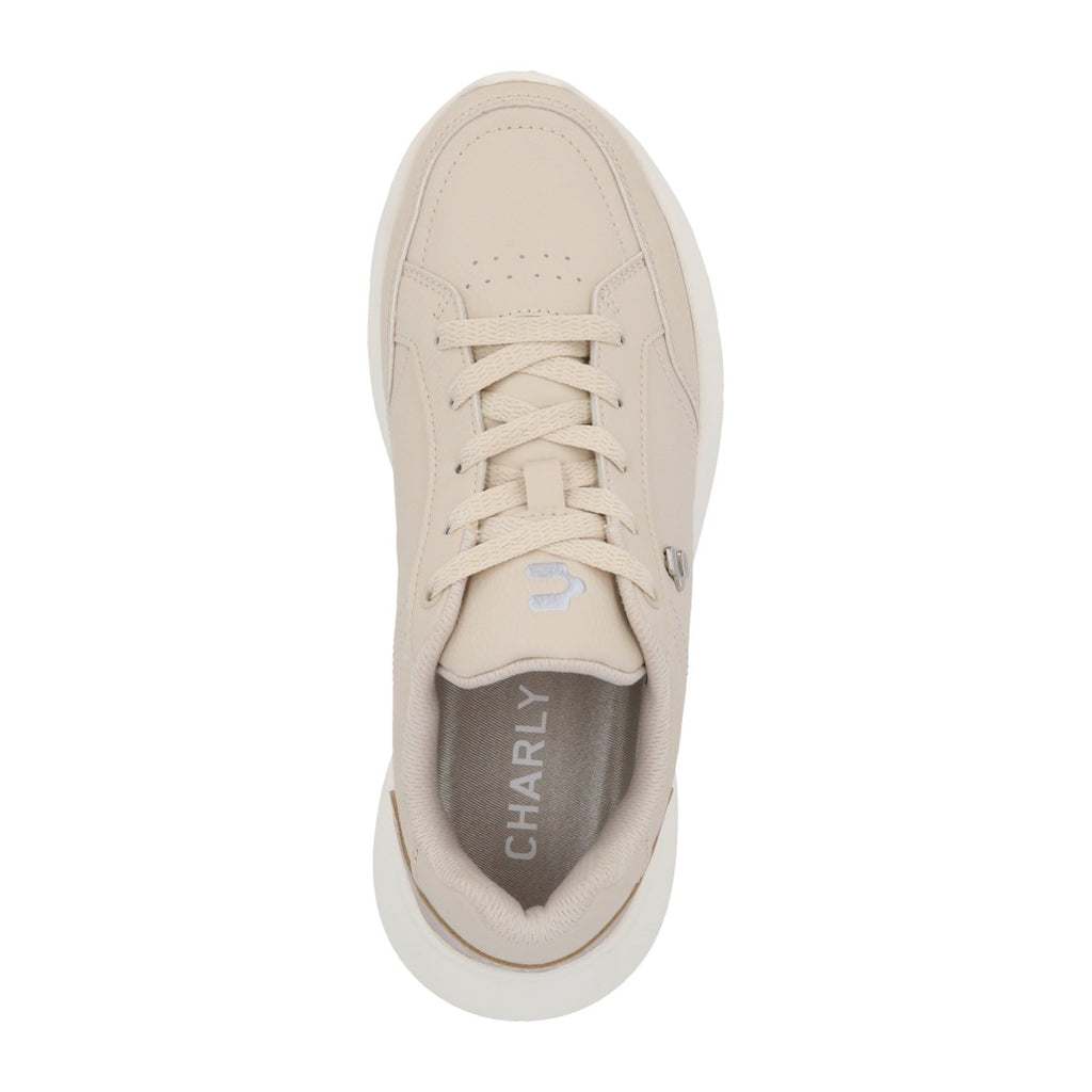 Tenis Charly de color beige acabado sintético, cinta ajustable con jalador posterior; detalle de logo de la marca metálico en lateral y en lengüeta con suela ligera antiderrapante.