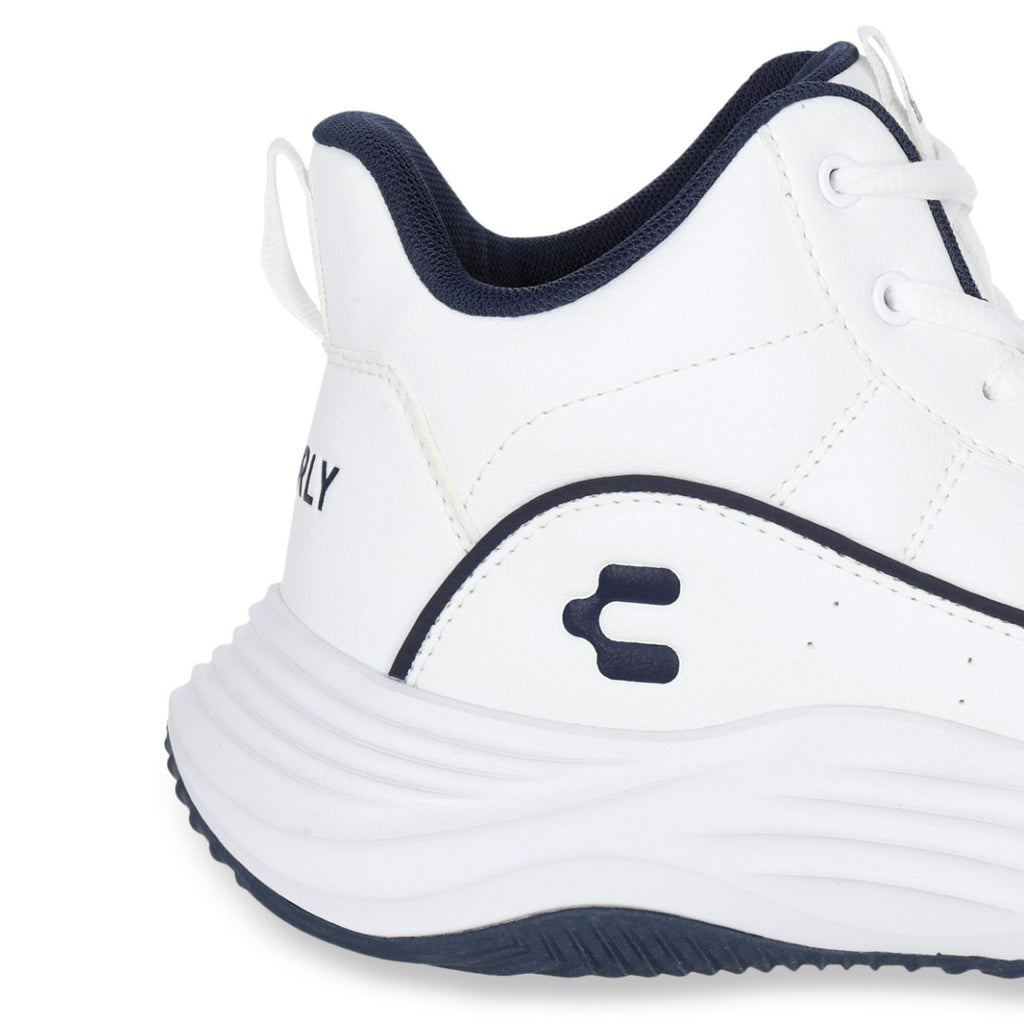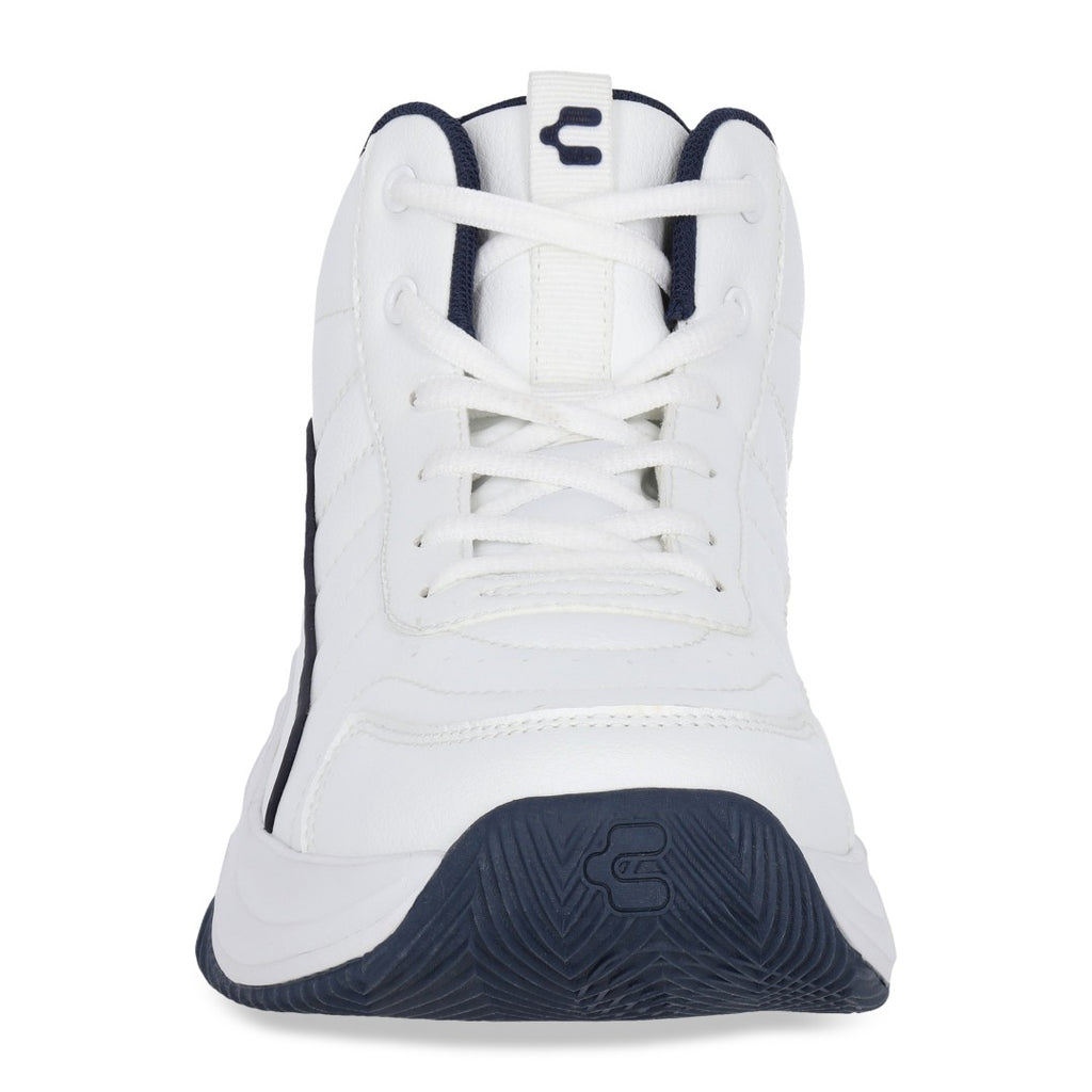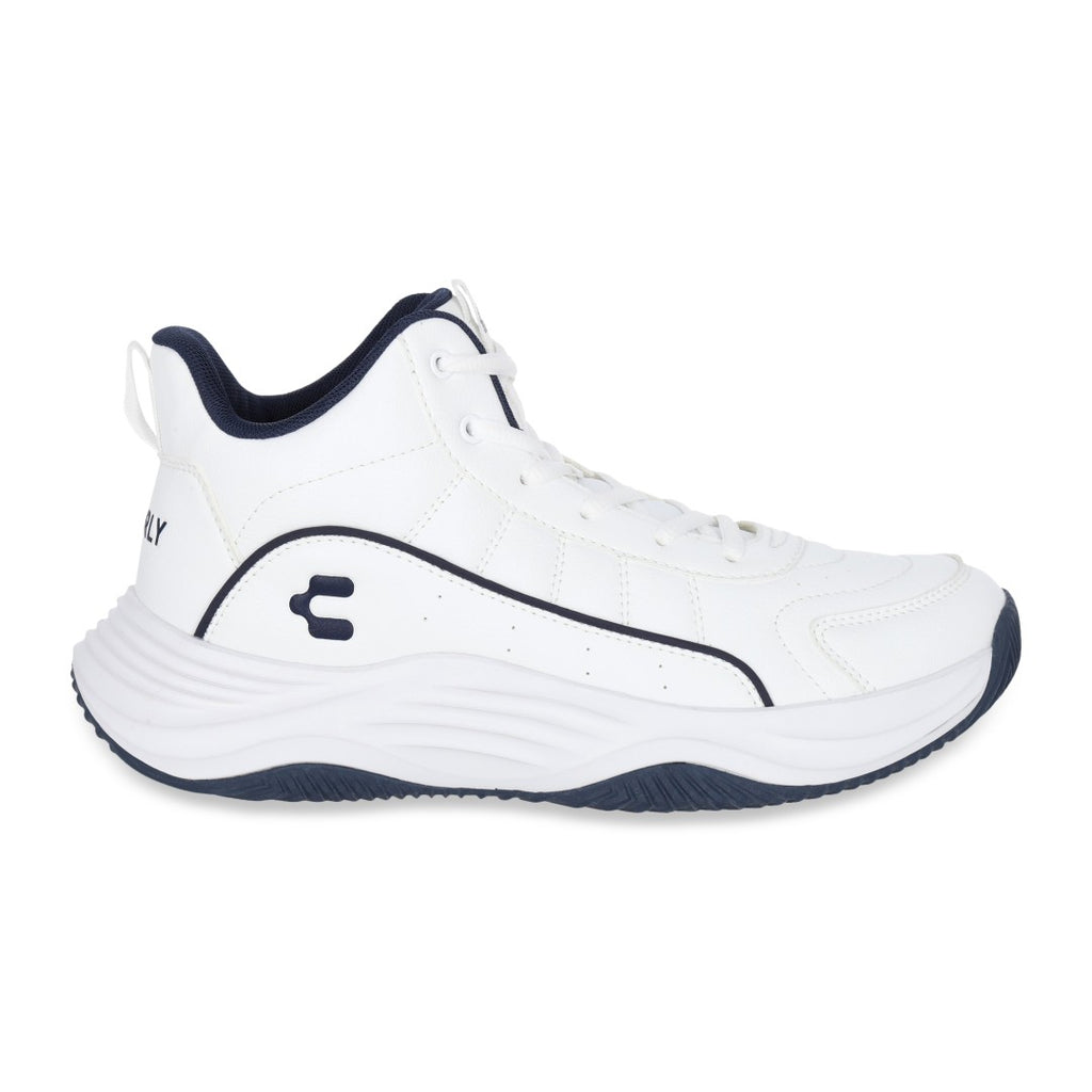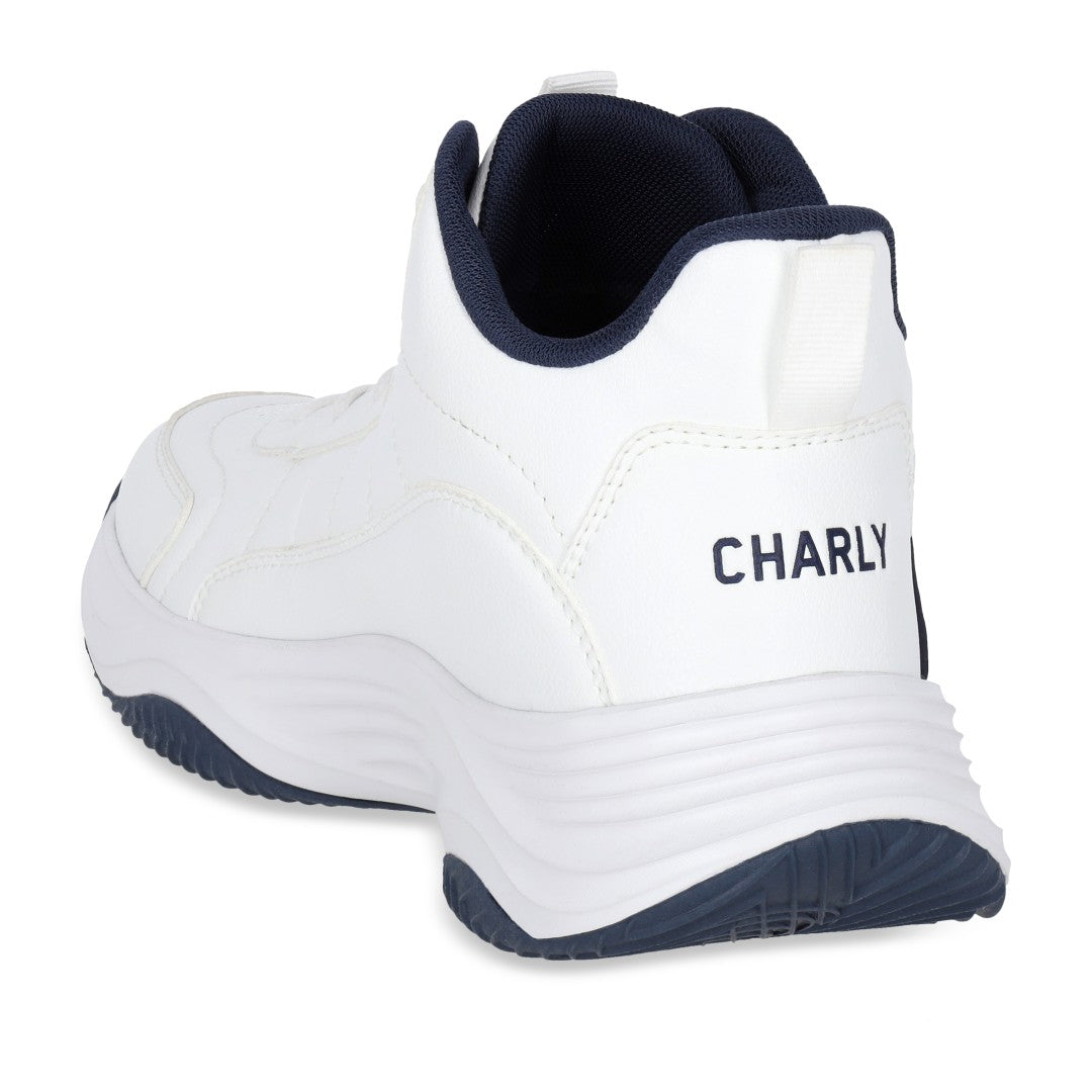 Tenis Charly tipo bota de color blanco ideal para básquetbol con malla transpirable y cinta ajustable con jalador posterior; detalle de logo de la marca en lateral y en lengüeta con suela ligera antiderrapante.