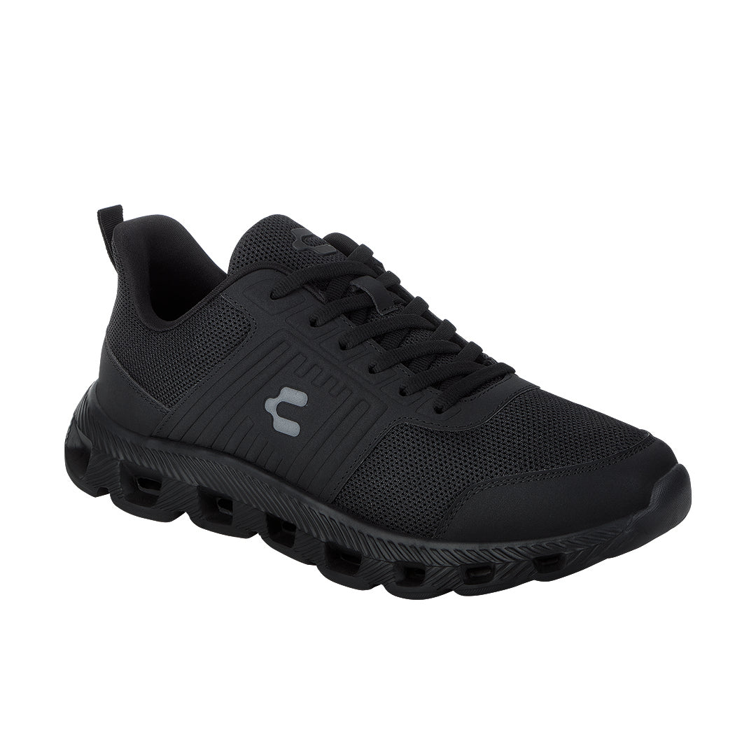 Tenis Charly de color negro con malla transpirable y cinta ajustable con jalador posterior; detalle de logo de la marca en lateral y en lengüeta con suela ligera antiderrapante. Material: Textil.