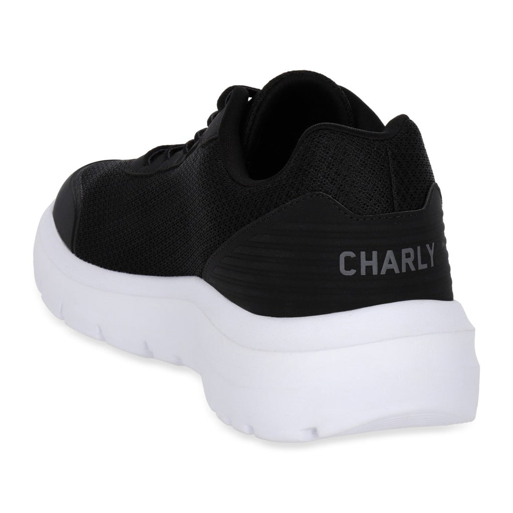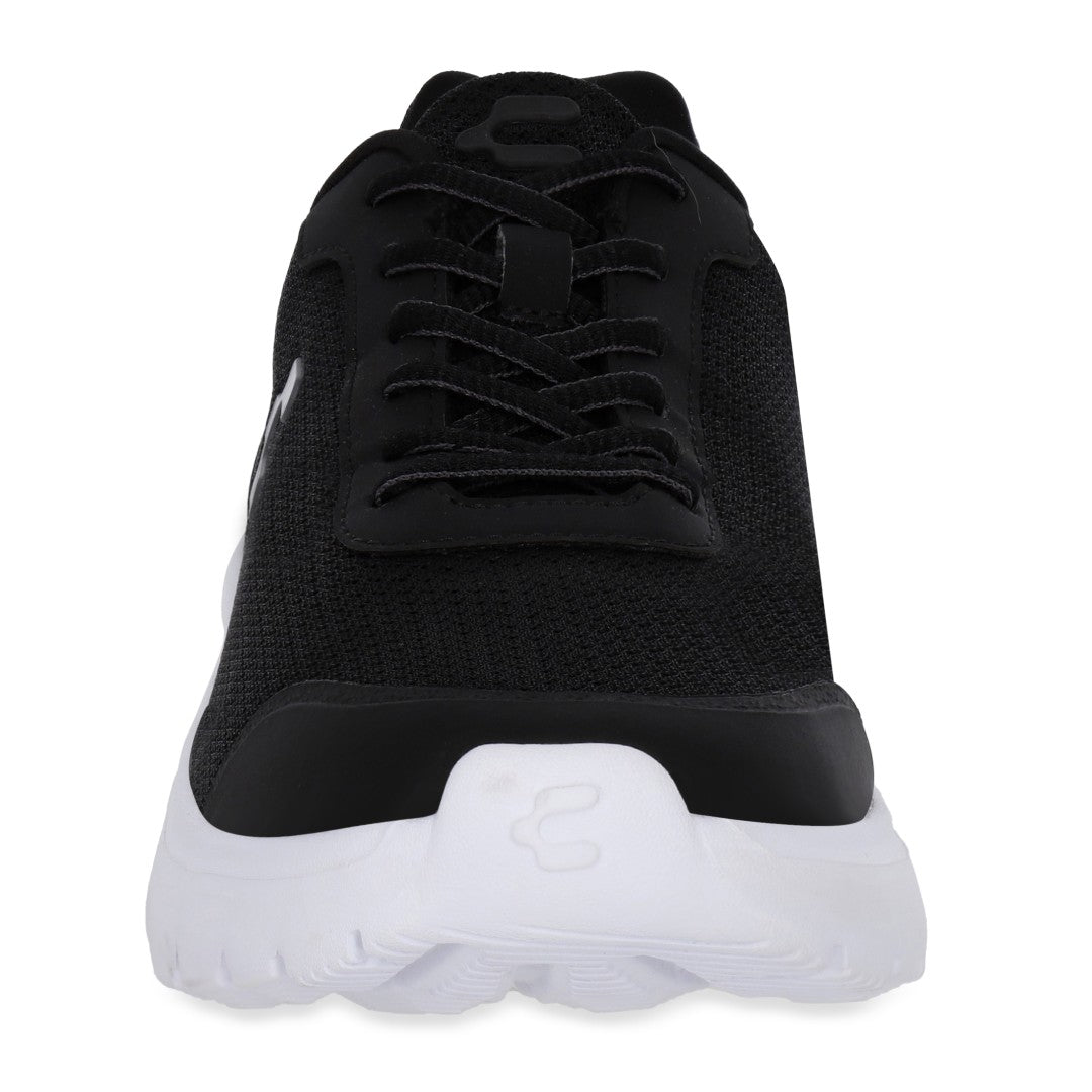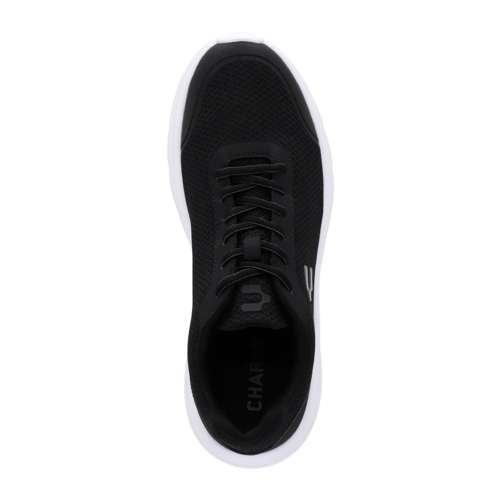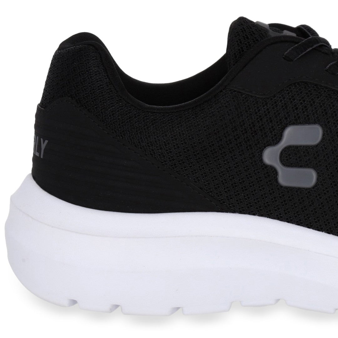 Tenis Charly de color negro con malla transpirable y cinta ajustable con jalador posterior; detalle de logo de la marca en lateral y en lengüeta con suela ligera antiderrapante. Material: Textil.