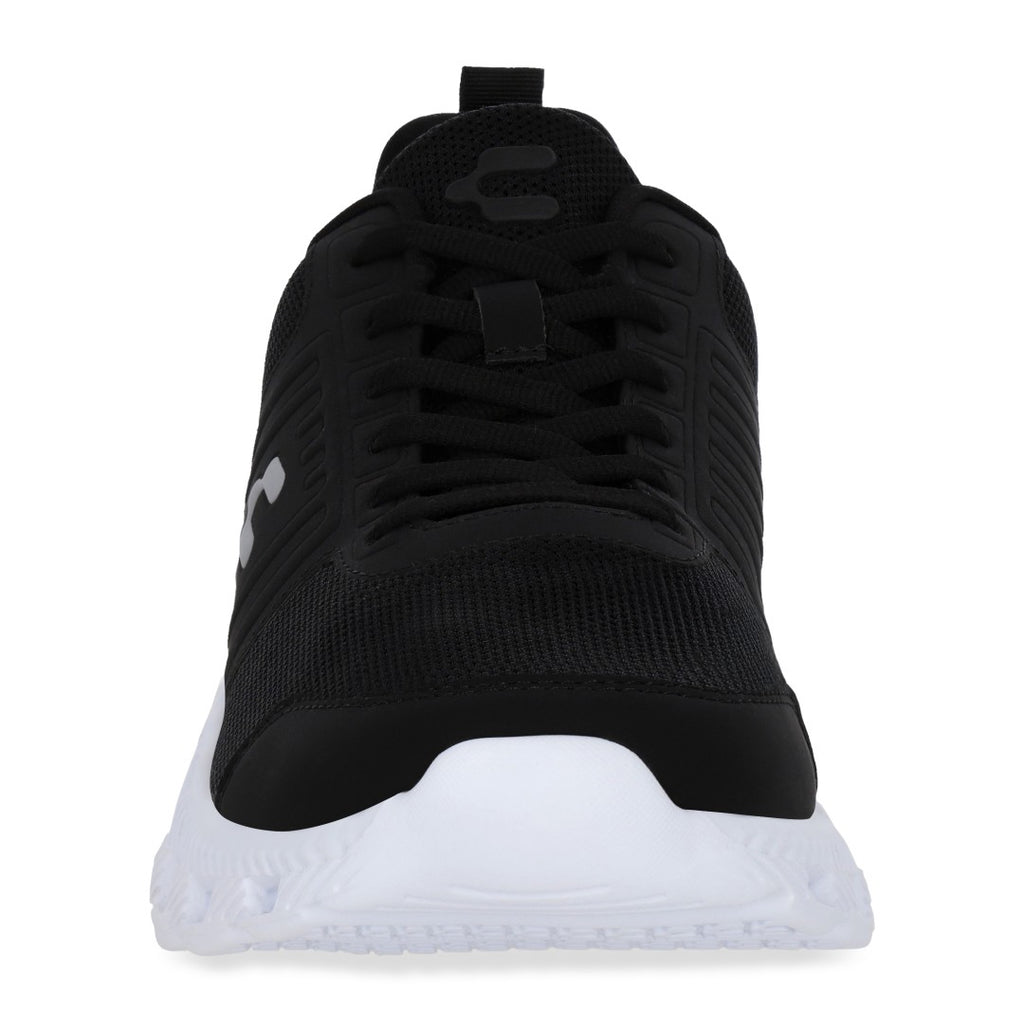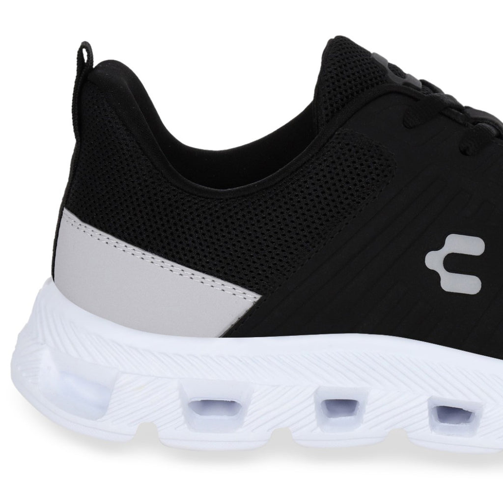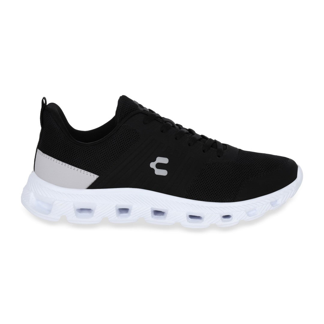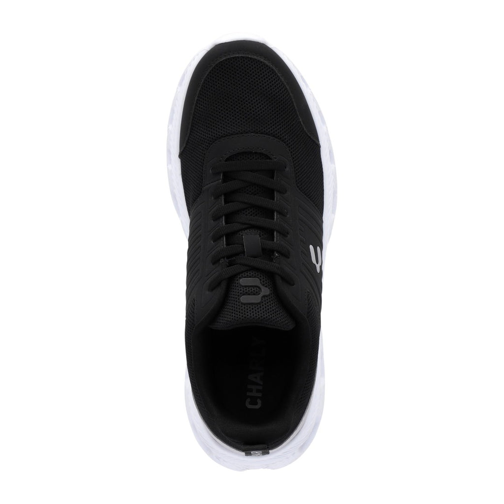 Tenis Charly de color negro con malla transpirable y cinta ajustable con jalador posterior; detalle de logo de la marca en lateral y en lengüeta con suela ligera antimpacto.