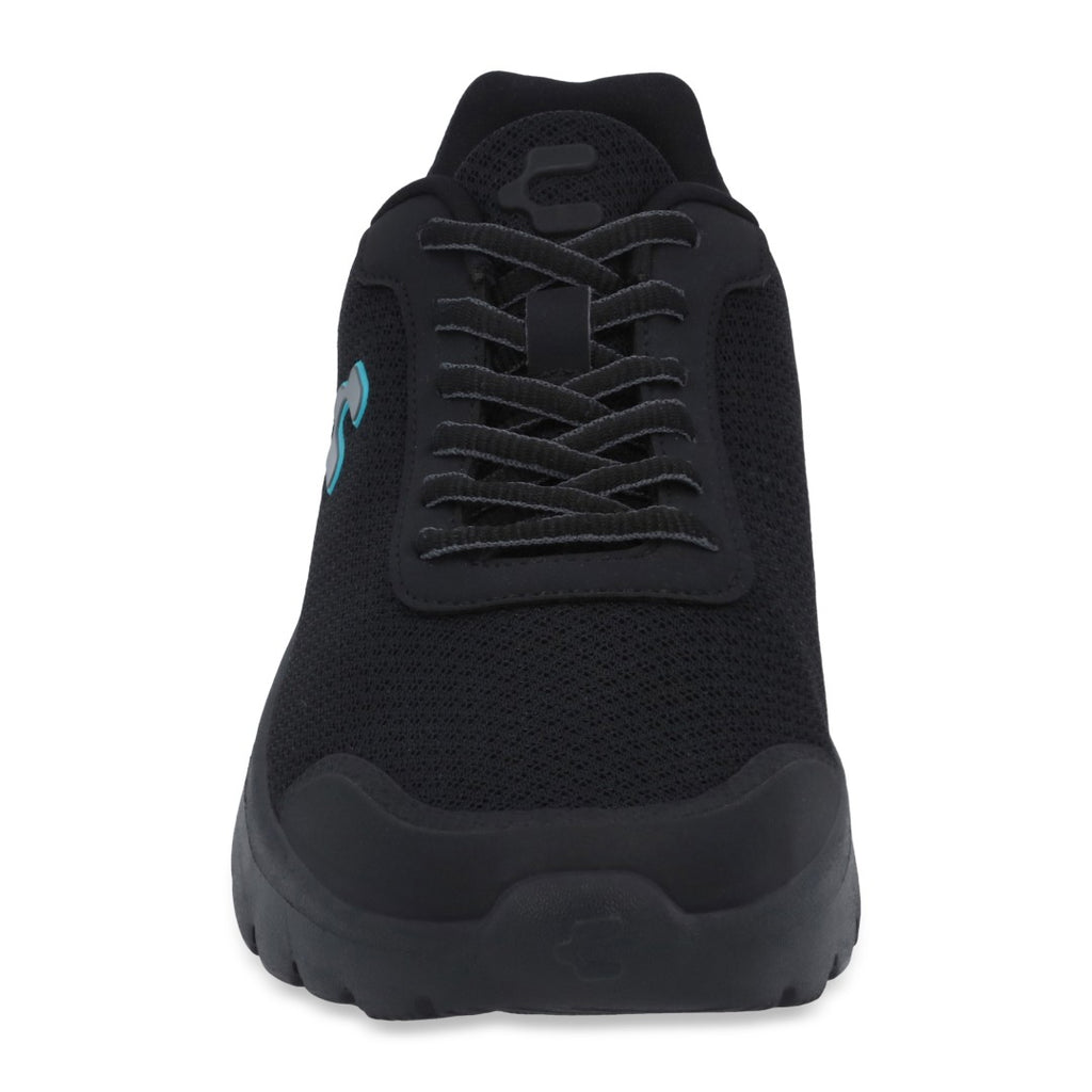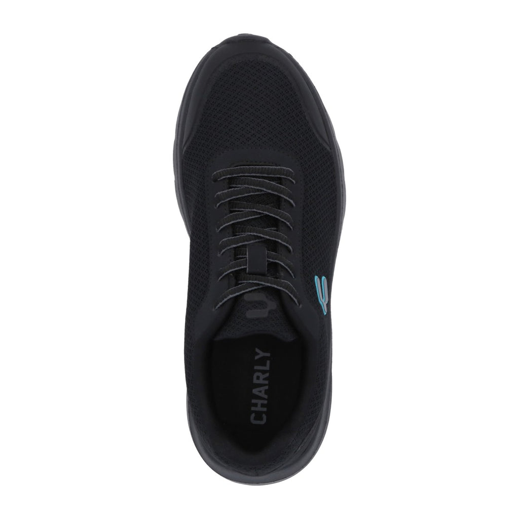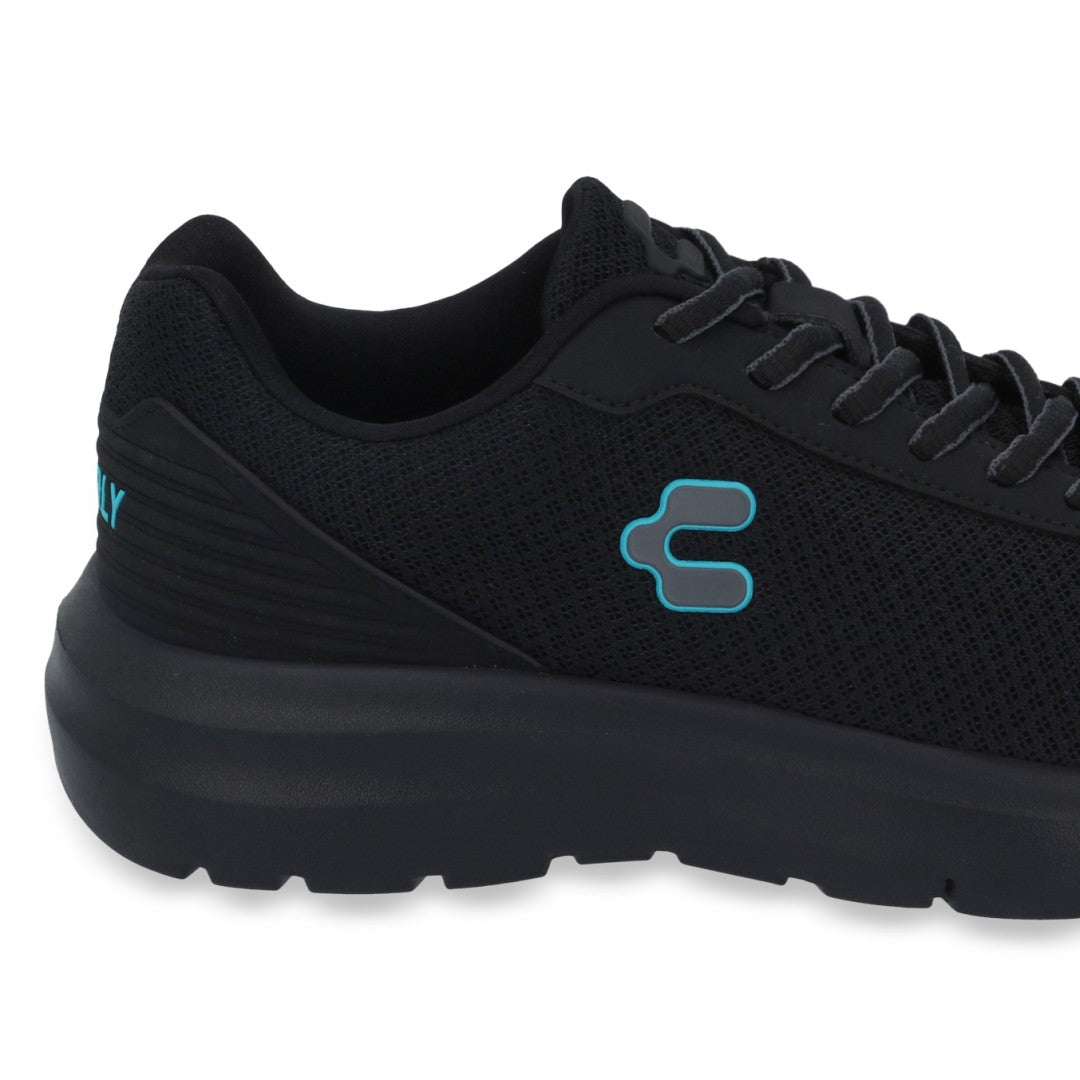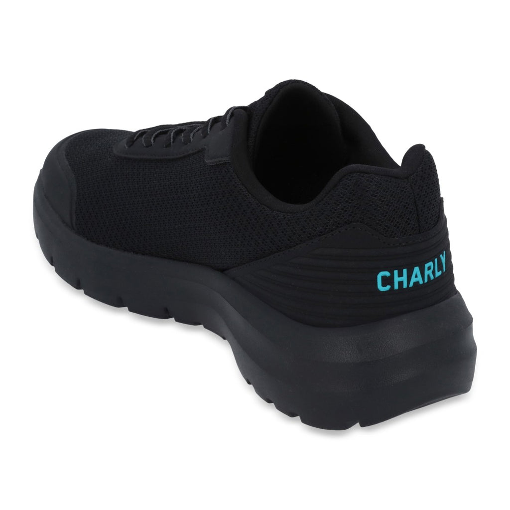 Tenis Charly de color negro con malla transpirable y cinta ajustable con jalador posterior; detalle de logo de la marca en lateral y en lengüeta con suela ligera antiderrapante.