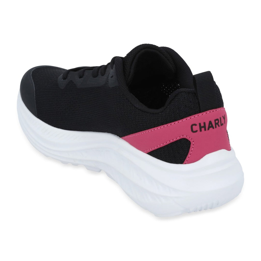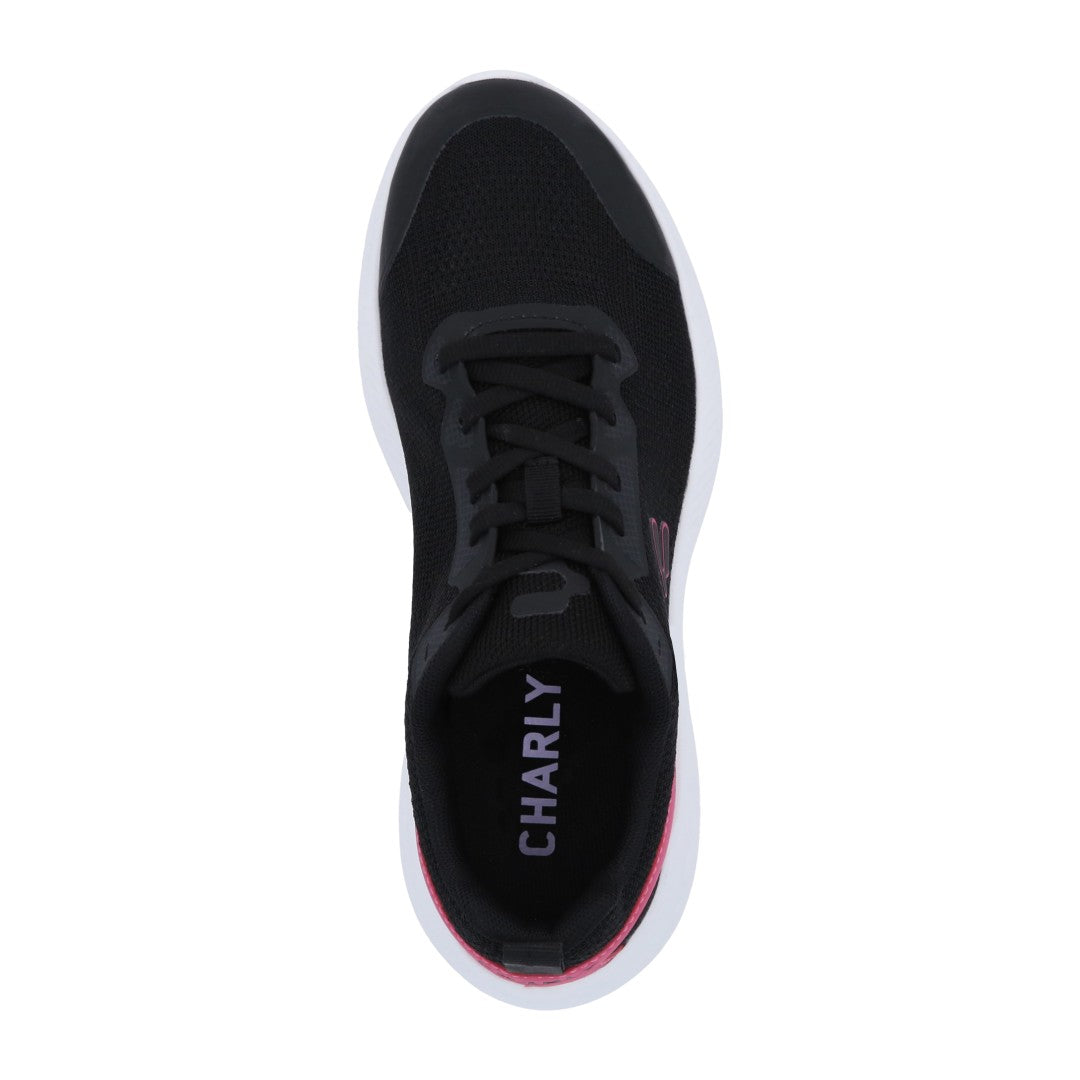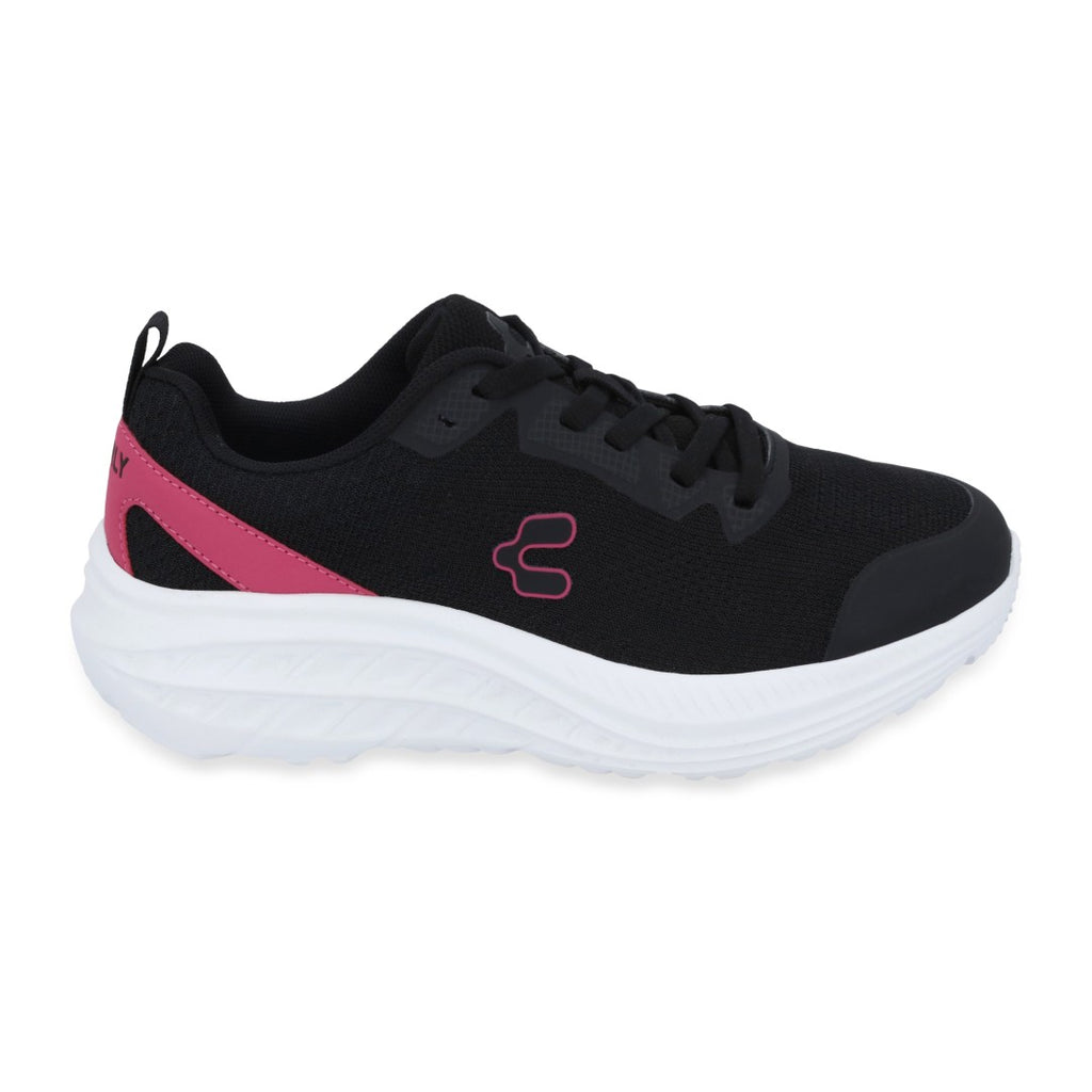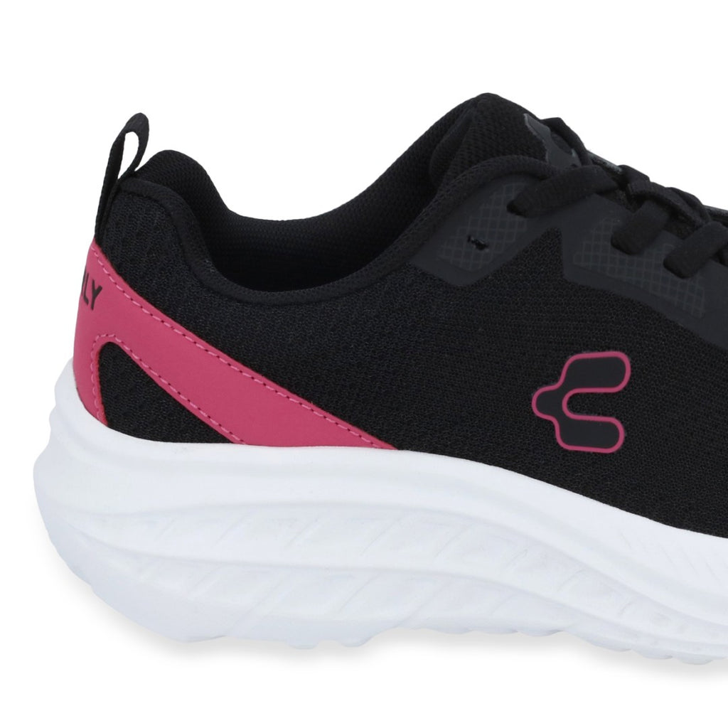 Tenis Charly de color negro con malla transpirable y cinta ajustable con jalador posterior; detalle de logo de la marca en lateral y en lengüeta con suela ligera antiderrapante.