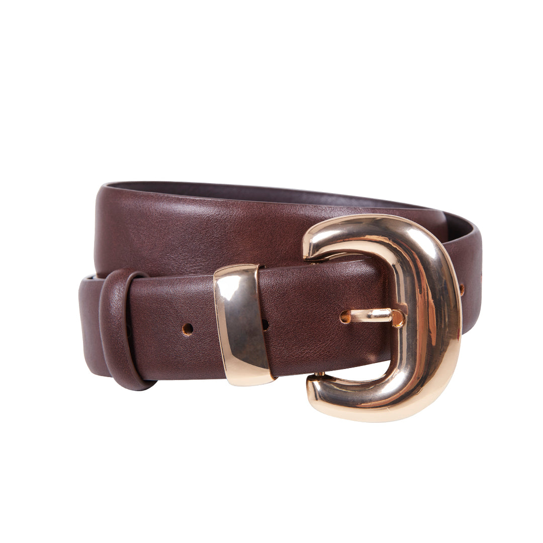 Cinturón café con hebilla redondeada dorada; clásico, combinable y perfecto para looks casuales o de oficina.