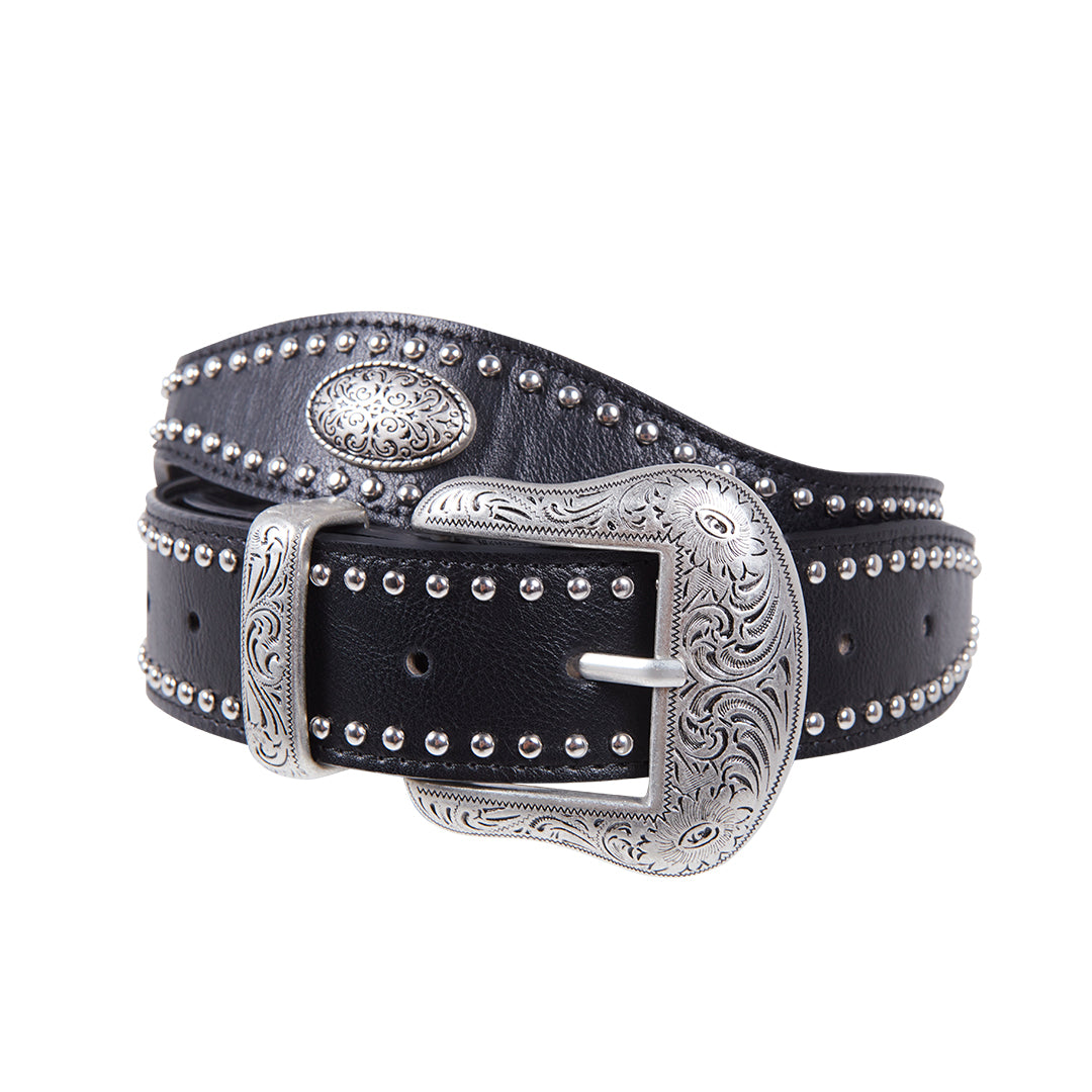 Cinturón negro con hebilla estilo vaquero en plata vieja, decorado con estoperoles y punta metálica; moderno, llamativo y perfecto para elevar cualquier outfit.