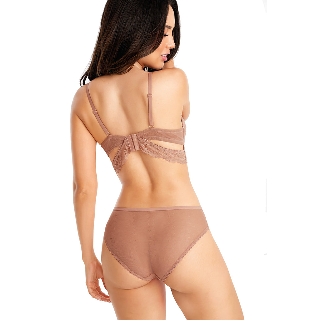 Brassiere nude de encaje y copa completa con push up; detalle de aberturas en costados de mesh y encaje elástico. Materiales: Poliamida/Elastano.