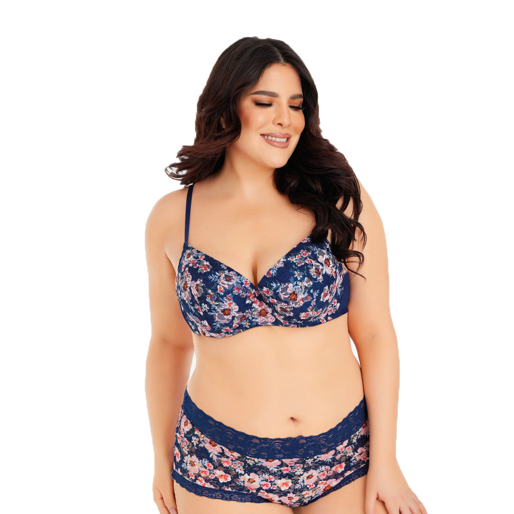 Brassiere multicolor de encaje con copa completa; costados de mesh y tirantes ajustables. Materiales: Poliamida/Elastano.