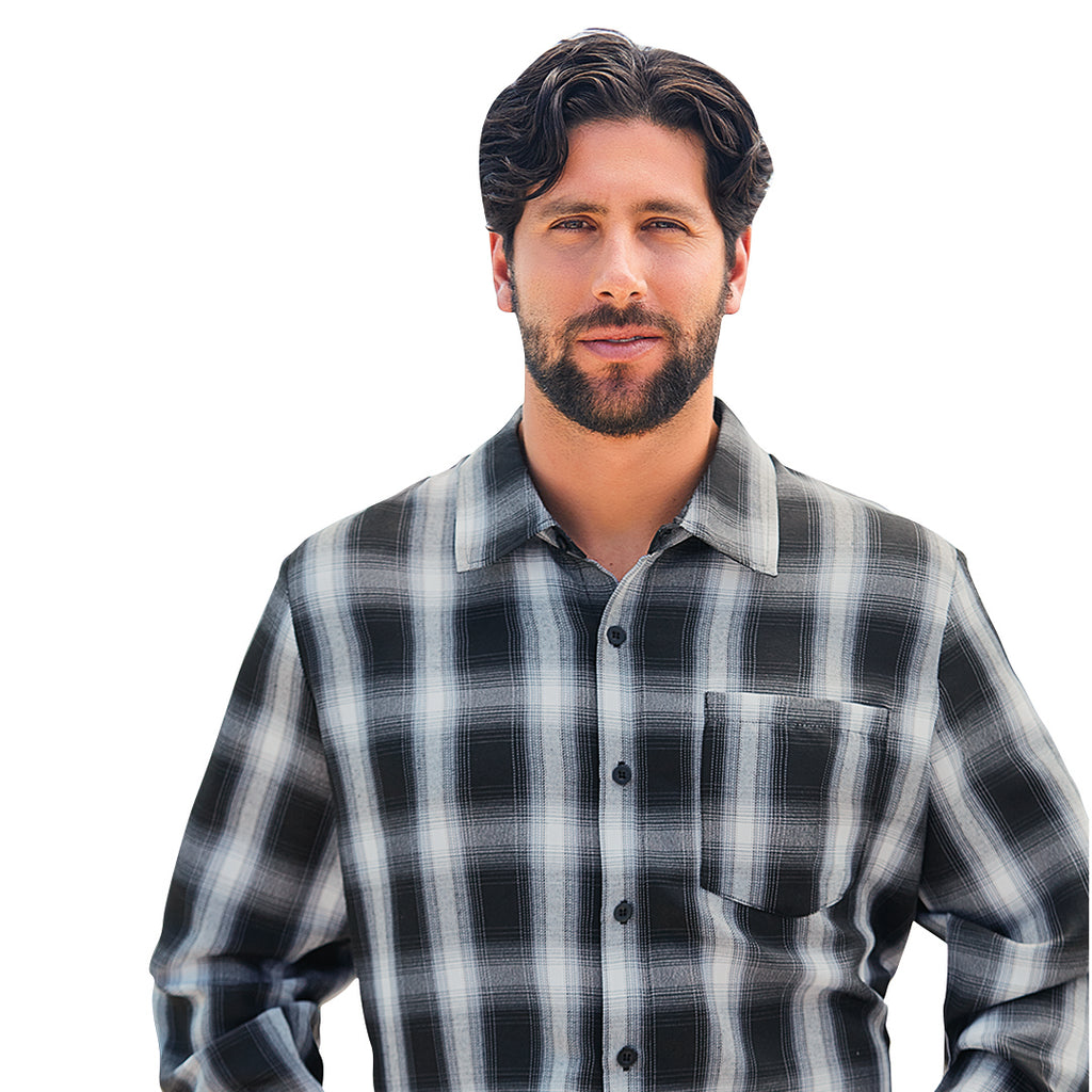 Camisa de manga larga, con cuello camisero en tela a cuadros.
