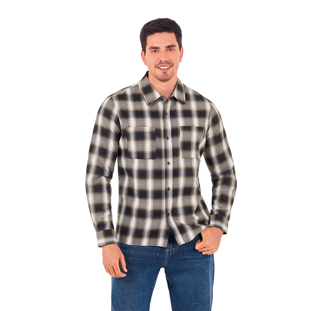 Camisa de manga larga, con cuello camisero, con tela a cuadros y bolsillos frontales.