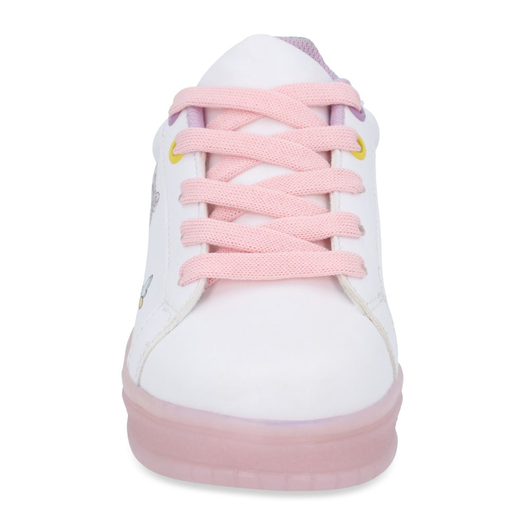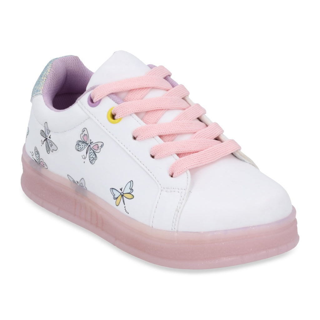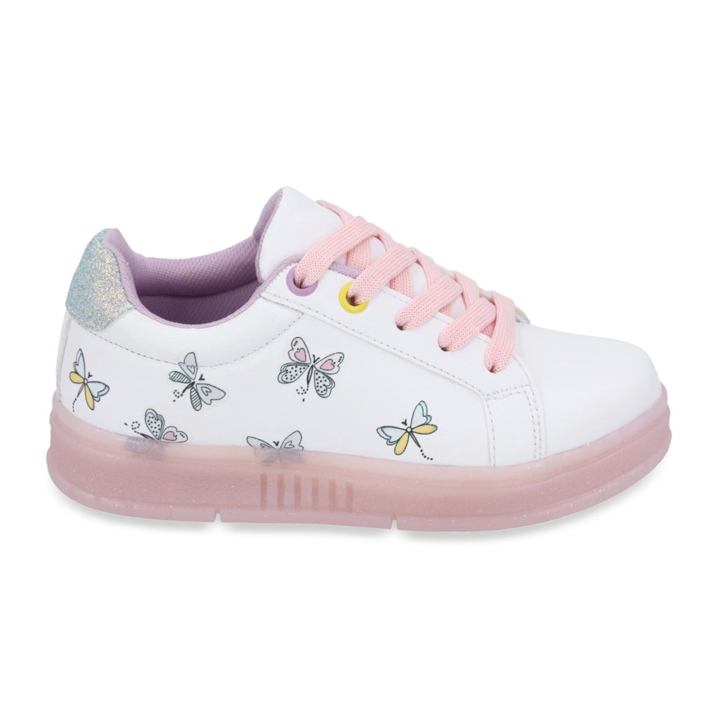 Dúo tenis casual color rosa, con detalle de flores y agujetas. Plantilla: Textil. Material: Sintético. Tenis casual color blanco, con estampado de mariposas y agujetas. Plantilla: Textil. Material: Sintético.