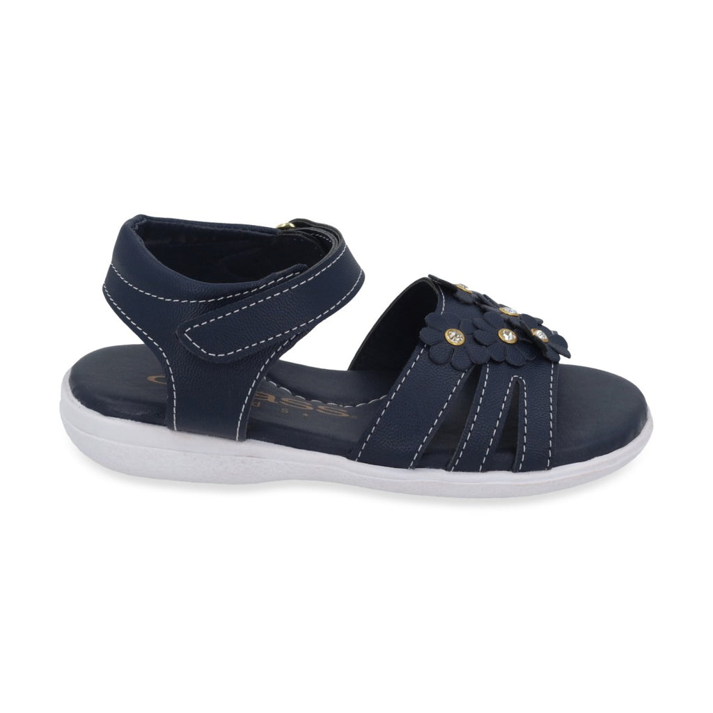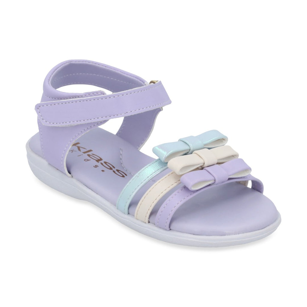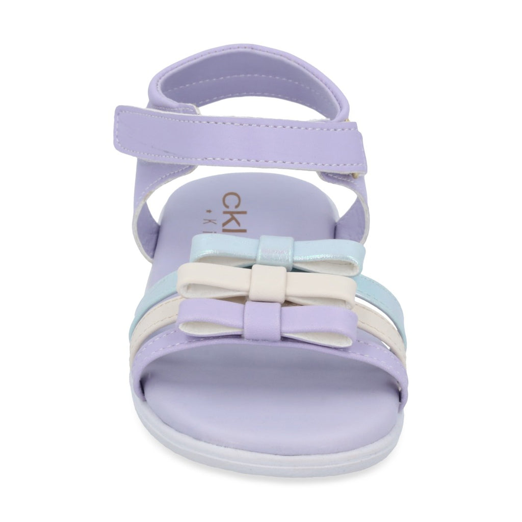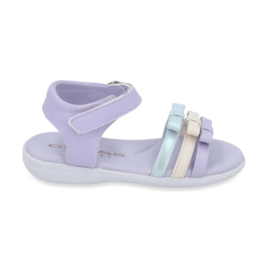 Dúo sandalia casual de piso color lila, detalle de moños, con contactel en pulsera. Sandalia casual de piso color marino, detalle de flores, con contactel en pulsera. Plantilla: Sintético. Material: Sintético.